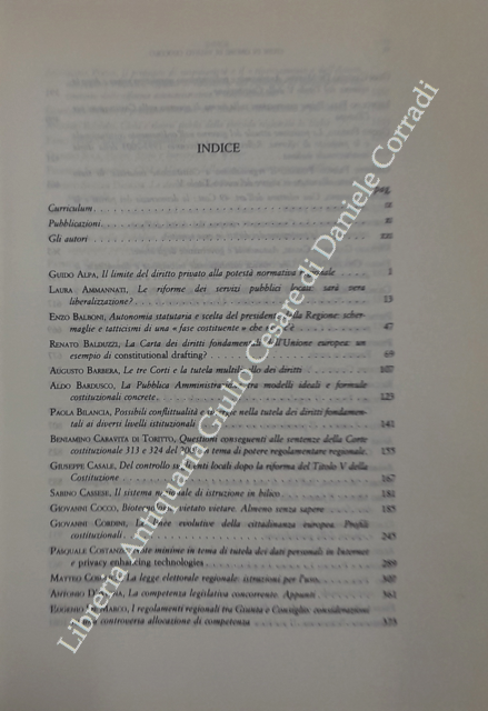 Scritti di: Alpa, Ammannati, Balboni, Balduzzi, Barbera, Bardusco, Bilancia, Caravita di Toritto, Casale, Cassese, Cocco, Cordini, Costanzo, Cosulich, D'Atena, De Marco, De Martin, Elia, Ferrara, Ferrari, Gambino, Gardino, Gasparini Casari, Giocoli Nacci, Grasso, Grossi, Guarino, Guastini, Italia, Labriola, Lazzarino del Grosso, Manzella, Mattioni, Merusi, Mignone, Pace, Parodi, Piergiovanni, Pizzetti, Pizzorusso, Poggi, Rolla, Ruggeri, Severi, Sola Sorrentino, Sticchi Damiani, Uckmar, Verardo, Vipiana, Visintini, Zampetti