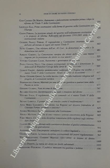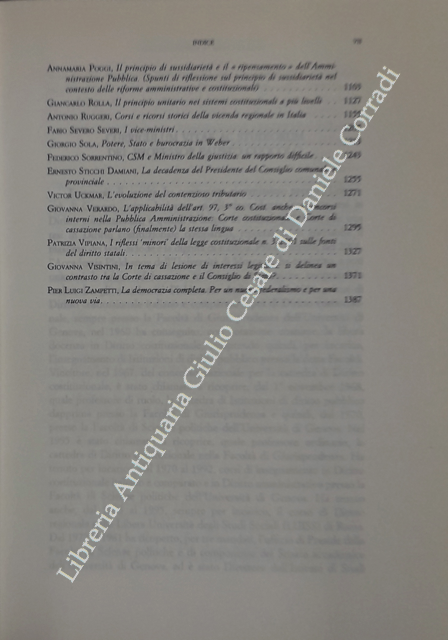 Scritti di: Alpa, Ammannati, Balboni, Balduzzi, Barbera, Bardusco, Bilancia, Caravita di Toritto, Casale, Cassese, Cocco, Cordini, Costanzo, Cosulich, D’Atena, De Marco, De Martin, Elia, Ferrara, Ferrari, Gambino, Gardino, Gasparini Casari, Giocoli Nacci, Grasso, Grossi, Guarino, Guastini, Italia, Labriola, Lazzarino del Grosso, Manzella, Mattioni, Merusi, Mignone, Pace, Parodi, Piergiovanni, Pizzetti, Pizzorusso, Poggi, Rolla, Ruggeri, Severi, Sola Sorrentino, Sticchi Damiani, Uckmar, Verardo, Vipiana, Visintini, Zampetti