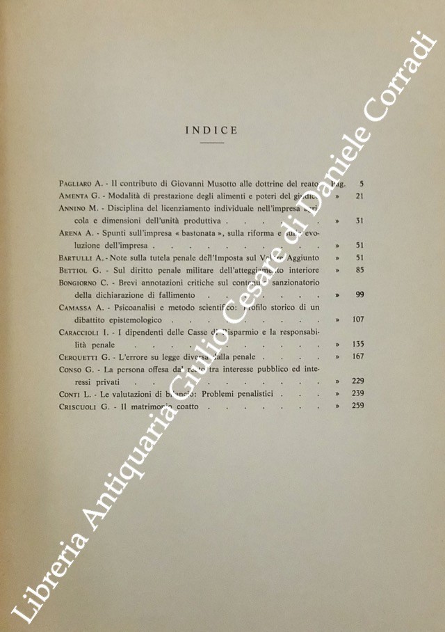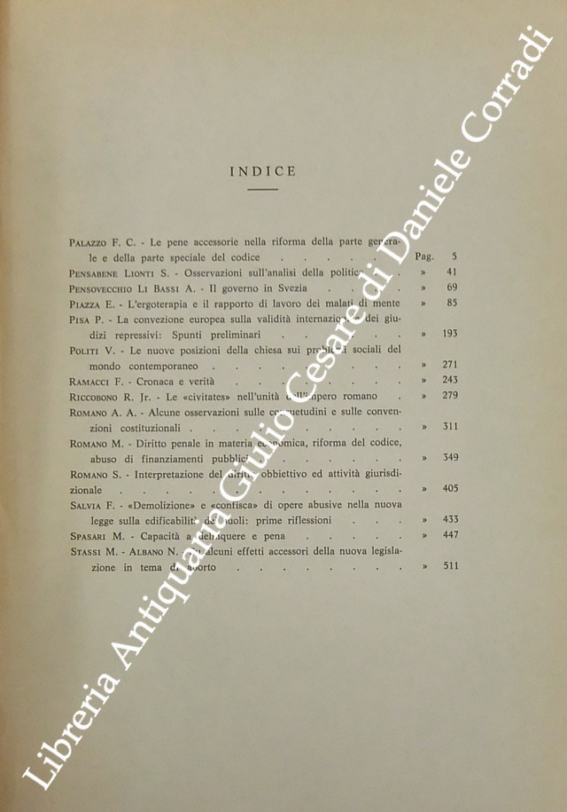 Scritti di: Albanese B., Albano N., Amenta G., Annino M., Ardizzone S., Arena A., Bartulli A., Bettiol G., Bongiorno C., Camassa A., Caraccioli I., Cerquetti G., Chiavario M., Conso G., Cortese W., Conti L., Criscuoli G., Da Costa J.P., Dell'Oglio R., Dentici G., Fiandaca G., Galasso A., Galati A., Gallo E., Garilli A., Gianniti F., Grosso C.F., Guarneri G., Leone F., Leone M., Malinverni A., Mangano P., Mantovani F., Marini G., Marrone M., Monteleone G.A., Morselli E., Nirchio G., Noto N., Nuvolone P., Pagliaro A., Palazzo A., Palazzo F.C., Pensabene Lionti S., Pensovecchio Li Bassi A., Piazza E., Pisa P., Politi V., Quattrocchi U., Ramacci F., Riccobono jr R., Romano A.A., Romano M., Romano S., Salvia F., Spasari M., Stassi M., Stile A.M., Teresi F., Tesoriere G., Tommasi Di Vignano A., Tortorici M.R., Tranchina G., Vancheri E.M., Vassalli G., Verga G., Villa V., Viola F., Virga P.