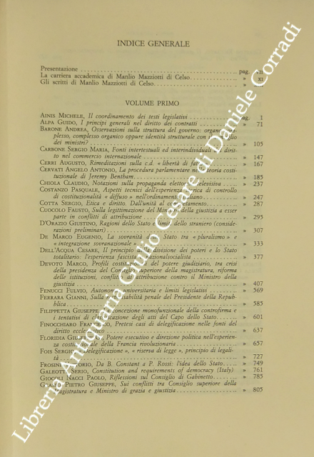 Scritti di: Ainis, Alpa, Barone, Carbone, Cerri, Cervati, Chiola, Costanzo, Cotta, Cuocolo, D'Orazio, De Marco, Dell'Acqua, Devoto, Fenucci, Ferrara, Filippetta, Finocchiaro, Floridia, Fois, Frosini, Galeotti, Giocoli, Grasso, Guastini, Labriola, Lanchester, Lo Castro, Luciani, Martines, Modugno, Montesano, Morbidelli, Nocilla, Oppo, Pace, Paladin, Pinelli, Rescigno, Ridola, Rimoli, Rolla, Romboli, Ruggeri, Salerno, Schefold, Sorrentino, Spinelli, Talamanca, Teresi