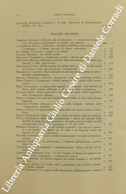 Scritti di: Ainis, Alpa, Barone, Carbone, Cerri, Cervati, Chiola, Costanzo, Cotta, Cuocolo, D’Orazio, De Marco, Dell’Acqua, Devoto, Fenucci, Ferrara, Filippetta, Finocchiaro, Floridia, Fois, Frosini, Galeotti, Giocoli, Grasso, Guastini, Labriola, Lanchester, Lo Castro, Luciani, Martines, Modugno, Montesano, Morbidelli, Nocilla, Oppo, Pace, Paladin, Pinelli, Rescigno, Ridola, Rimoli, Rolla, Romboli, Ruggeri, Salerno, Schefold, Sorrentino, Spinelli, Talamanca, Teresi