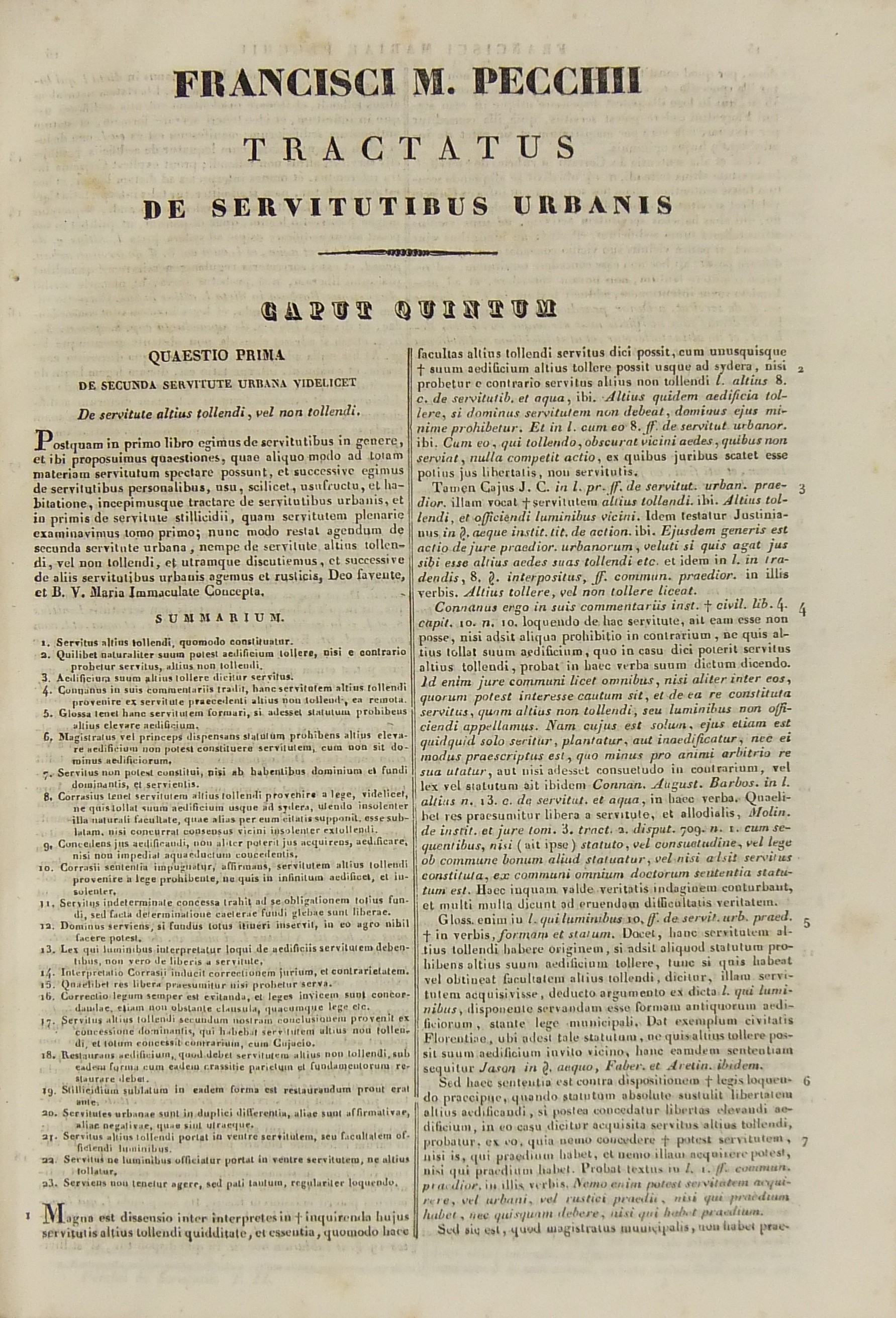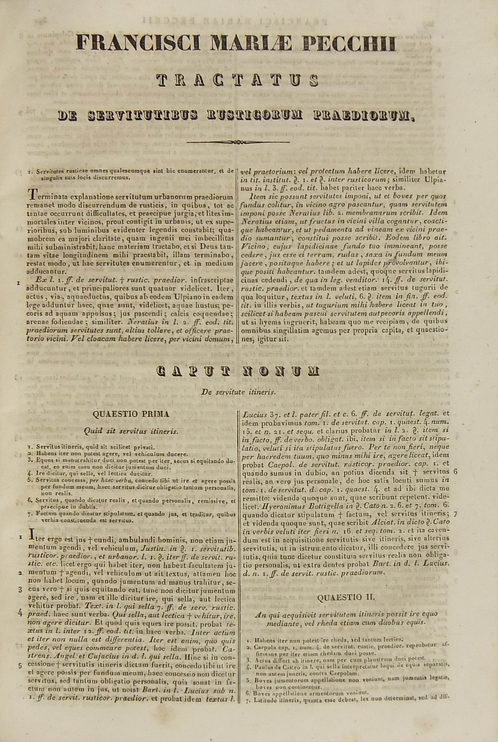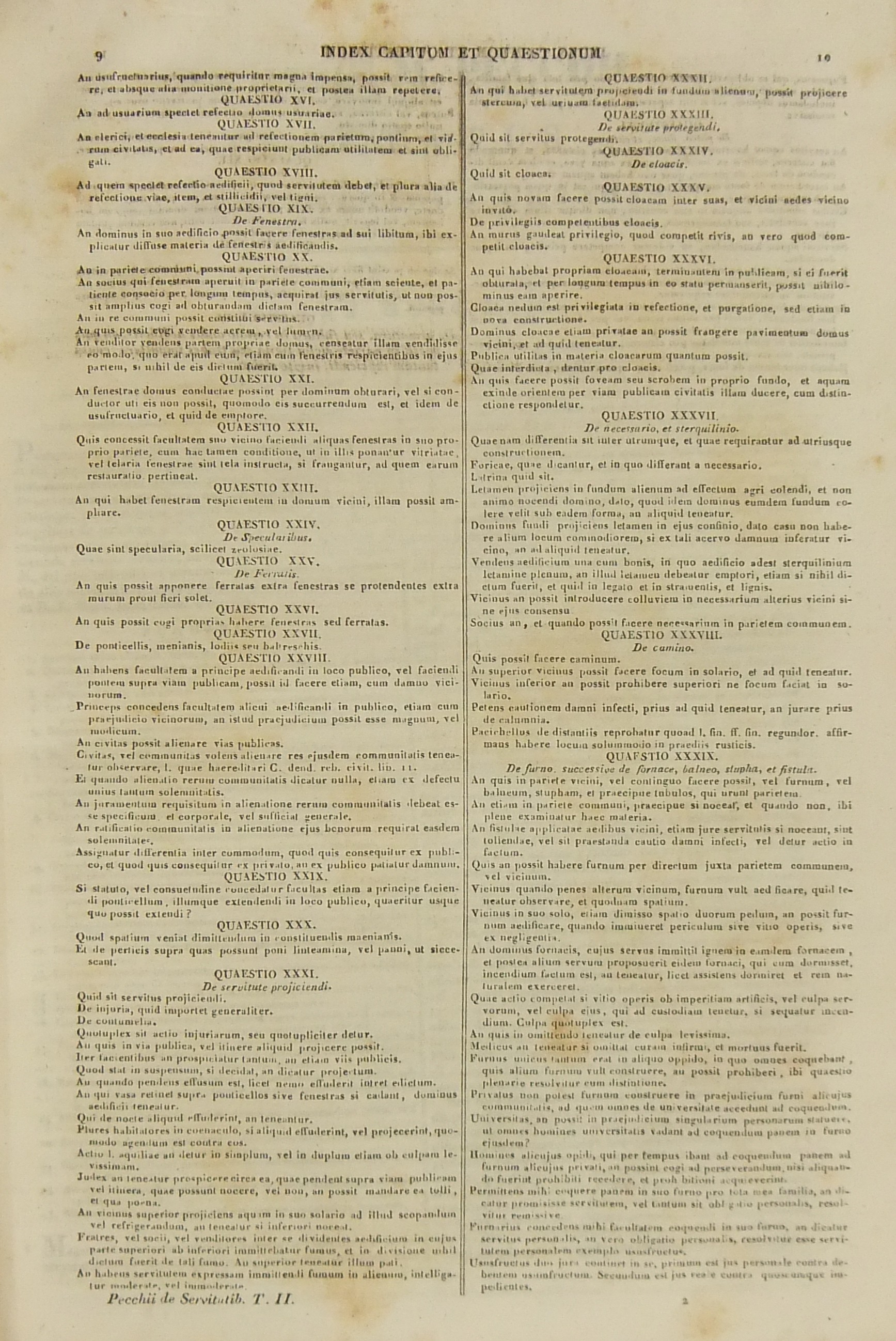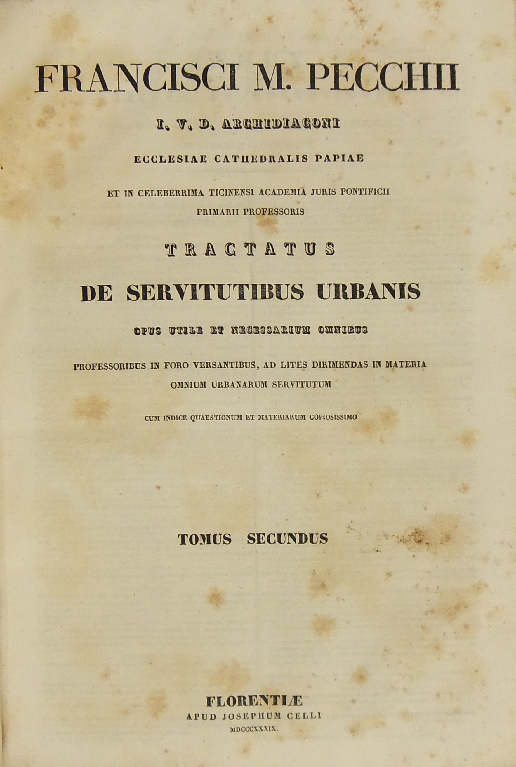 Francisci Mariae Pecchii.. Tractatus de servitutibus in genere. Opus valde utile et necessarium omnibus.. Cum indice quaestionum et materiarum copiosissimo Tomus secundus - Tractatus de servitutibus urbanis.. Cum indice quaestionum et materiarum copiosissimo