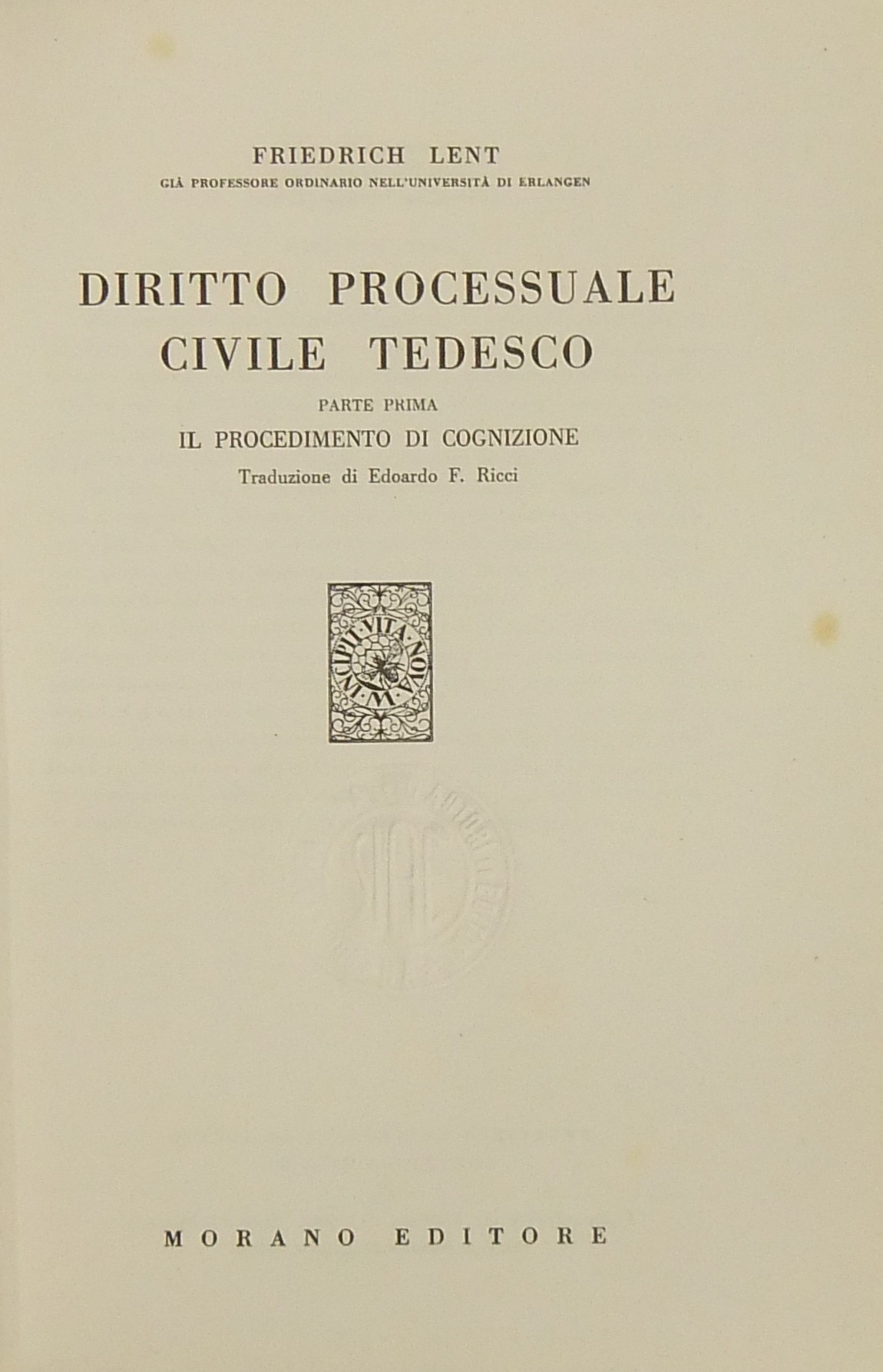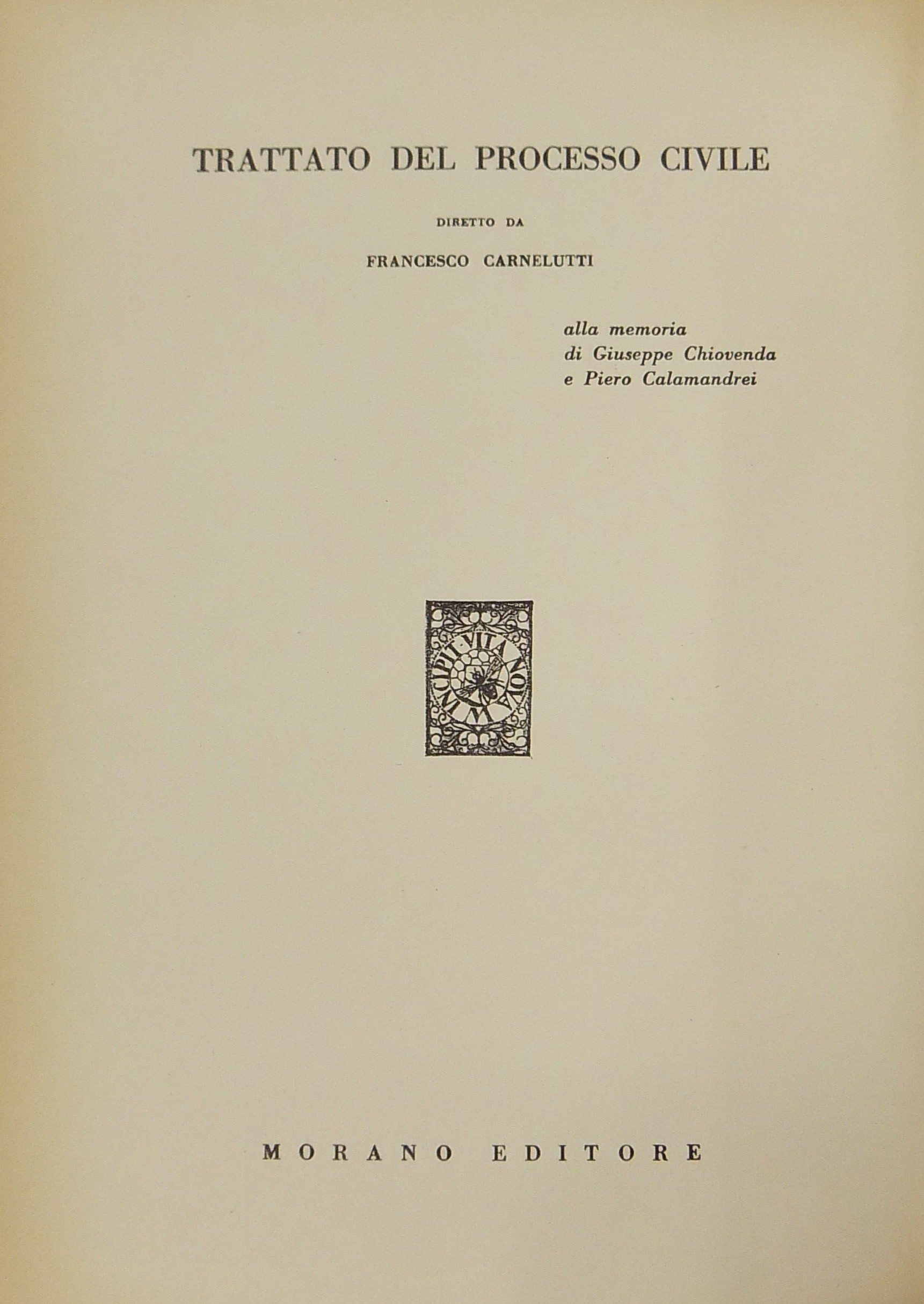 Trattato del processo civile. Francesco Carnelutti - Diritto e processo; Antonio Grieco - La tutela penale del processo civile; Friedrich Lent - Diritto processuale civile tedesco. Parte I (unico pubblicato) - Il procedimento di cognizione. Traduzione di Edoardo F. Ricci; Luigi Montesano - Processo civile e pubblica amministrazione; Renzo Provinciali - Delle impugnazioni in generale; Sandulli Aldo Mazzini - Il giudizio davanti al Consiglio di Stato e ai giudici sottordinati