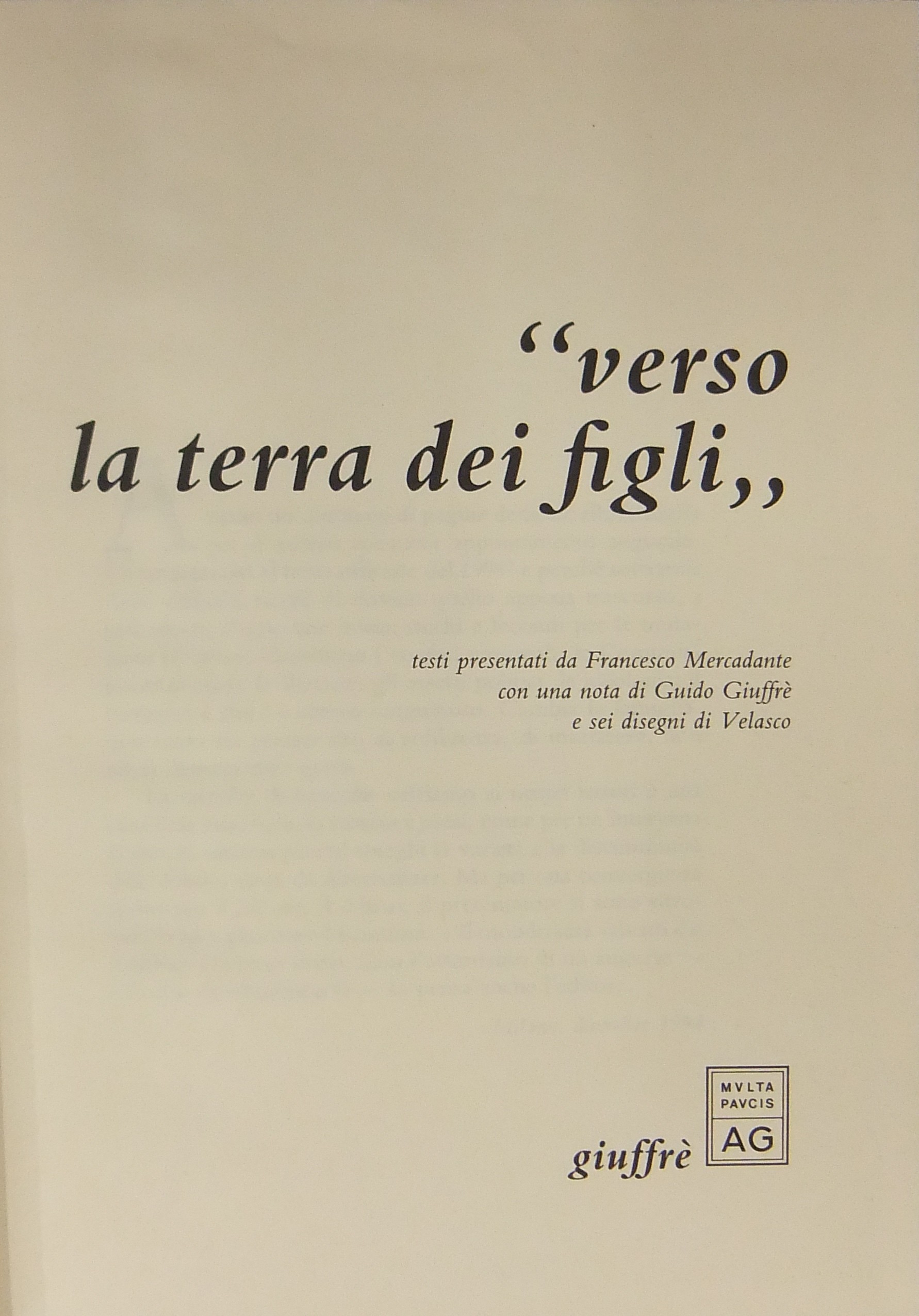 "Verso la terra dei figli". Testi presentati da Francesco Mercadante con una nota di Guido Giuffrè e sei disegni di Velasco