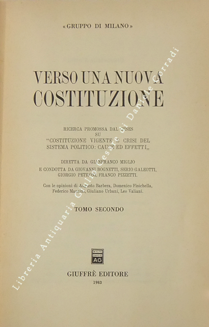 Verso una nuova costituzione. Ricerca promossa dal Ceses su "Costituzione vigente e crisi del sistema politico: cause ed effetti". Diretta da Gianfranco Miglio e condotta da Giovanni Bognetti, Sergio Galeotti, Giorgio Petroni, Franco Pizzetti. Con le opinioni Augusto Barbera, Domenico Fisichella, Federico Mancini, Giuliano Urbani, Leo Valiani