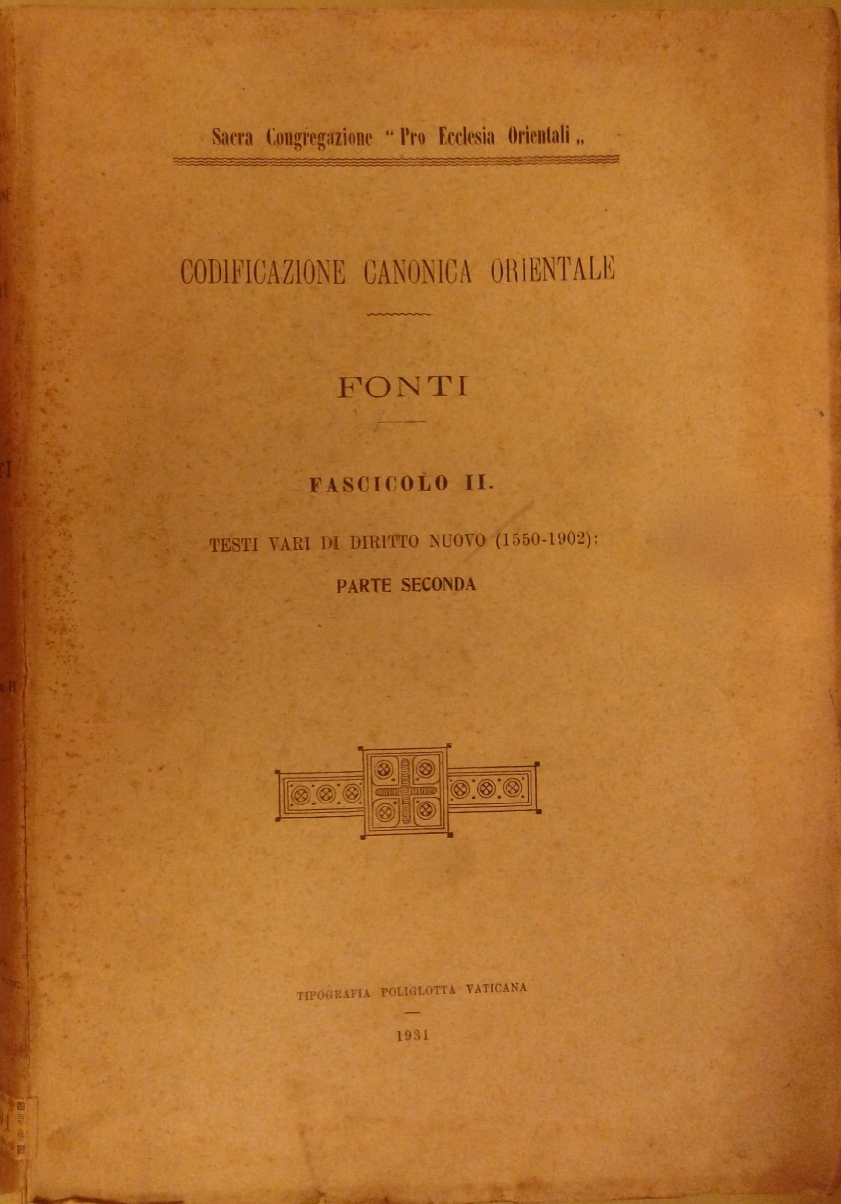 Codificazione canonica orientale. Fonti. Fascicolo I - Fascicolo II - Testi vari di diritto nuovo (1550-1902). Parte prima. Parte seconda