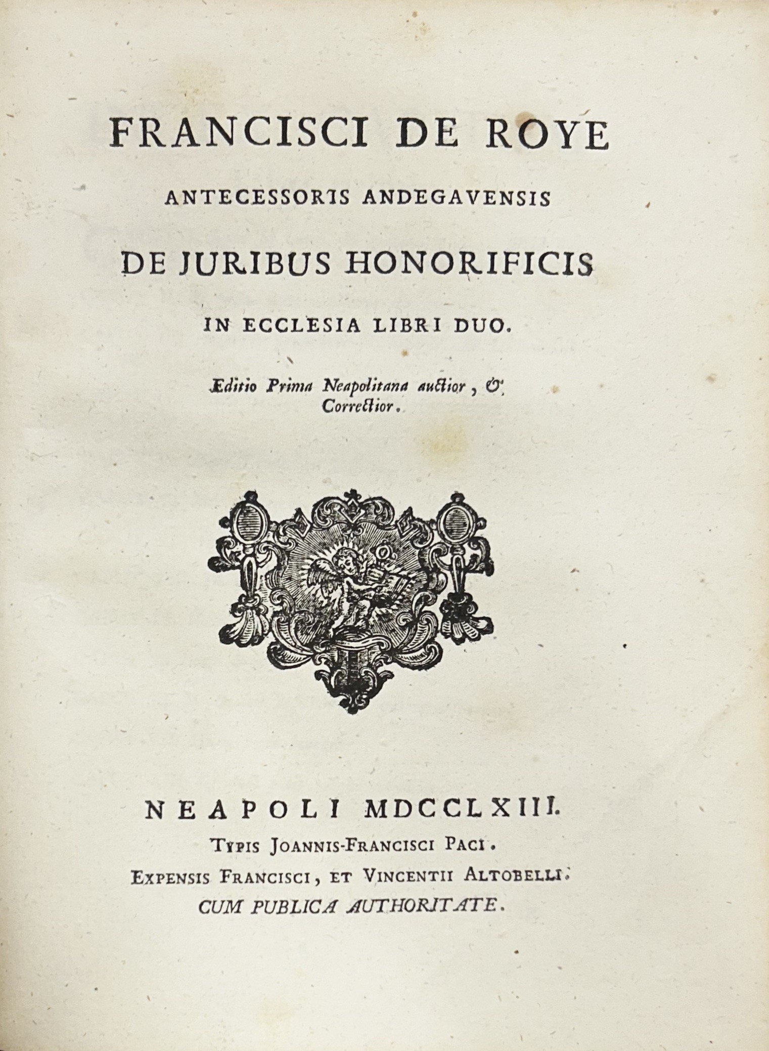 Franciscus de Roye antecessor andegavensis ad titulum De jure patronatus libro tertio decretalium. Ejusdem De juribus honorificis in ecclesia libri duo. UNITO A: De Juribus honorificis in ecclesia Libri duo. Editio prima neapolitana auctior, et correctior