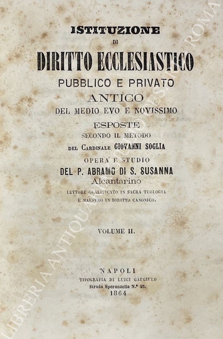 Istituzione di diritto ecclesiastico pubblico e privato antico del Medio Evo e novissimo esposte secondo il metodo del cardinale Giovanni Soglia. Opera e studio del P. Abramo di S. Susanna Alcantarino lettore qualificato in sacra teologia e maestro in diritto canonico