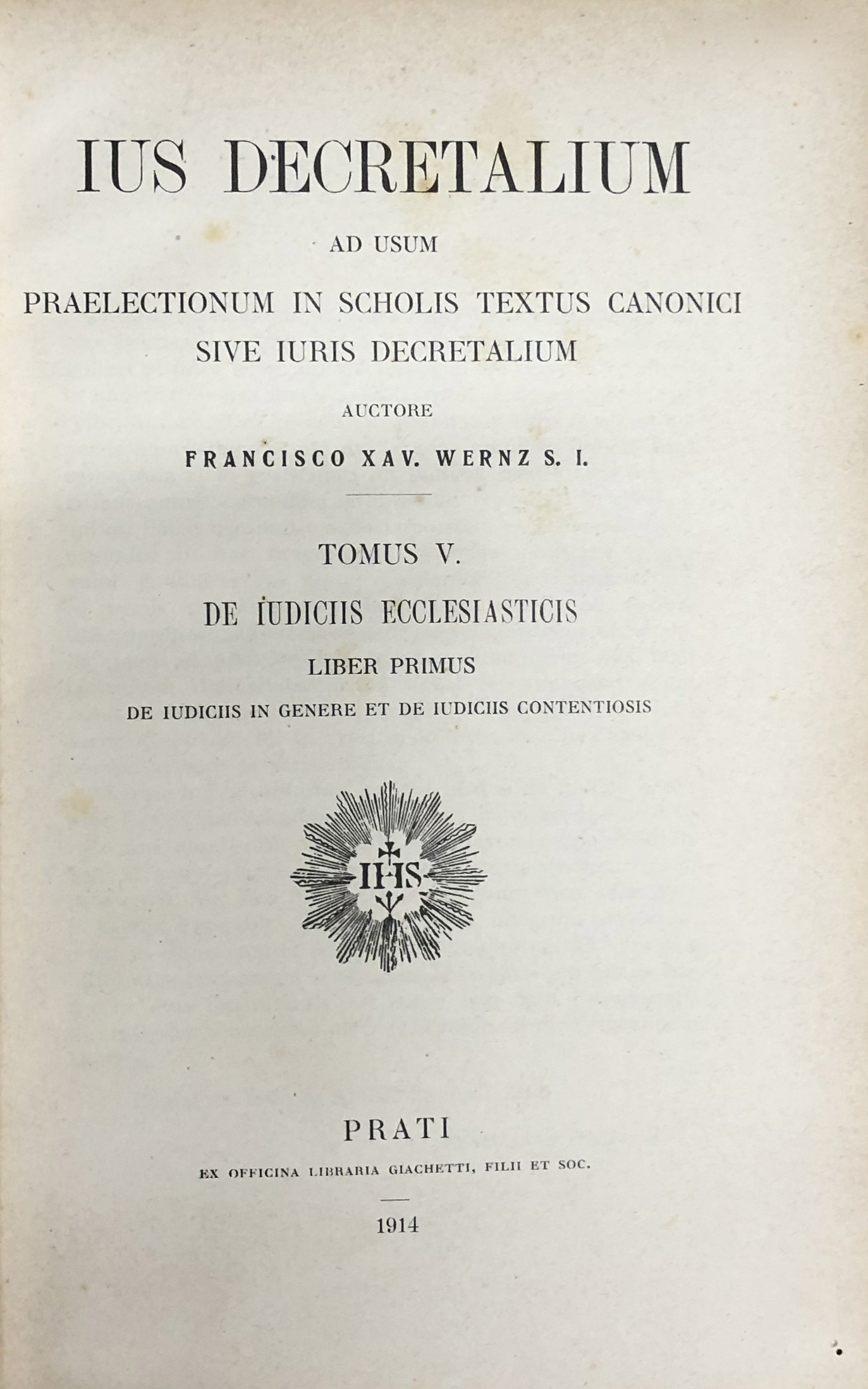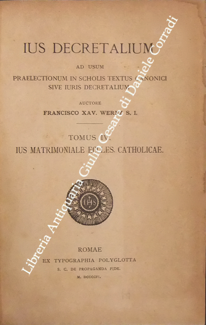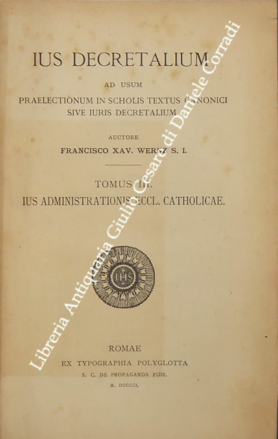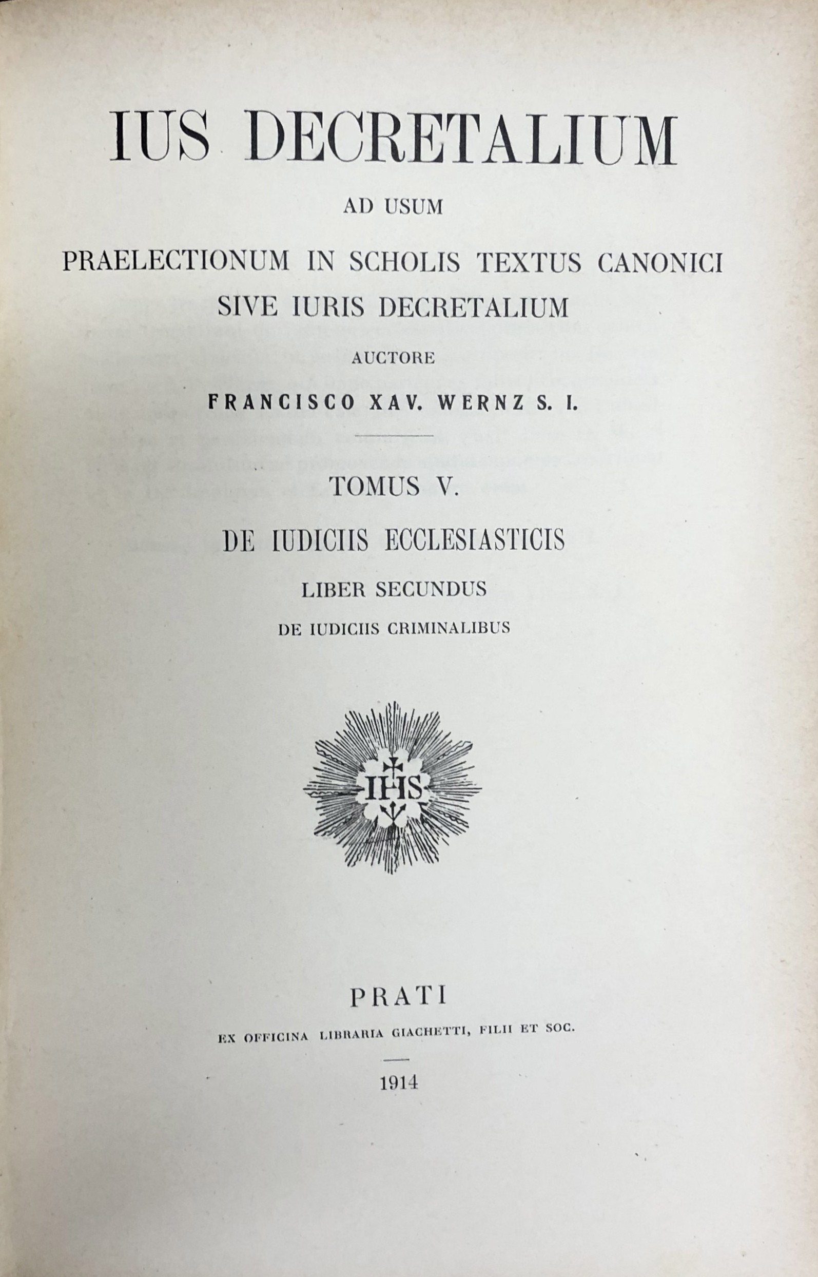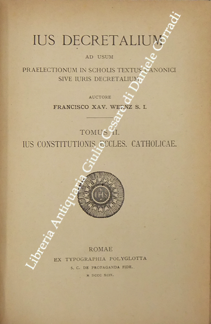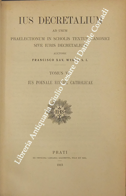 Ius Decretalium ad usum praelectionum in scholis textus canonici sive iuris Decretalium. Tomus I - Introductio in ius decretalium. Tomus II, Pars I e Pars II - Ius constitutionis eccles. Catholicae. Tomus III - Ius administrationis eccles. Catholicae. Tomus IV - Ius matrimoniale eccles. Catholicae. Tomus V - De iudiciis ecclesiasticis. Liber primus - De iudiciis in genere et de iudiciis contentiosis; Liber secundus - De iudiciis criminalibus. Tomus VI - Ius poenale eccles. catholicae