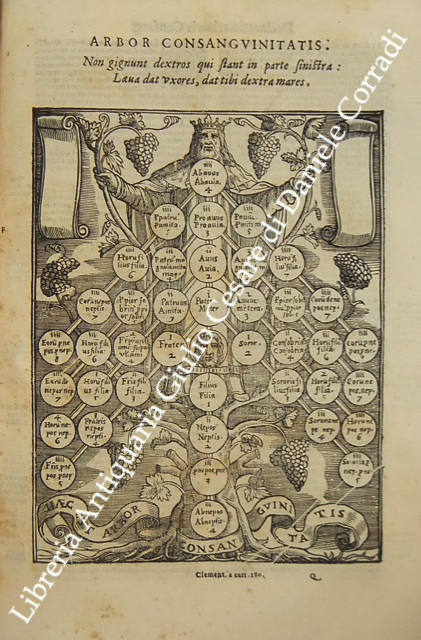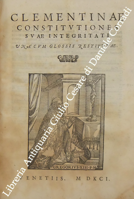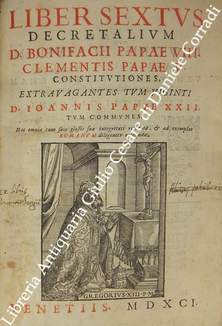 Frontespizio a caratteri neri e rossi capilettera ornati. Edizione glossata. Sul frontespizio e ripetuta all’interno all’inizio di ogni parte una pregevole vignetta calcografica raffigurante Papa Gregorio XIII orante. Alla fine della parte seconda un’altra pregevole vignetta a piena pagina in doppia cornice figurata rappresenta la consegna delle Decretali a Papa Gregorio IX. Corredano inoltre l’opera tre illustrazioni a piena pagina dell’Arbor affinitatis dell’Arbor consanguinitatis e dell’Arbor seu fgura figura declarativa tituli de jure patronatus gli ultimi due dei quali figurati.