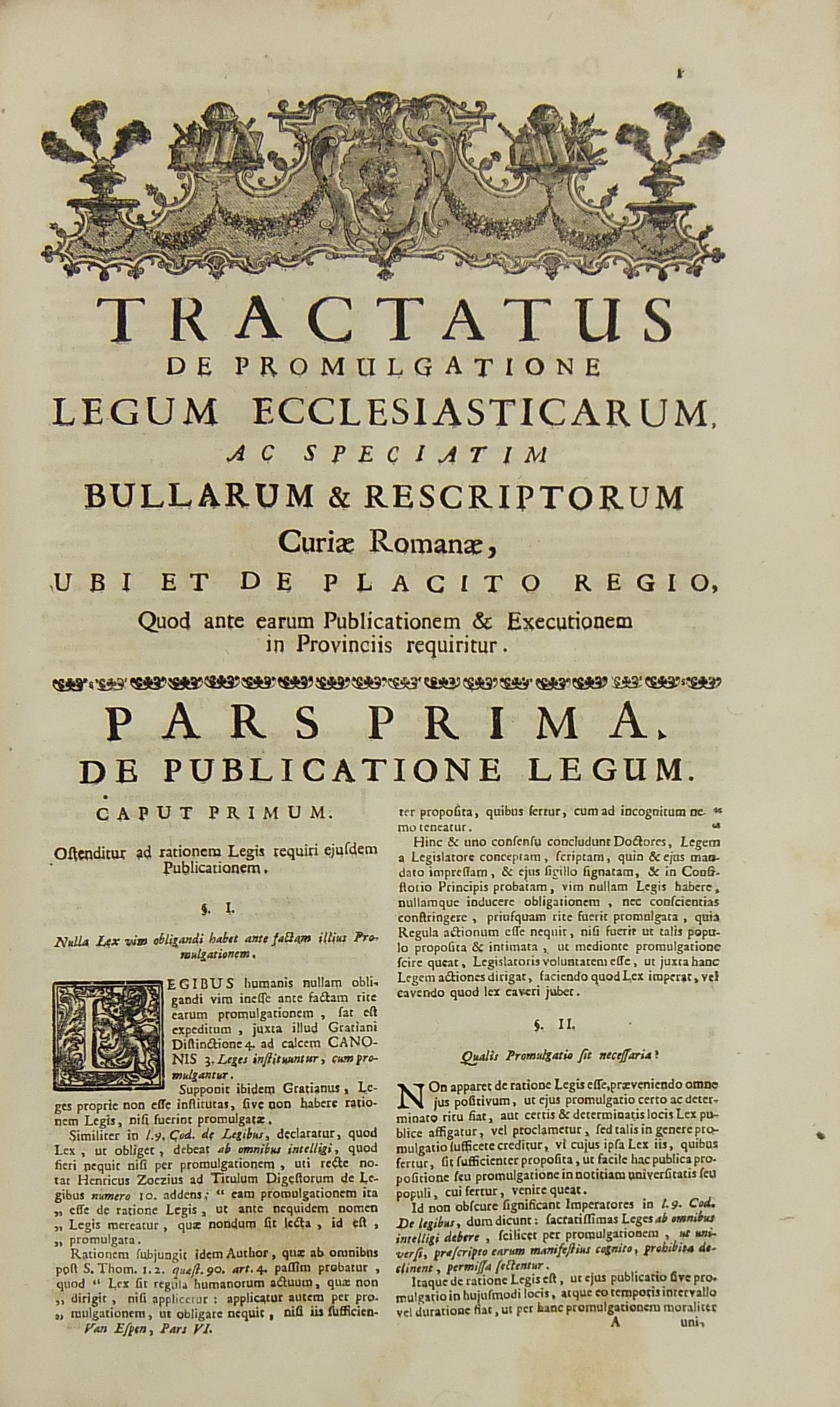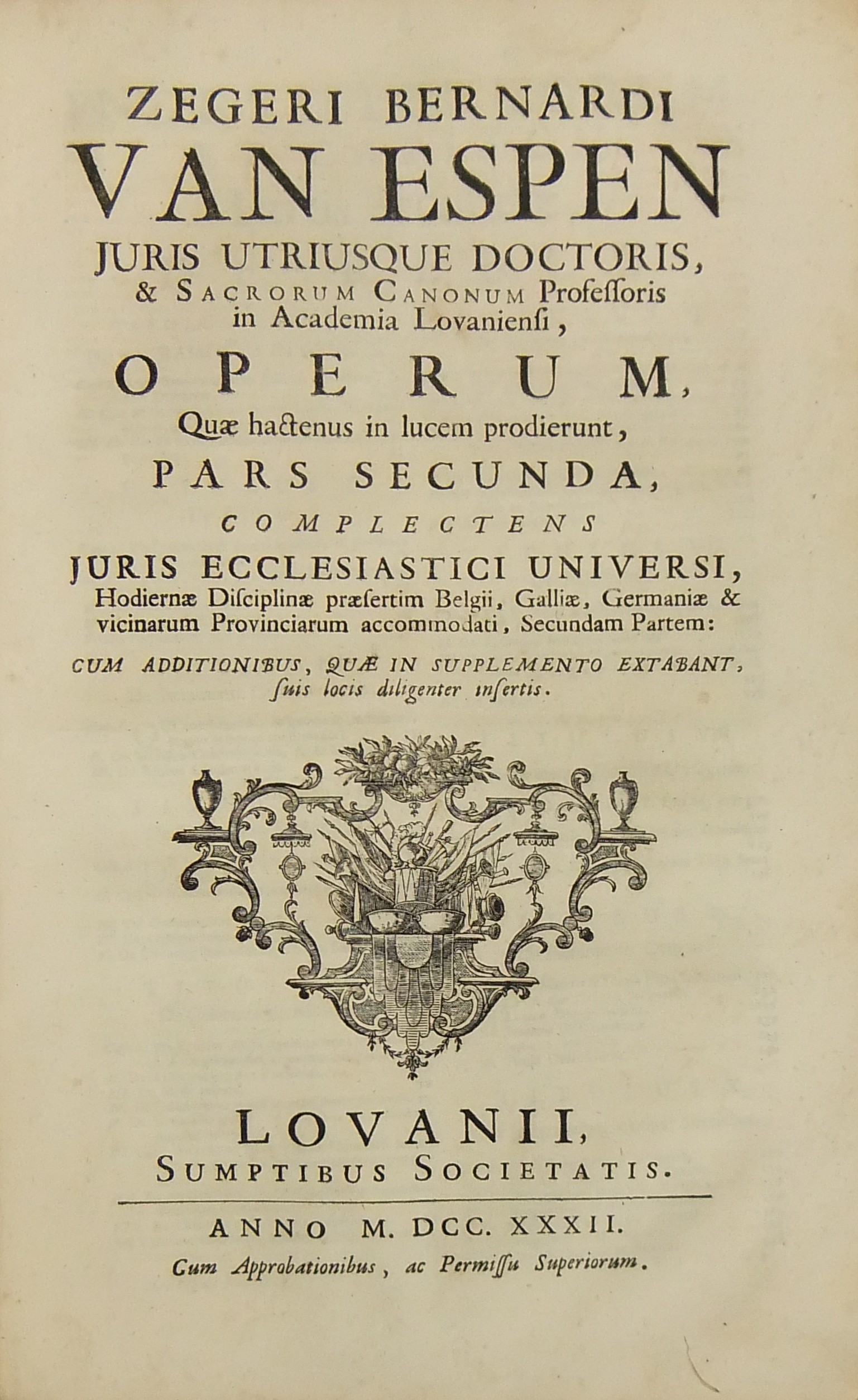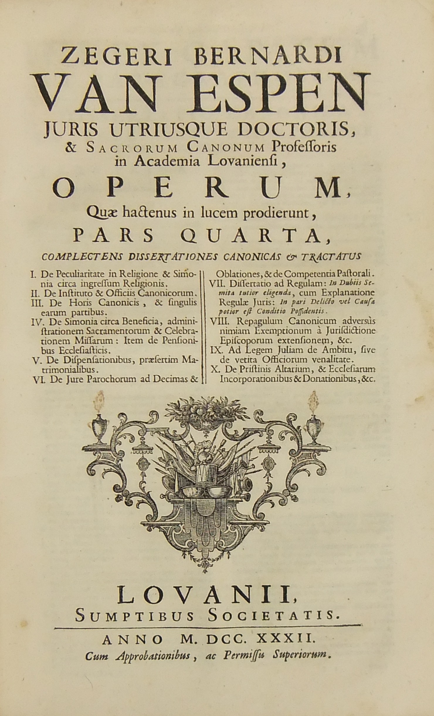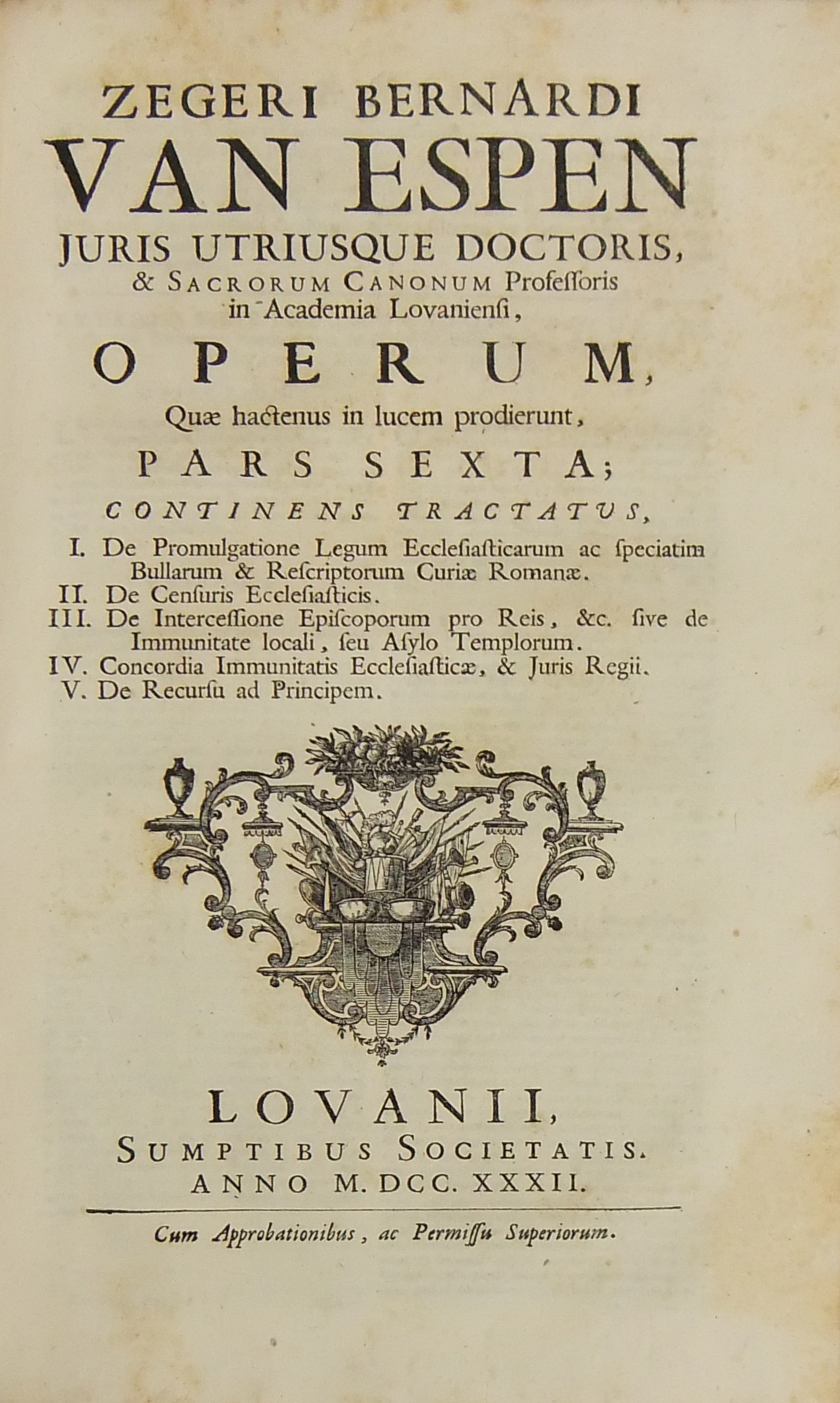 Operum quae hactenus in lucem prodierunt Pars prima complectens juris ecclesiastici universi hodiernae disciplinae praesertim Belgii Galliae Germaniae & vicinarum Provinciarum accommodati primam partem cum additionibus quae in supplemento extabant suis locis diligenter insertis. Pars secunda complectens juris ecclesiastici universi hodiernae disciplinae praesertim Belgii Galliae Germaniae & vicinarum Provinciarum accommodati secundam partem.. Pars tertia complectens juris ecclesiastici universi hodiernae disciplinae praesertim Belgii Galliae Germaniae & vicinarum Provinciarum accommodati tertiam partem.. Pars quarta complectens dissertationes canonicas & tractatus 1. De peculiaritate in religione & simonia circa ingressum religionis. 2. De instituto & officiis canonicorum. 3. De horis canonicis .. 10. De pristinis altarium & ecclesiarum incorporationibus & donationibus &c. Pars quinta complectens Tractatum historico-canonicum in omnes Canones Conciliorum tam Graecos quam Latinos unanimi utriusque Ecclesiae Graecae & Latinae consensu probatos nec non breve commentarium ad Decretum Gratiani Pars sexta continens tractatus 1. De promulgatione legum ecclesiasticarum ac speciatim Bullarum & Rescriptorum Curiae Romanae. 2. De Censuris Ecclesiasticis. 3. De intercessione episcoporum pro Reis &c. sive de immunitate locali seu Asylo templorum. 4. Concordia immunitatis ecclesiasticae & Juris Regii. 5. De recursu ad principem