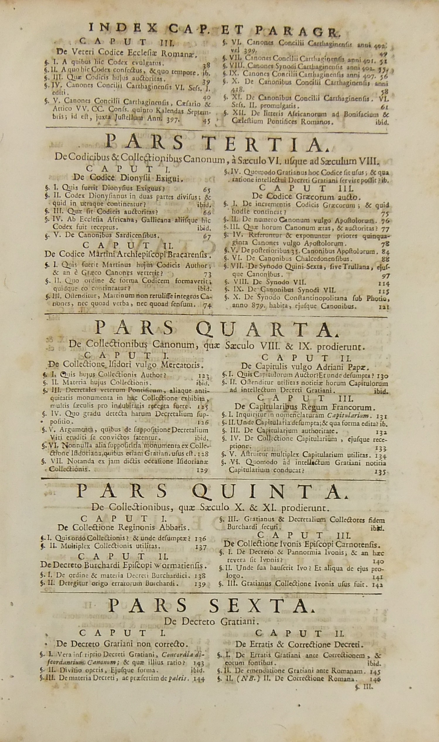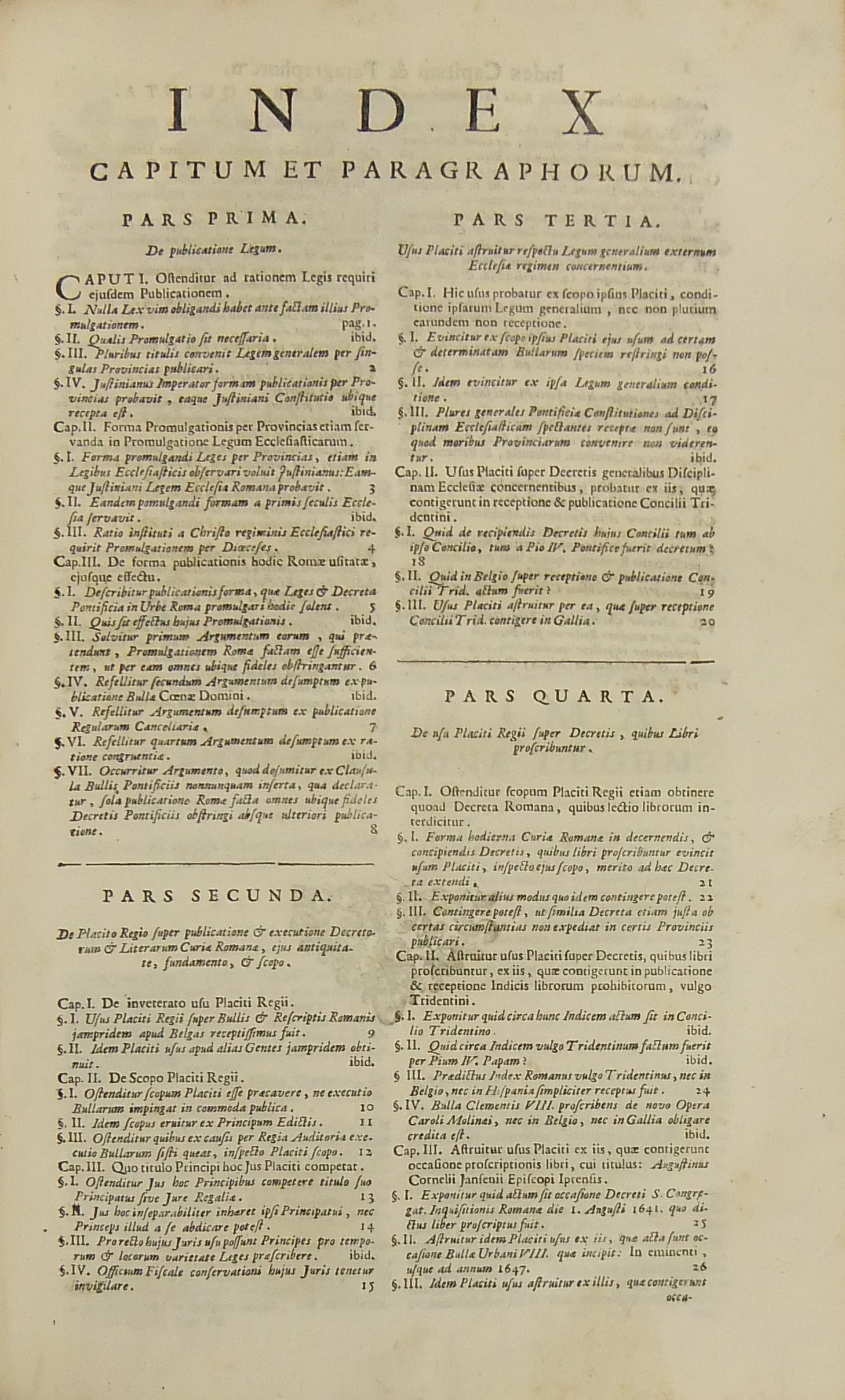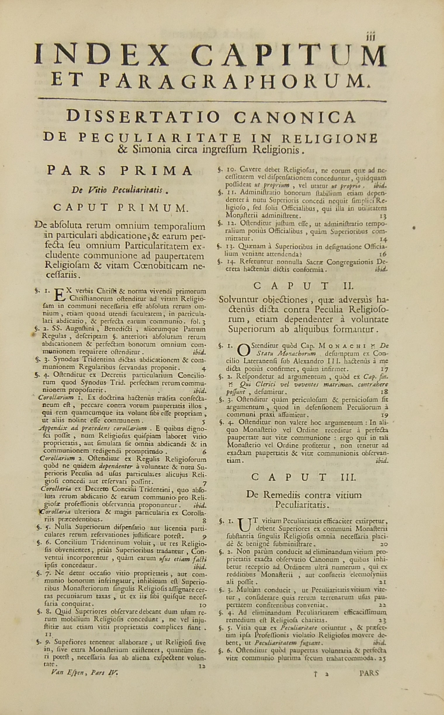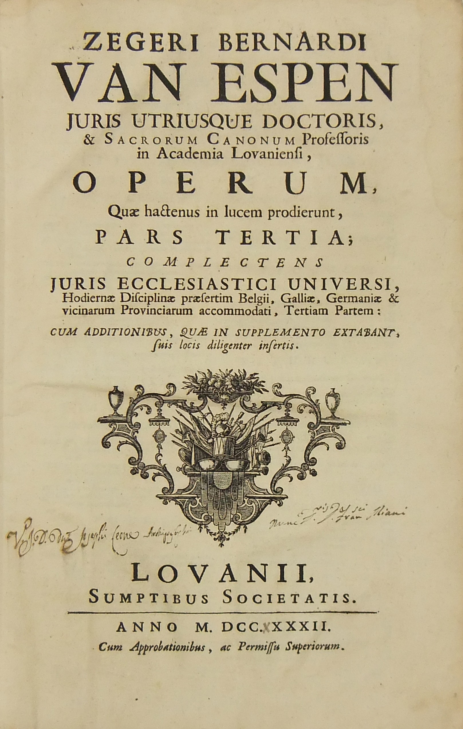 Operum quae hactenus in lucem prodierunt Pars prima complectens juris ecclesiastici universi hodiernae disciplinae praesertim Belgii Galliae Germaniae & vicinarum Provinciarum accommodati primam partem cum additionibus quae in supplemento extabant suis locis diligenter insertis. Pars secunda complectens juris ecclesiastici universi hodiernae disciplinae praesertim Belgii Galliae Germaniae & vicinarum Provinciarum accommodati secundam partem.. Pars tertia complectens juris ecclesiastici universi hodiernae disciplinae praesertim Belgii Galliae Germaniae & vicinarum Provinciarum accommodati tertiam partem.. Pars quarta complectens dissertationes canonicas & tractatus 1. De peculiaritate in religione & simonia circa ingressum religionis. 2. De instituto & officiis canonicorum. 3. De horis canonicis .. 10. De pristinis altarium & ecclesiarum incorporationibus & donationibus &c. Pars quinta complectens Tractatum historico-canonicum in omnes Canones Conciliorum tam Graecos quam Latinos unanimi utriusque Ecclesiae Graecae & Latinae consensu probatos nec non breve commentarium ad Decretum Gratiani Pars sexta continens tractatus 1. De promulgatione legum ecclesiasticarum ac speciatim Bullarum & Rescriptorum Curiae Romanae. 2. De Censuris Ecclesiasticis. 3. De intercessione episcoporum pro Reis &c. sive de immunitate locali seu Asylo templorum. 4. Concordia immunitatis ecclesiasticae & Juris Regii. 5. De recursu ad principem