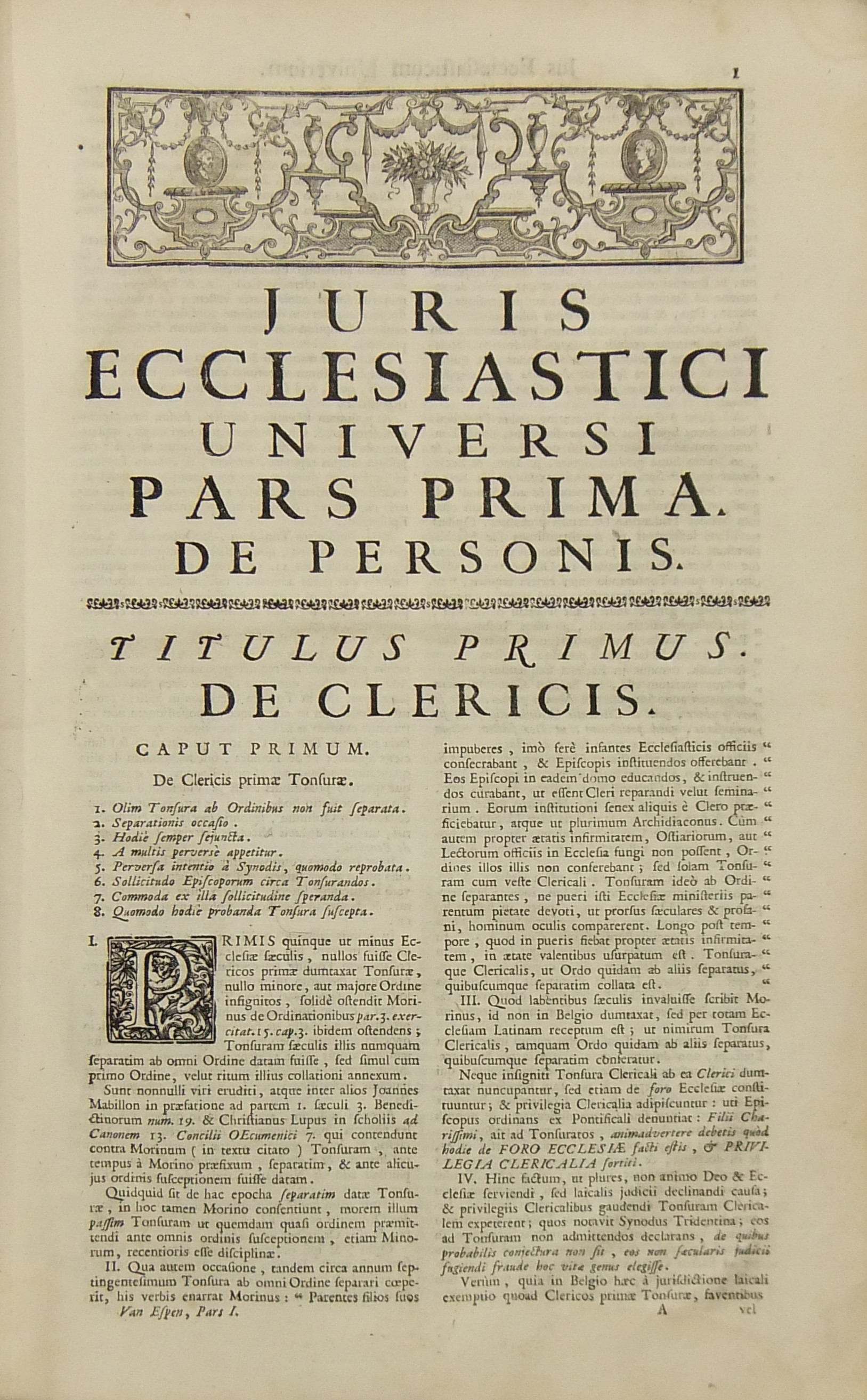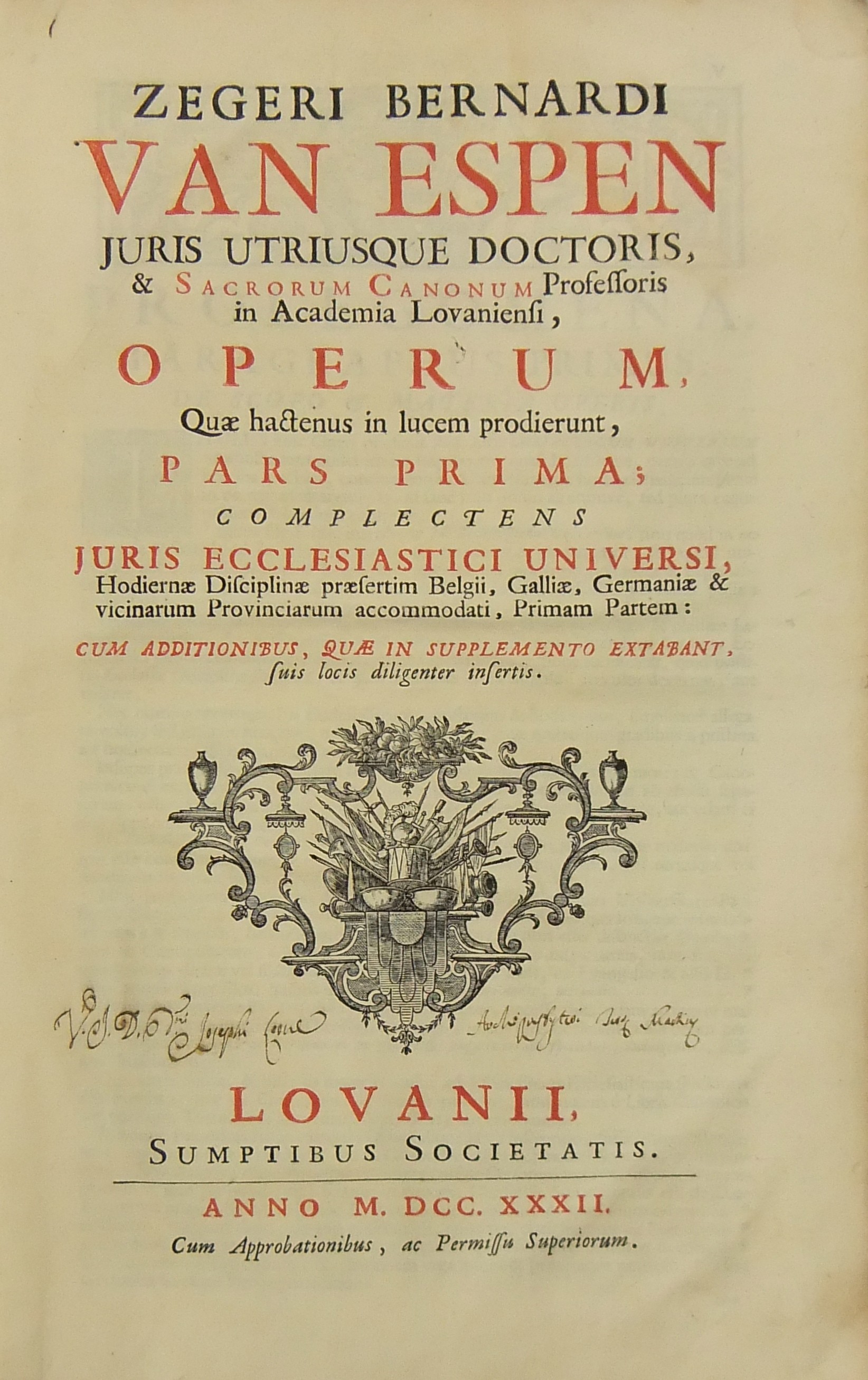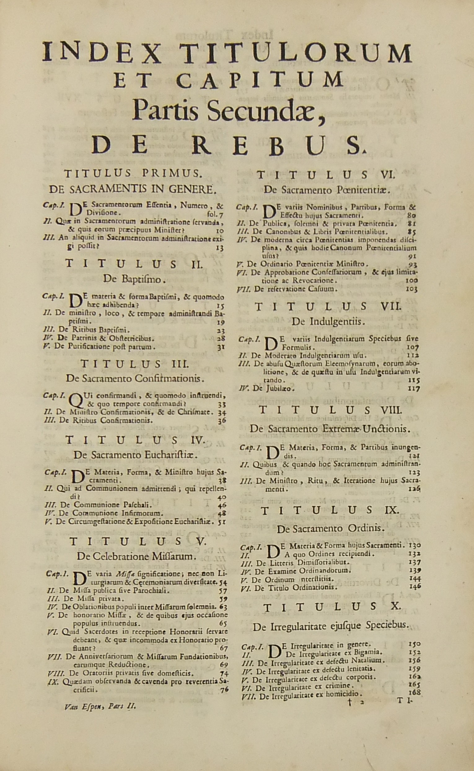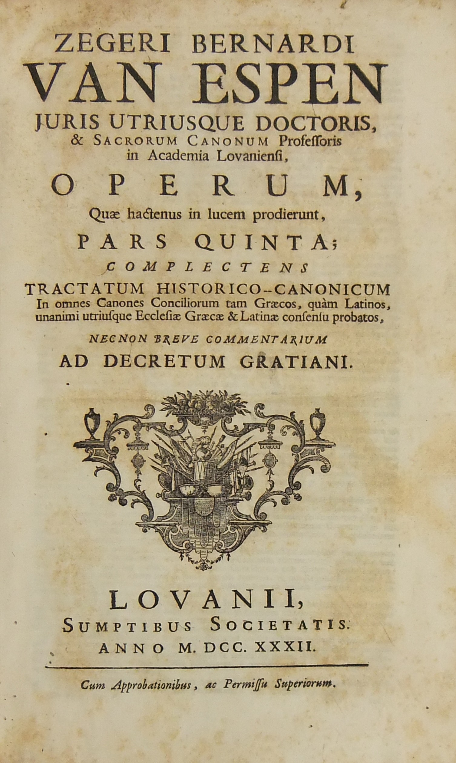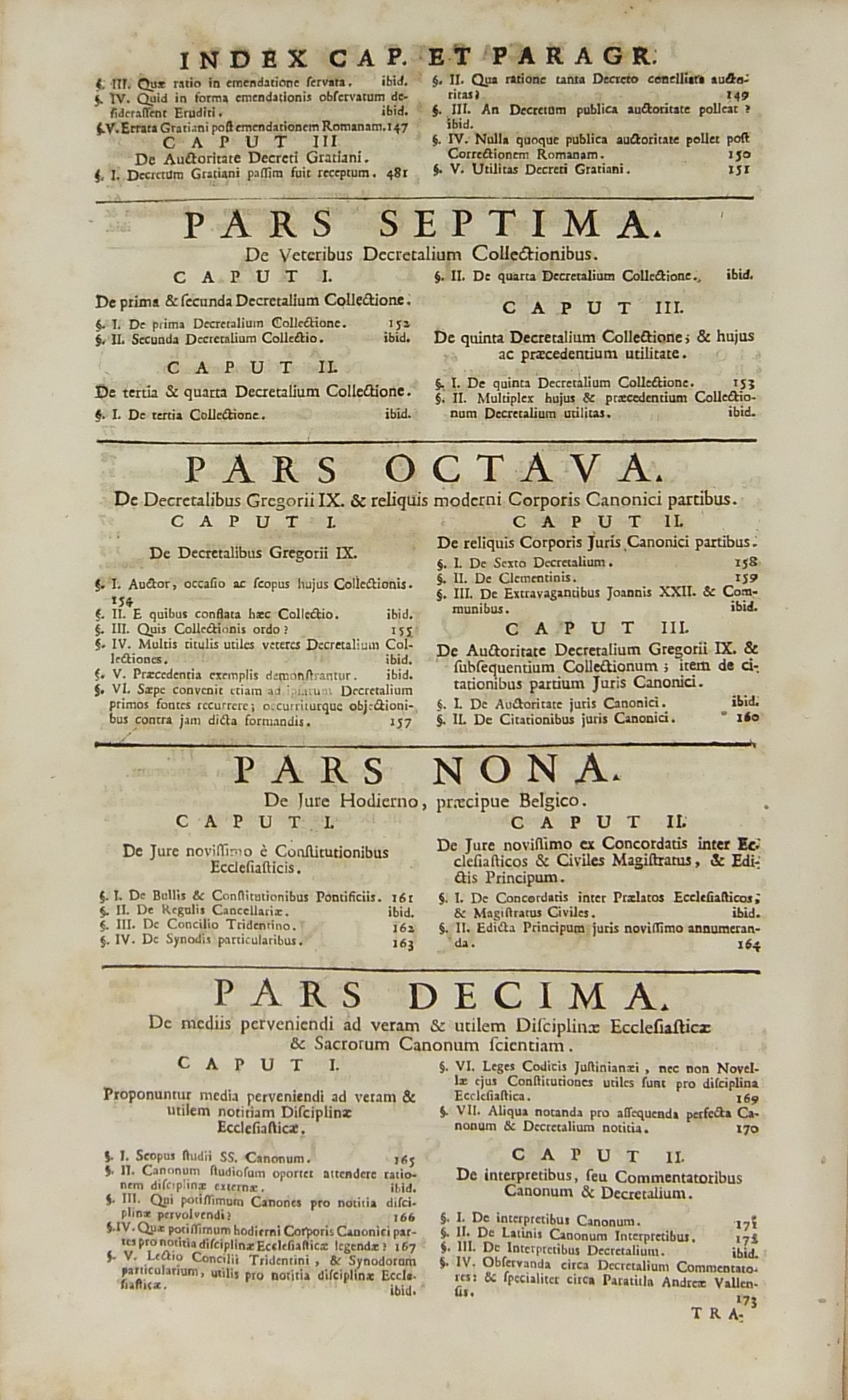Operum quae hactenus in lucem prodierunt Pars prima complectens juris ecclesiastici universi hodiernae disciplinae praesertim Belgii Galliae Germaniae & vicinarum Provinciarum accommodati primam partem cum additionibus quae in supplemento extabant suis locis diligenter insertis. Pars secunda complectens juris ecclesiastici universi hodiernae disciplinae praesertim Belgii Galliae Germaniae & vicinarum Provinciarum accommodati secundam partem.. Pars tertia complectens juris ecclesiastici universi hodiernae disciplinae praesertim Belgii Galliae Germaniae & vicinarum Provinciarum accommodati tertiam partem.. Pars quarta complectens dissertationes canonicas & tractatus 1. De peculiaritate in religione & simonia circa ingressum religionis. 2. De instituto & officiis canonicorum. 3. De horis canonicis .. 10. De pristinis altarium & ecclesiarum incorporationibus & donationibus &c. Pars quinta complectens Tractatum historico-canonicum in omnes Canones Conciliorum tam Graecos quam Latinos unanimi utriusque Ecclesiae Graecae & Latinae consensu probatos nec non breve commentarium ad Decretum Gratiani Pars sexta continens tractatus 1. De promulgatione legum ecclesiasticarum ac speciatim Bullarum & Rescriptorum Curiae Romanae. 2. De Censuris Ecclesiasticis. 3. De intercessione episcoporum pro Reis &c. sive de immunitate locali seu Asylo templorum. 4. Concordia immunitatis ecclesiasticae & Juris Regii. 5. De recursu ad principem