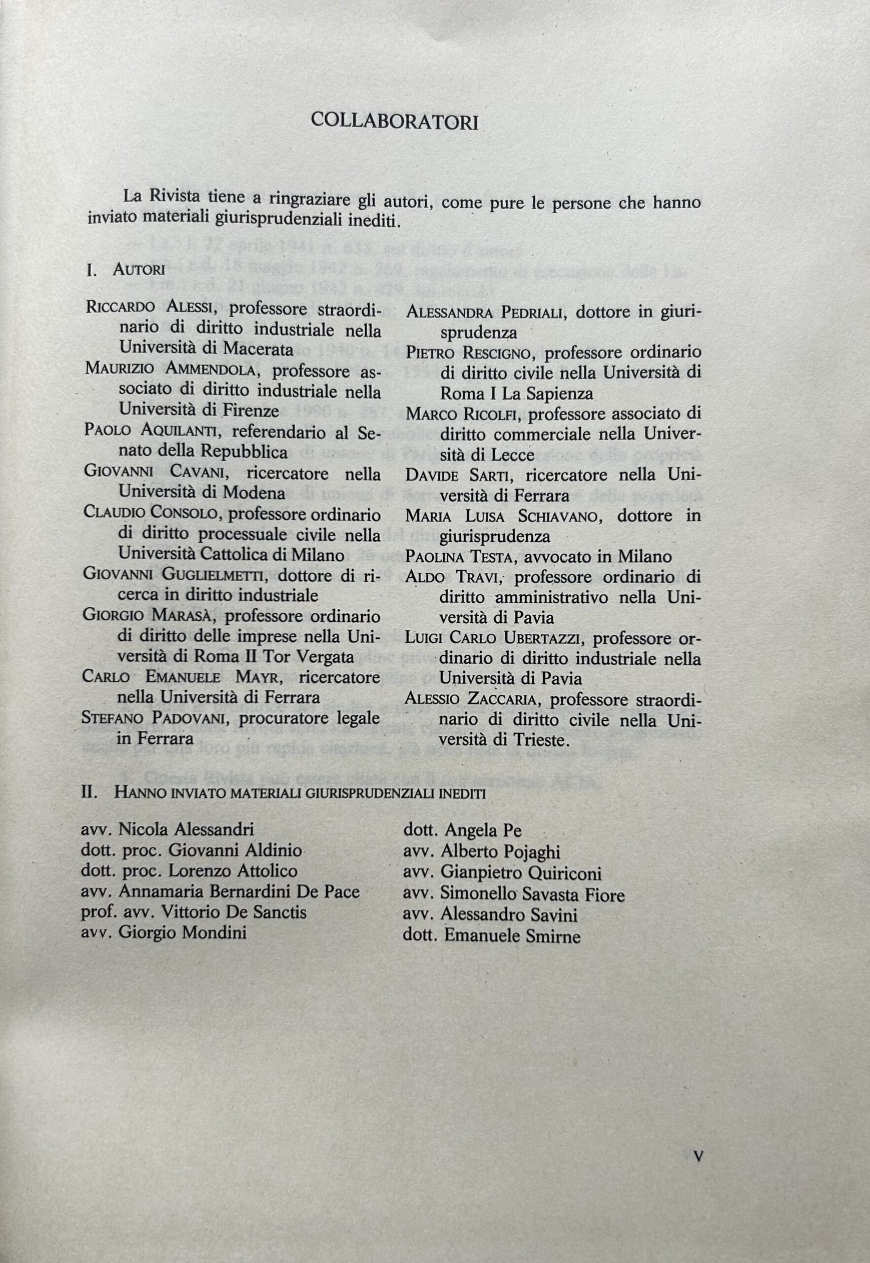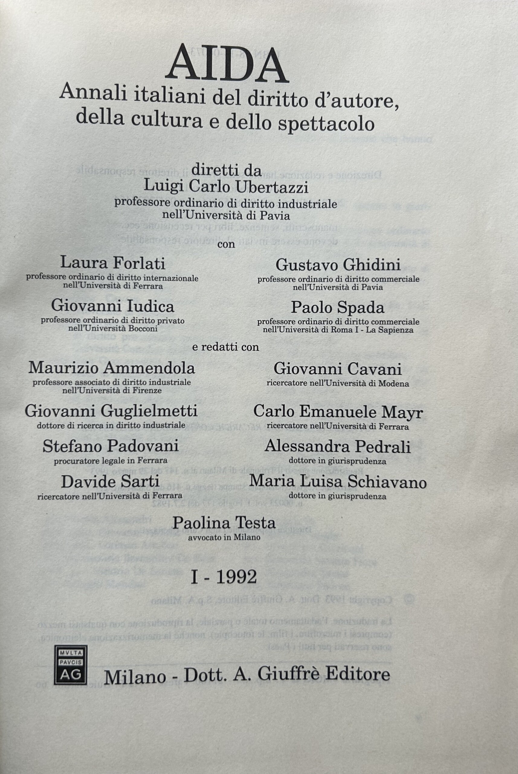 AIDA - Annali italiani del diritto d'autore, della cultura e dello spettacolo. Diretti da Luigi Carlo Ubertazzi con Laura Forlati, Gustavo Ghidini, Gianluca Iudica, Paolo Spada e redatti con Maurizio Ammendola, Giovanni Cavani, Giovanni Guglielmetti, Carlo Emanuele Mayr, Stefano Padovani, Alessandra Pedrali, Davide Sarti, Maria Luisa Schiavano