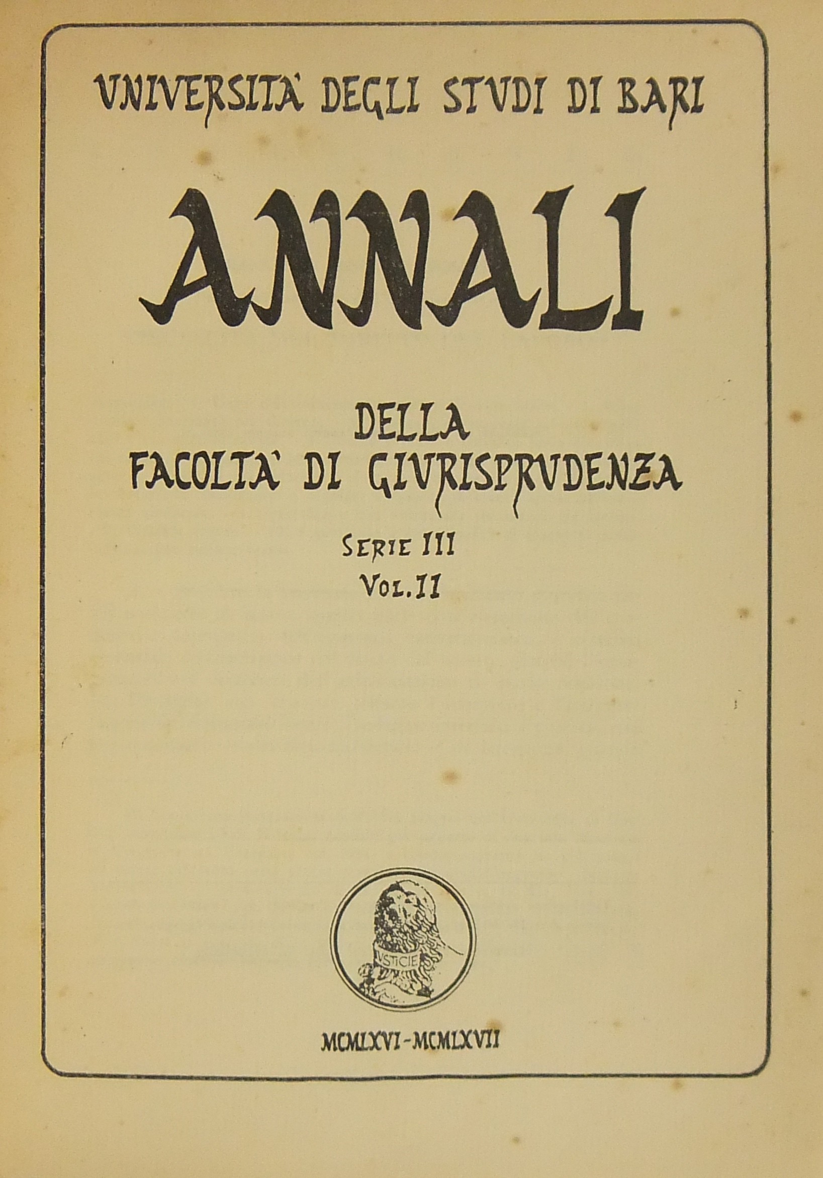 Annali della Facoltà di Giurisprudenza dell'Università degli Studi di Bari. Vol. II della Serie III 1966-1967