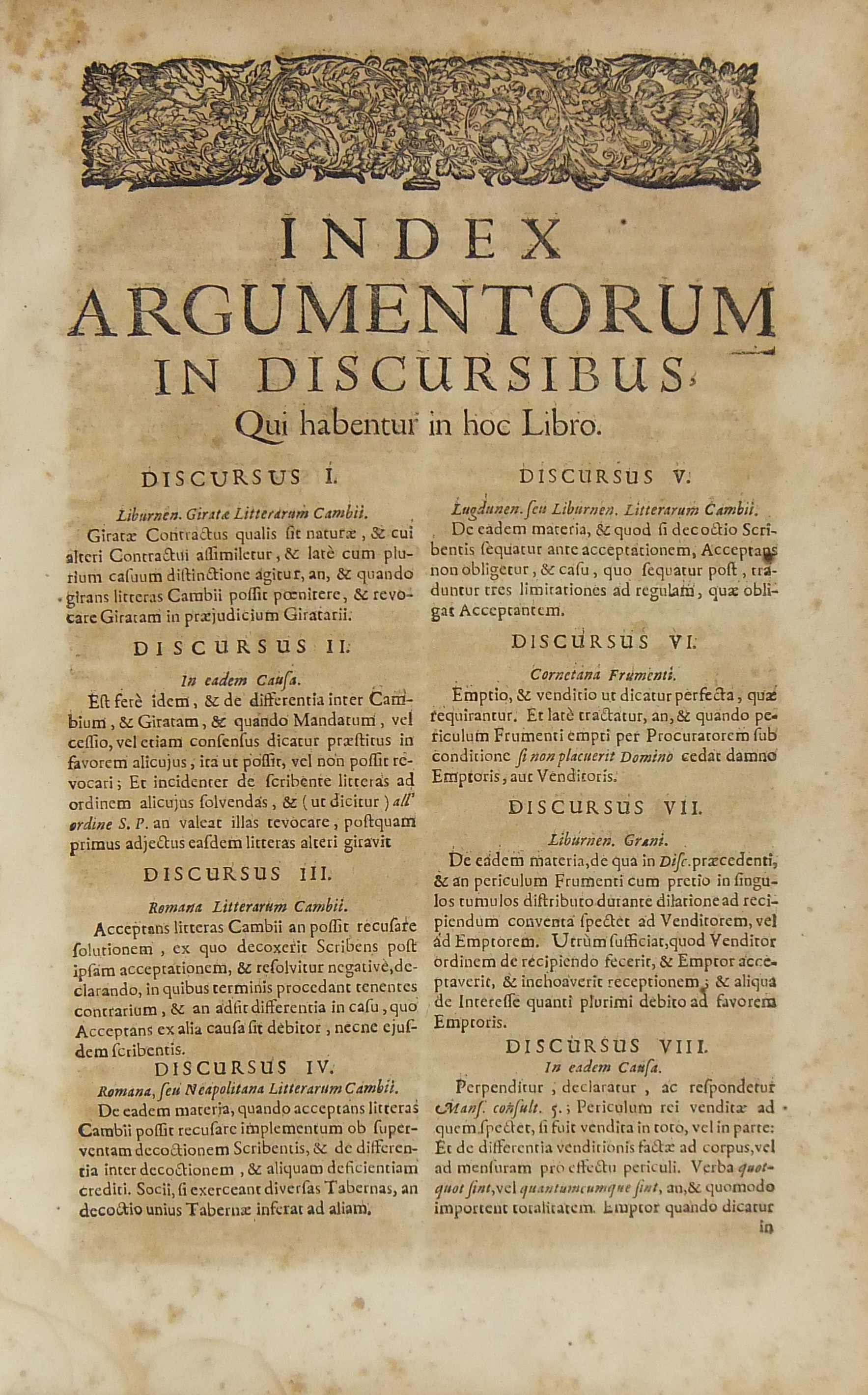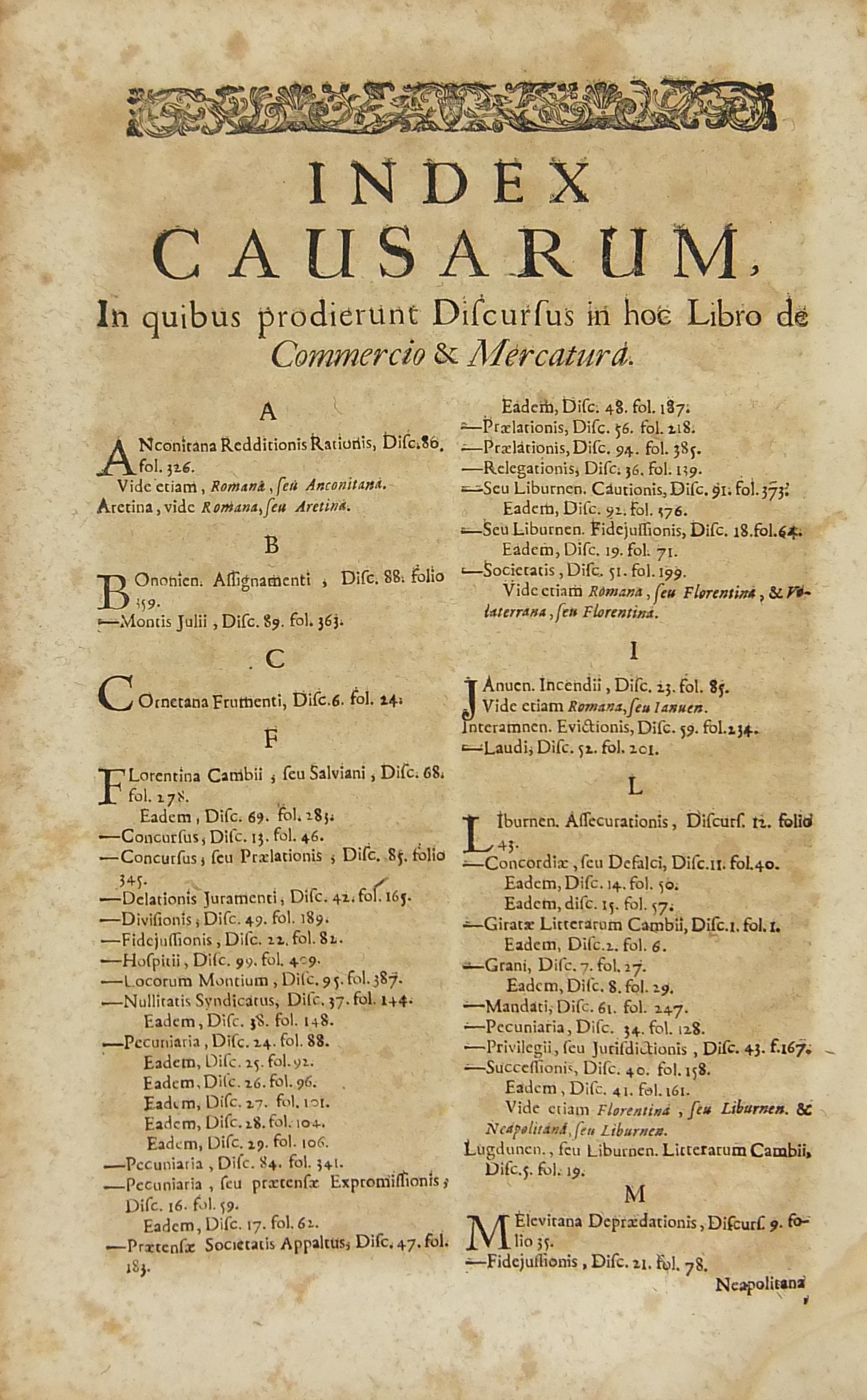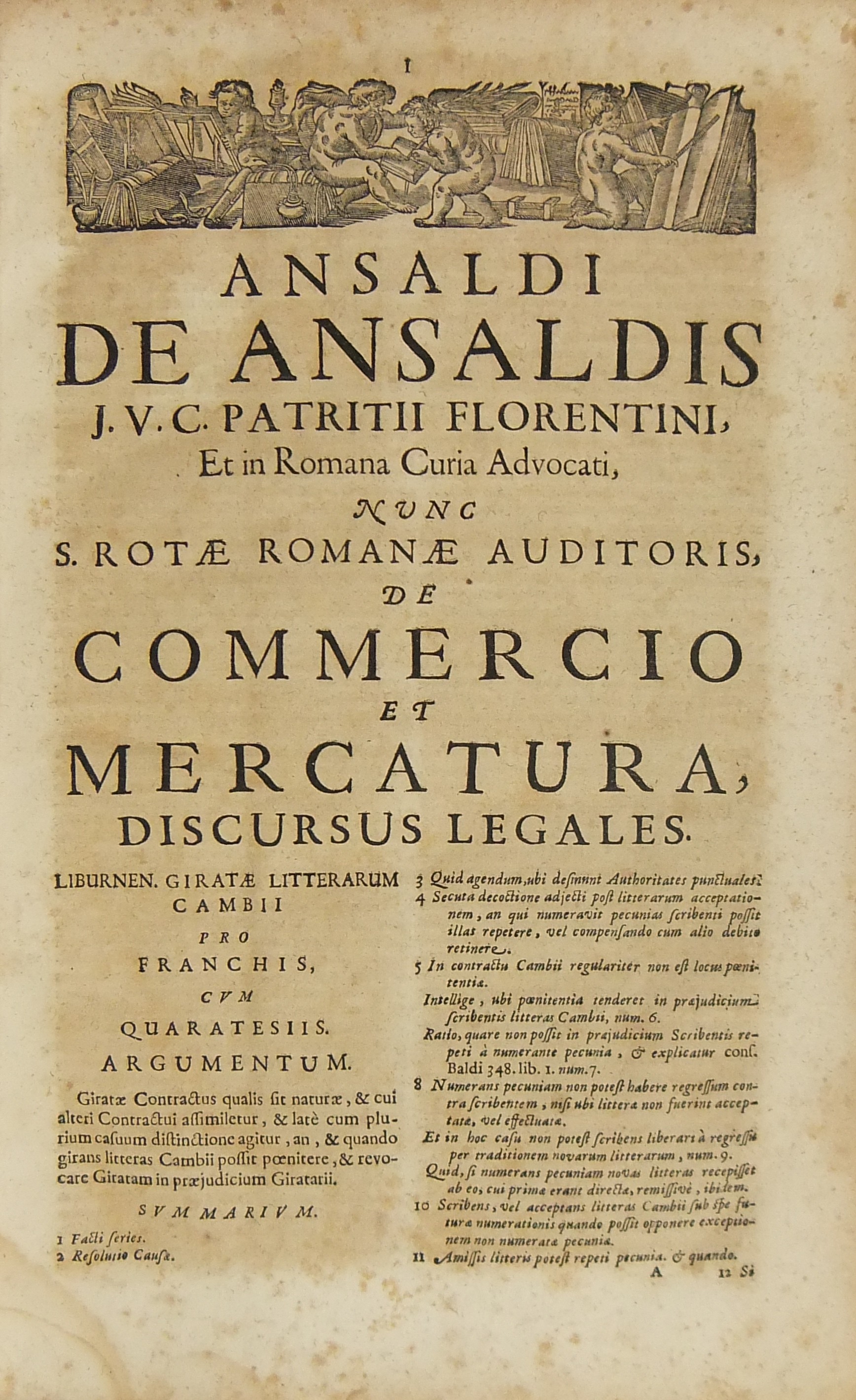 Ansaldi De Ansaldis... Discursus legales de commercio et mercatura. In quibus universa fere commercii et mercaturae Materia resolutive continetur. Cum indice argumentorum causarum materiarum et rerum opulentissimo