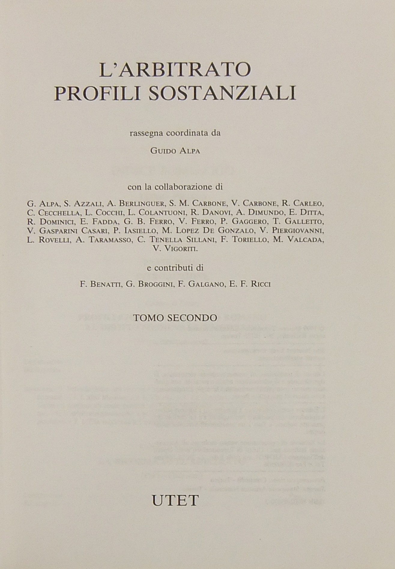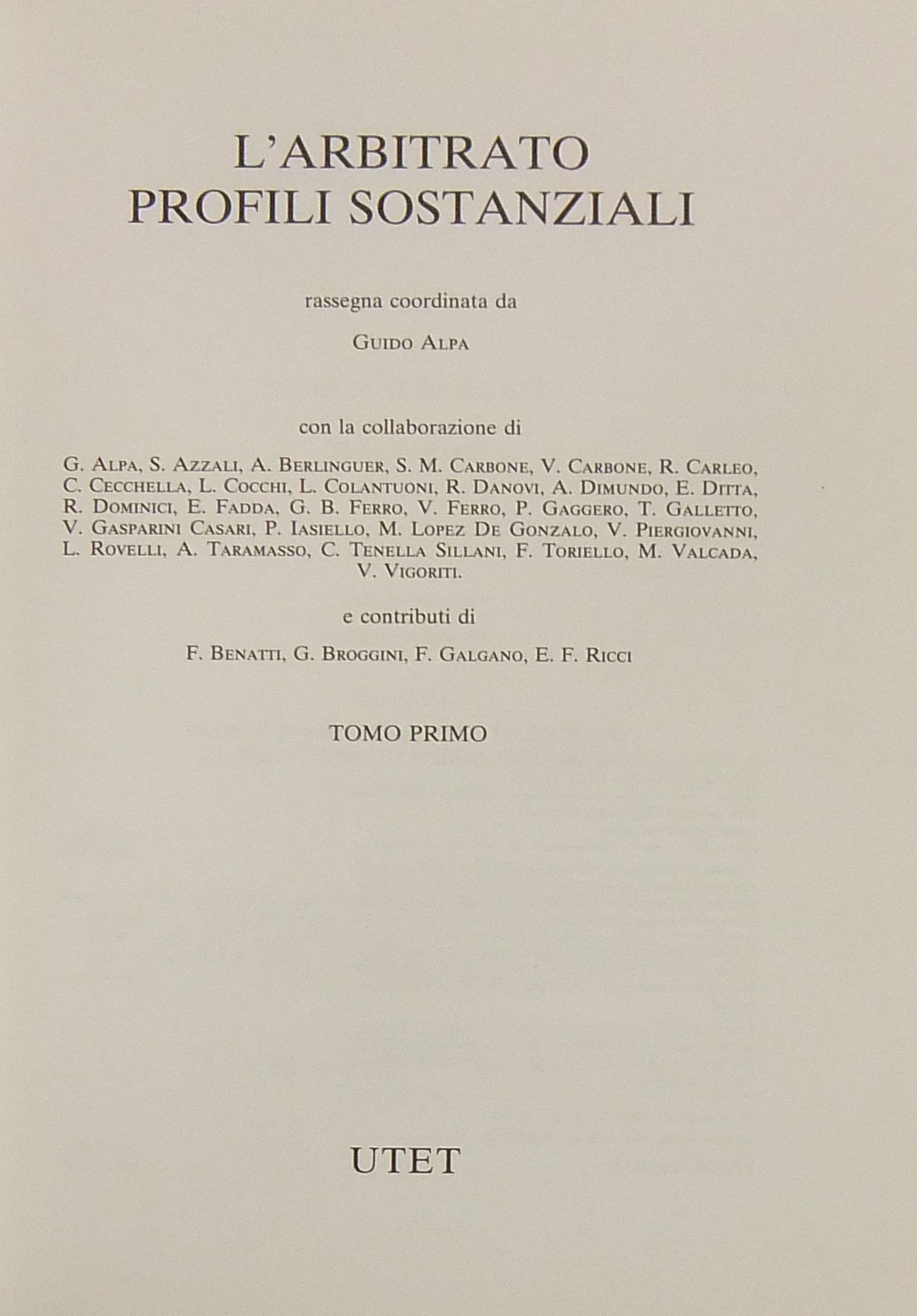 L'arbitrato. Profili sostanziali. Rassegna coordinata da Guido Alpa con la collaborazione di G. Alpa, S. Azzali, A. Berlinguer, S.M. Carbone, V. Carbone, R. Carleo, C. Cecchella, L. Cocchi, L. Colantuoni, R. Danovi, A. Dimundo, E. Ditta, R. Dominici, E. Fadda, G.B. Ferro, V. Ferro, P. Gaggero, T. Galletto, V. Gasparini Casari, P. Iasiello, M. Lopez de Gonzalo, V. Piergiovanni, L. Rovelli, A. Taramasso, C. Tenella Sillani, F. Toriello, M. Valcada, V. Vigoriti. E contributi di F. Benatti, G. Broggini, F. Galgano, E.F. Ricci