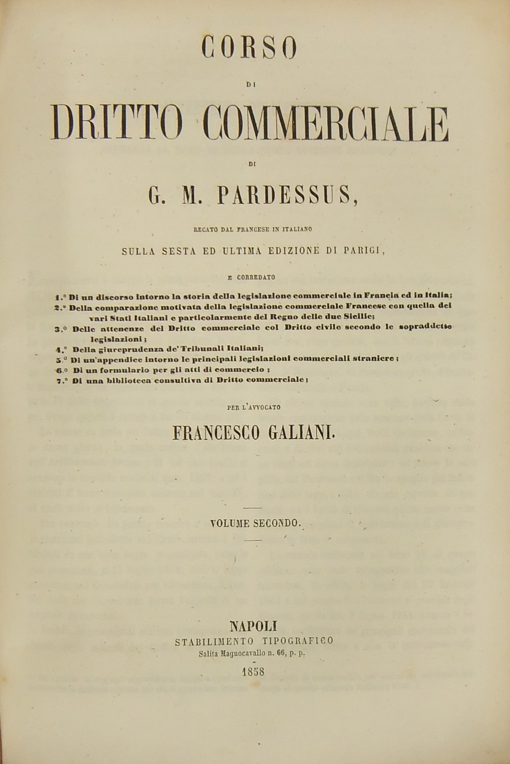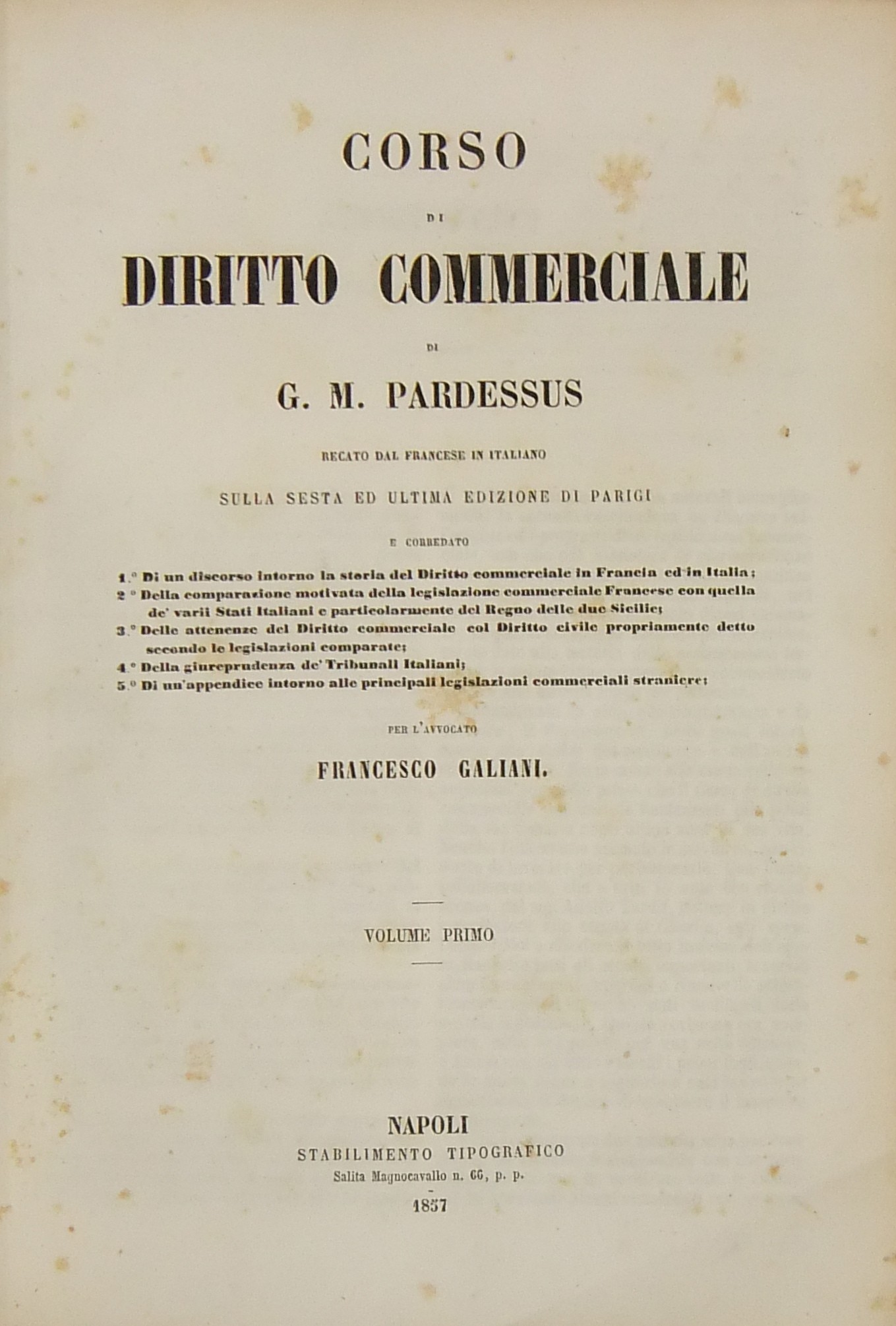 Corso di diritto commerciale.. Recato dal francese in italiano sulla sesta ed ultima edizione di Parigi e corredato 1 - Di un discorso intorno la storia del Diritto commerciale in Francia ed in Italia 2 - Della comparazione motivata della legislazione commerciale francese.. 3 - Delle attenenze del Diritto commerciale col Diritto civile.. 4 - Della giureprudenza de' Tribunali italiani 5 - Di un'appendice intorno alle principali legislazioni commerciali straniere per l'avvocato Francesco Galiani