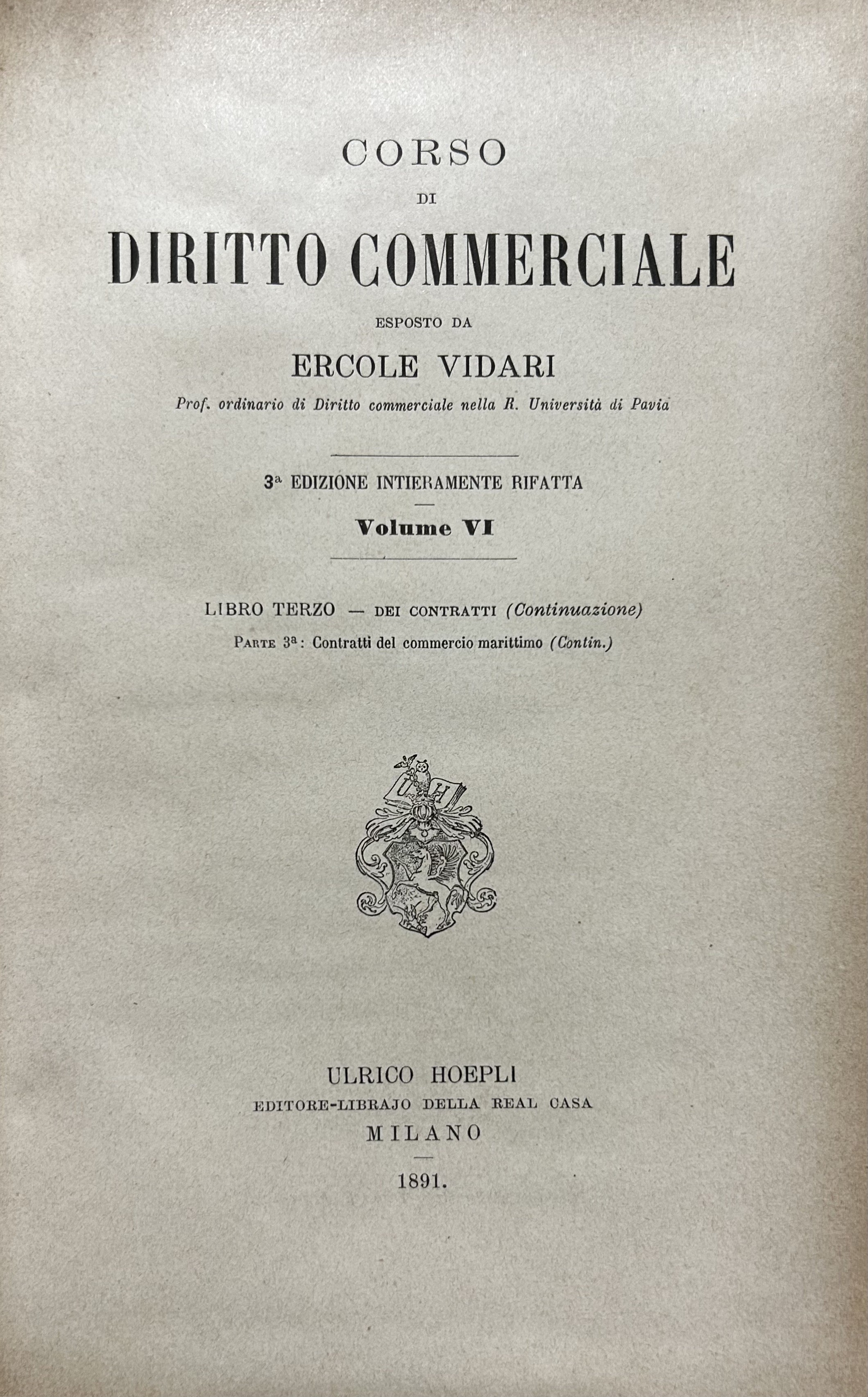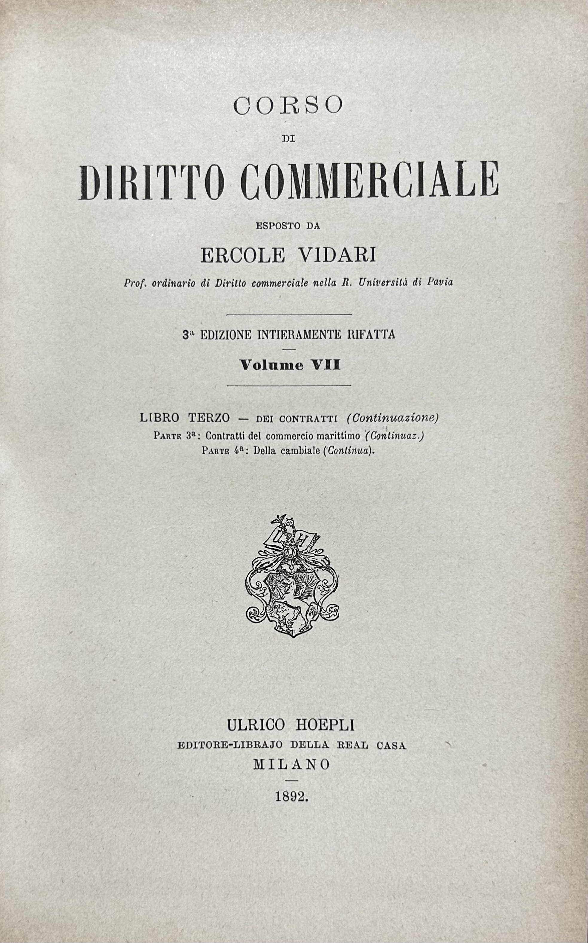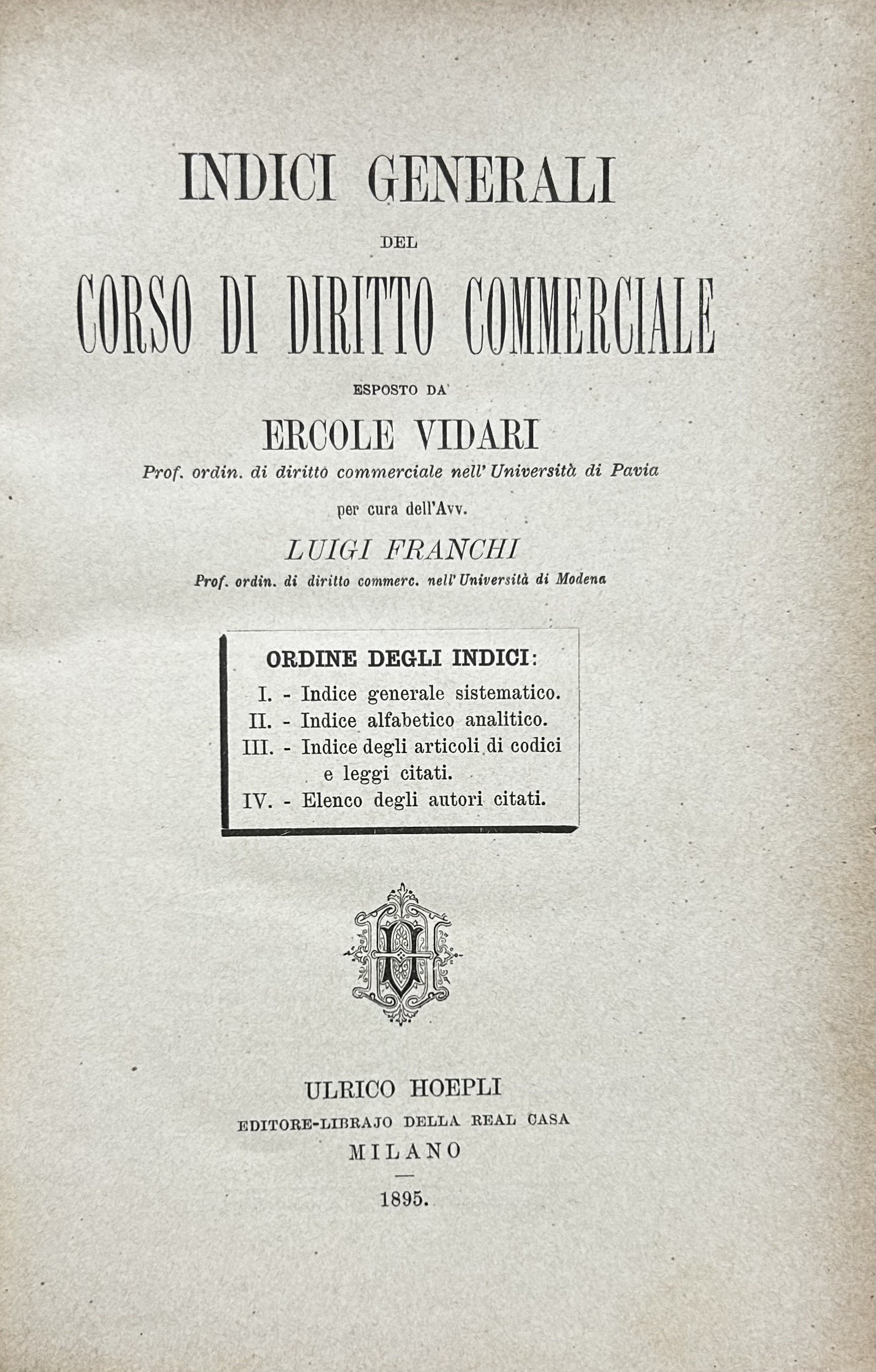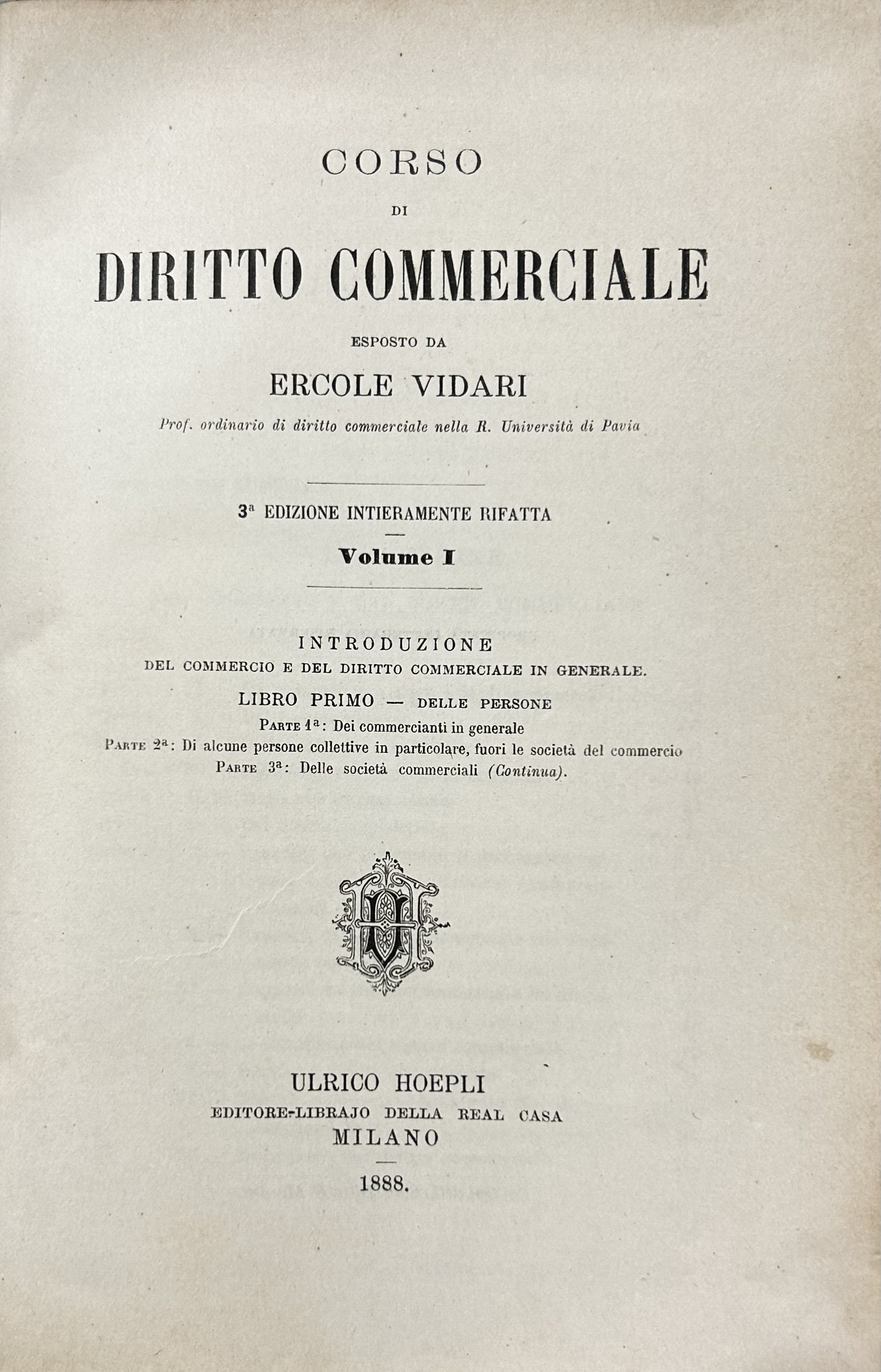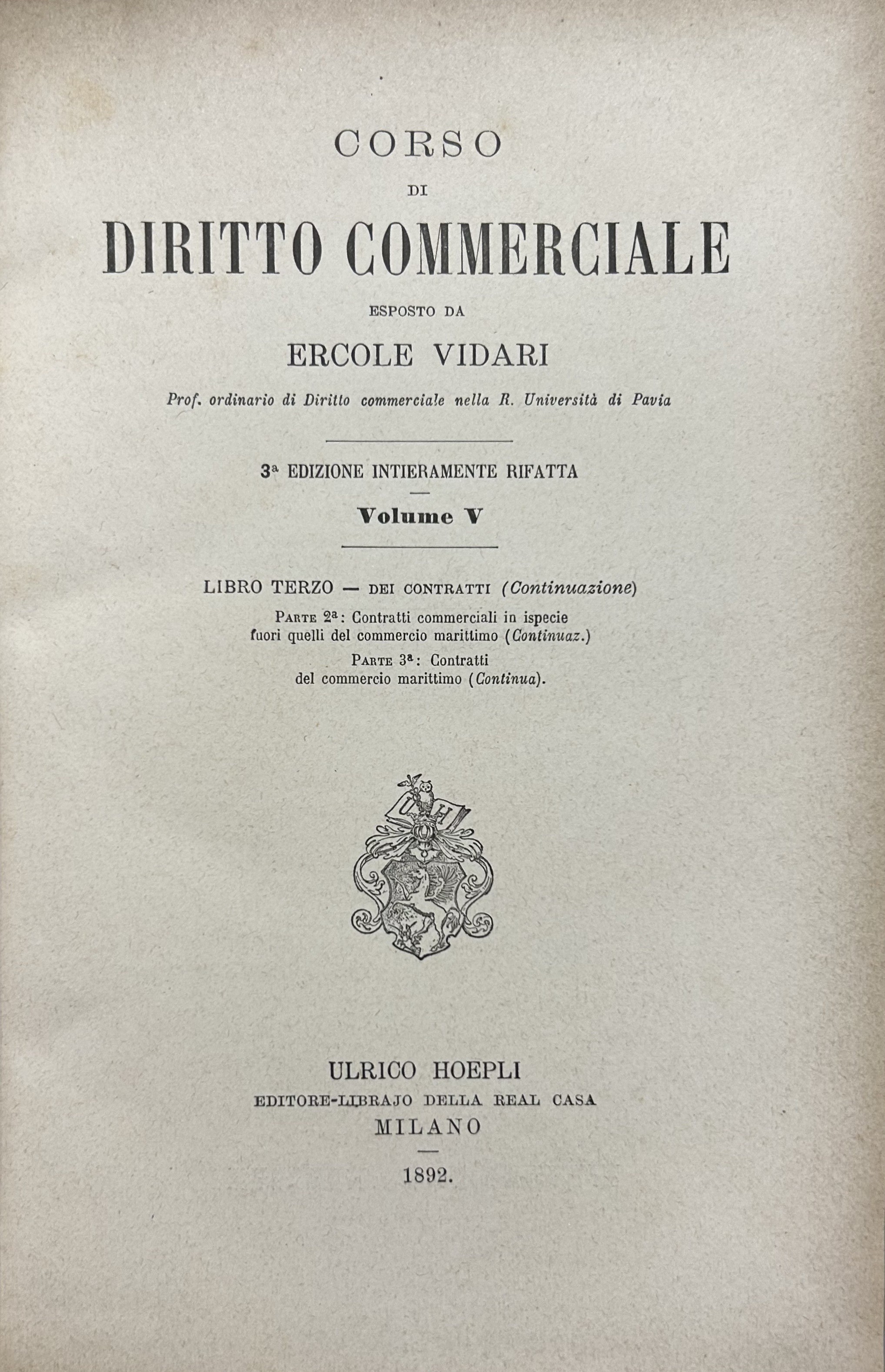 Corso di diritto commerciale. Vol. I - Introduzione del commercio e del diritto commerciale in generale: Libro Primo - Delle persone. Vol. II - Libro Primo - Delle persone; Libro Secondo - Delle cose. Vol. III - Libro Secondo - Delle cose; Libro Terzo - Dei contratti. Vol. IV - Libro Terzo - Dei contratti. Vol. V - Libro Terzo - Dei contratti. Vol. VI - Libro Terzo - Dei contratti. Vol. VII - Libro Terzo - Dei contratti. Vol. VIII - Libro Terzo - Dei contratti; Libro Quarto - Del fallimento e della bancarotta. Vol. IX - Del fallimento e della bancarotta; Libro Quinto - Delle azioni commerciali