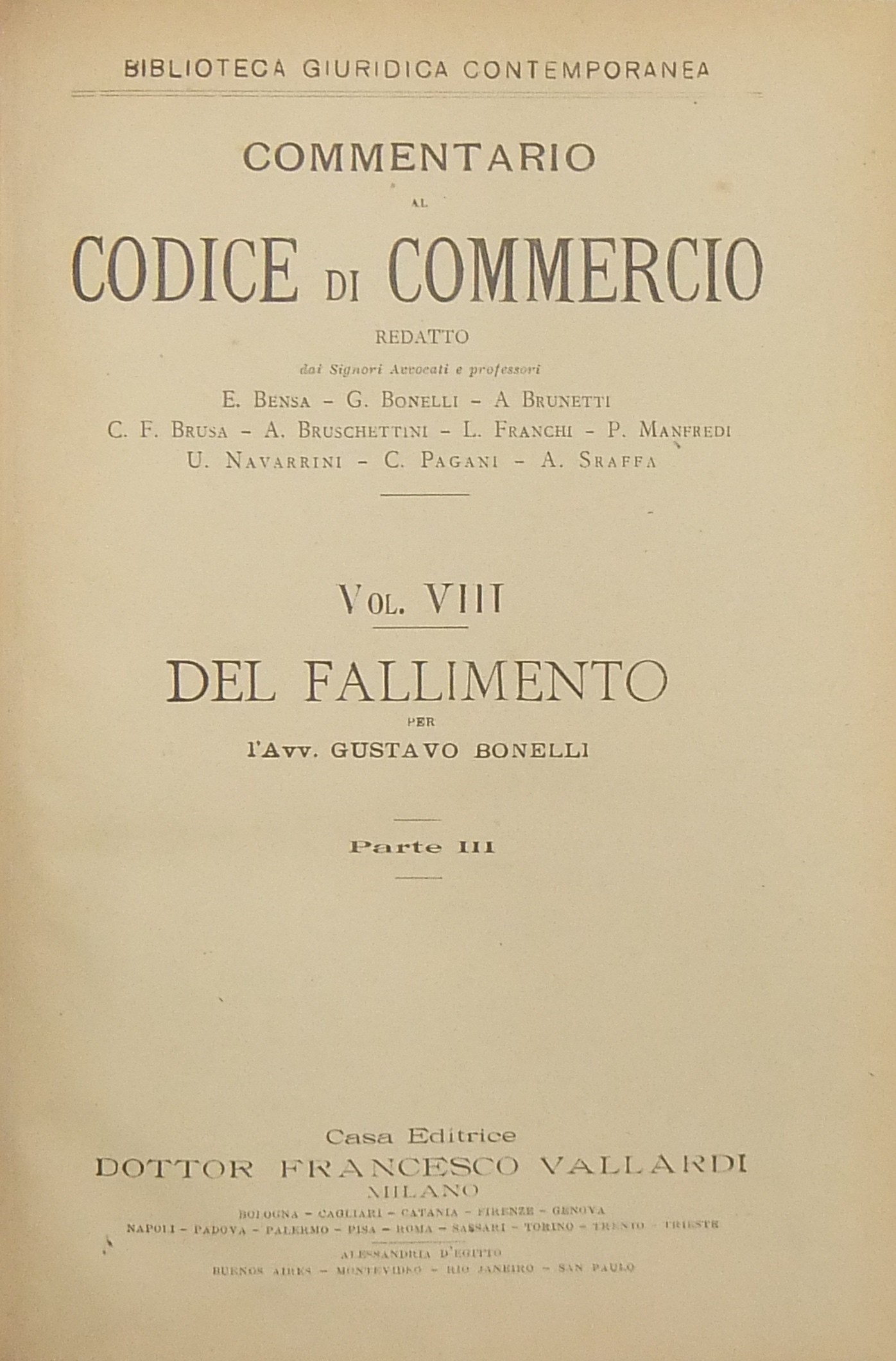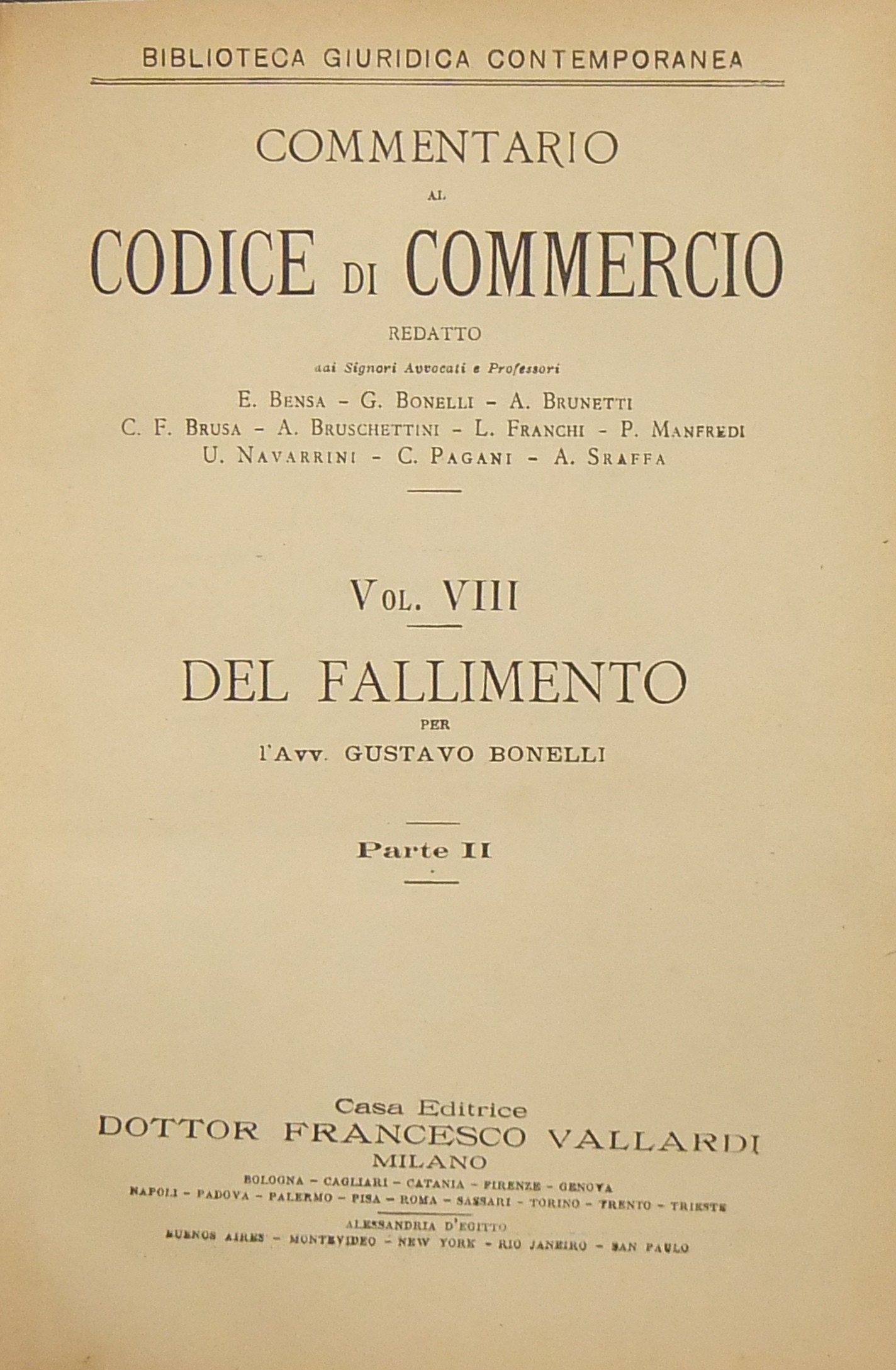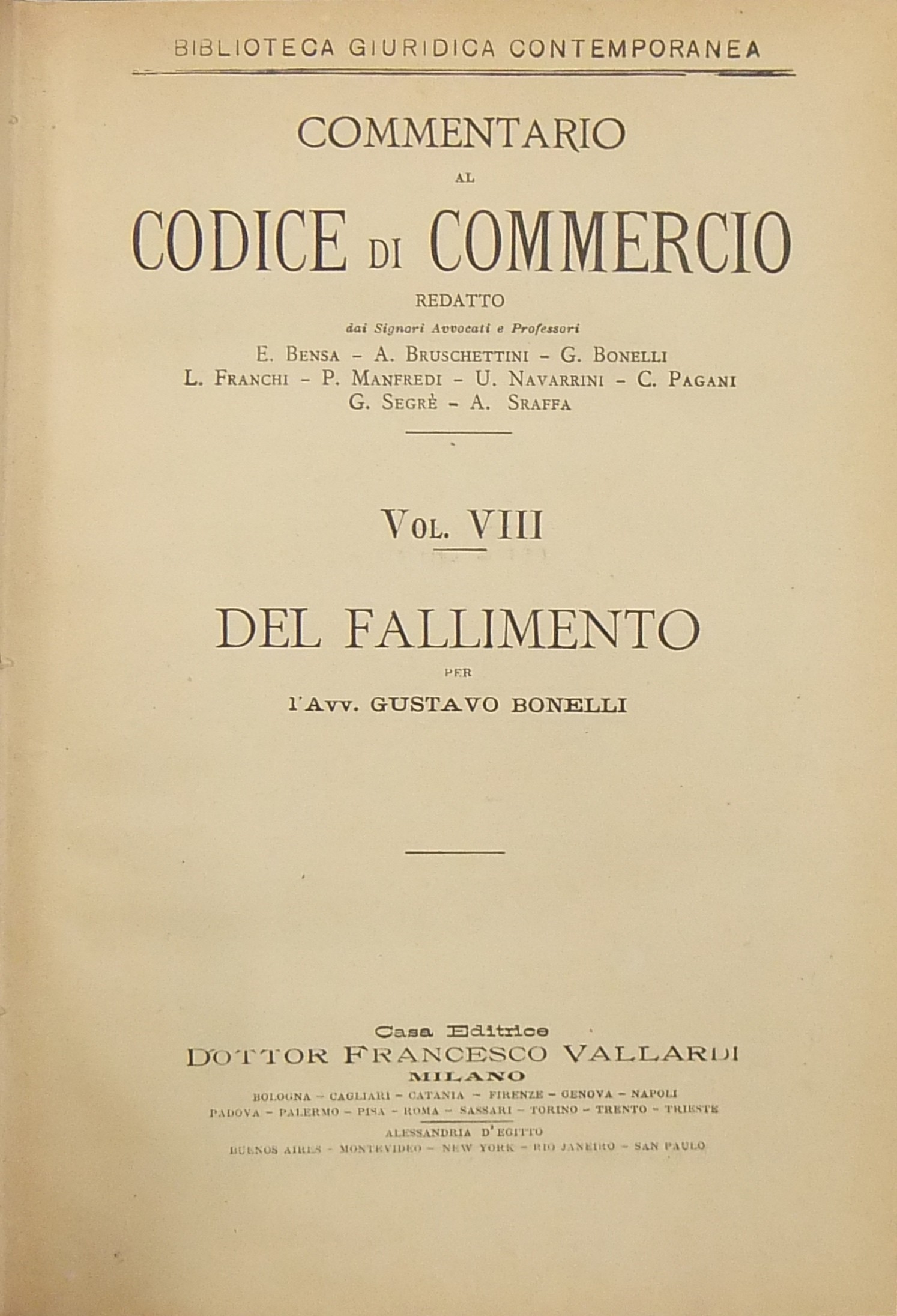 Vol. VIII del Commentario al Codice di Commercio redatto da: E. Bensa, G. Bonelli, A. Bruschettini, L. Franchi, P. Manfredi, U. Navarrini, C. Pagani, G. Segre, A Sraffa