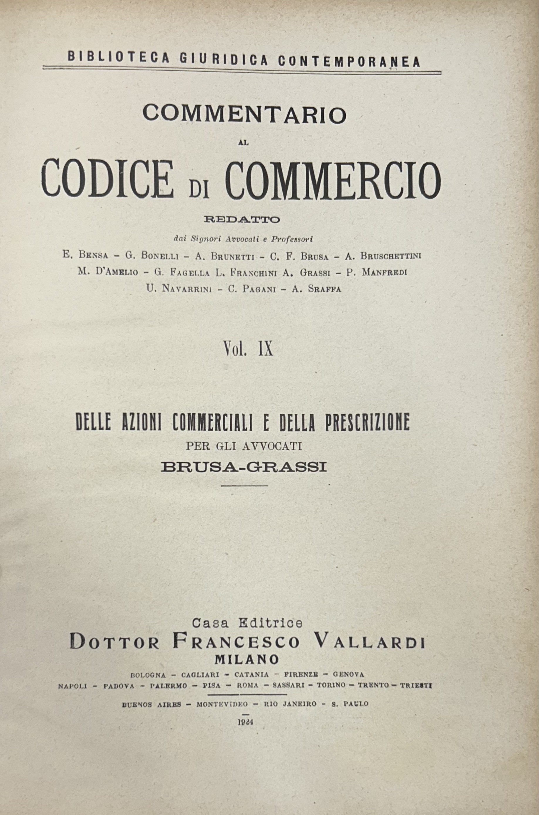 Collana: Biblioteca Giuridica Contemporanea. Commentario al Codice di Commercio redatto da E. Bensa G. Bonelli A. Brunetti C.F. Brusa A. Bruschettini L. Franchi P. Manfredi U. Navarrini C. Pagani A. Sraffa