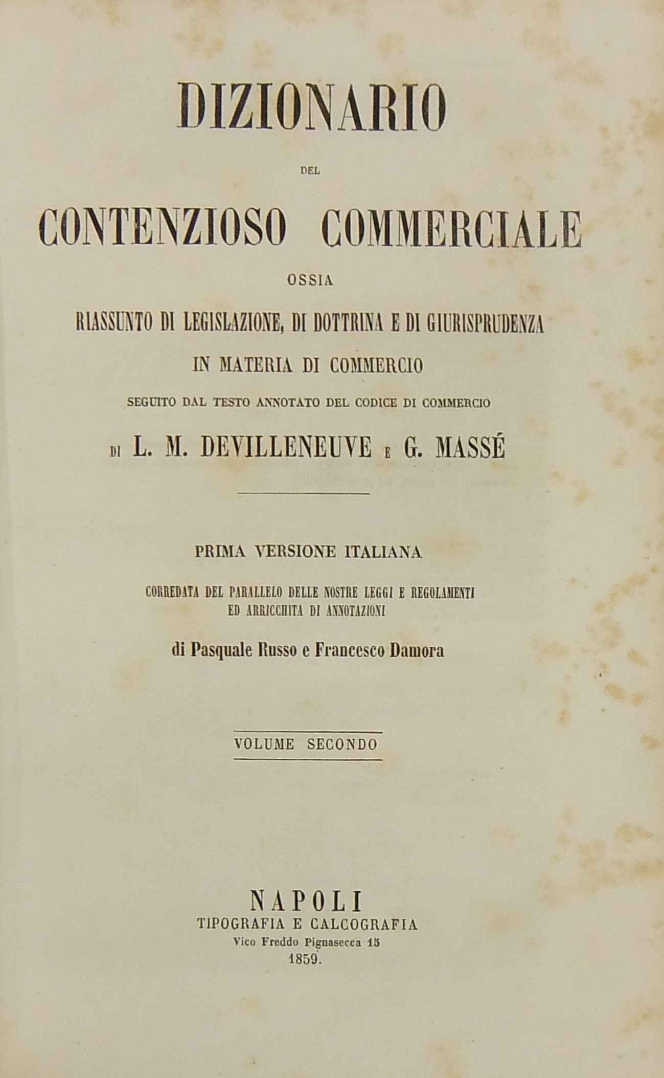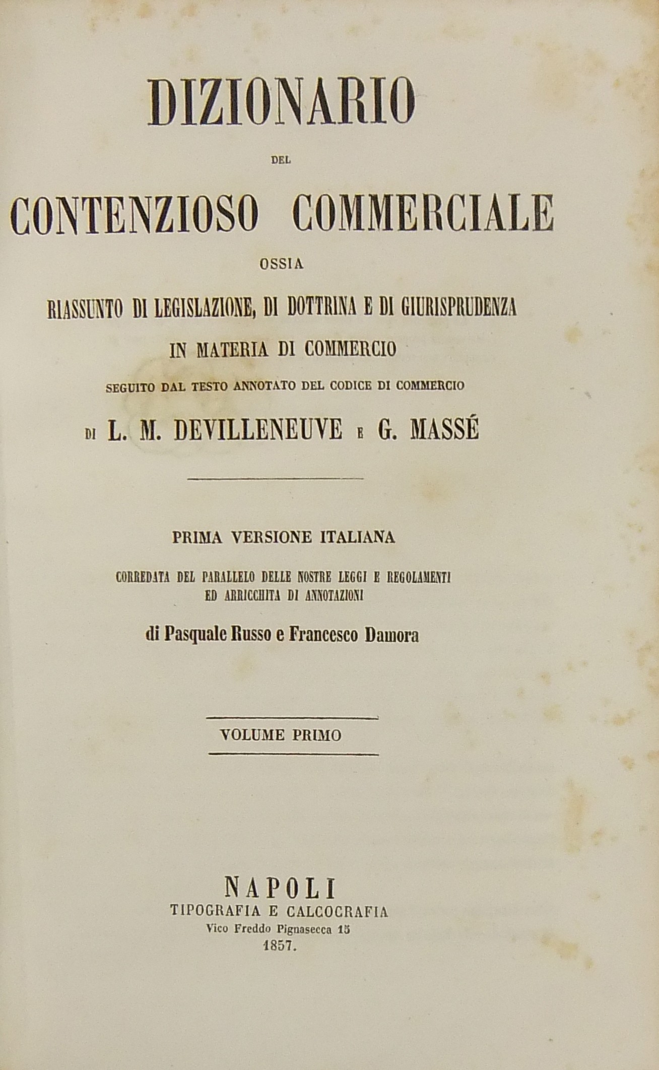 Dizionario del contenzioso commerciale ossia riassunto di legislazione, di dottrina e di giurisprudenza in materia di commercio seguito dal testo annotato del Codice di commercio. Prima versione italiana corredata del parallelo delle nostre leggi e regolamenti ed arricchita di annotazioni di Pasquale Russo e Francesco Damora