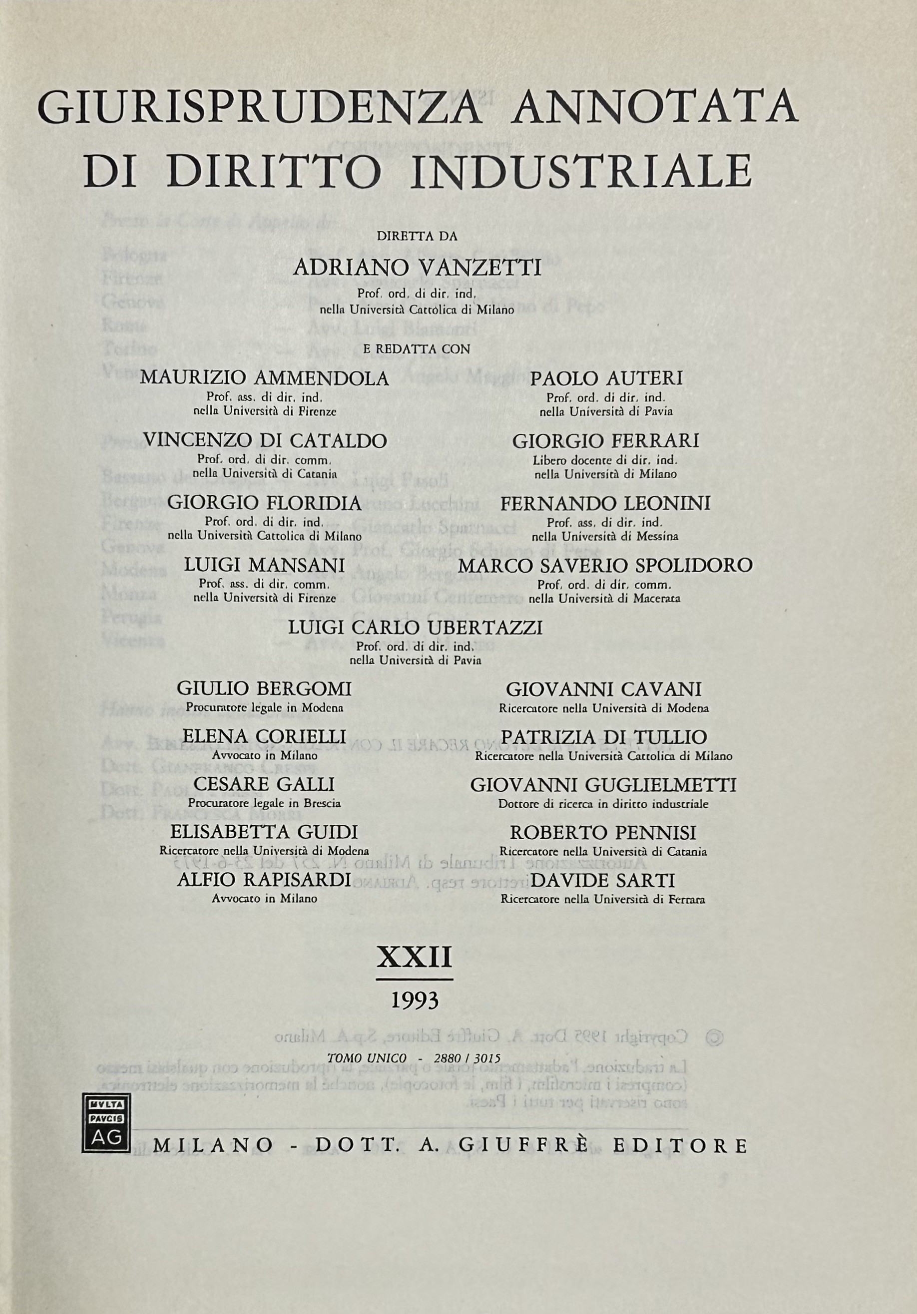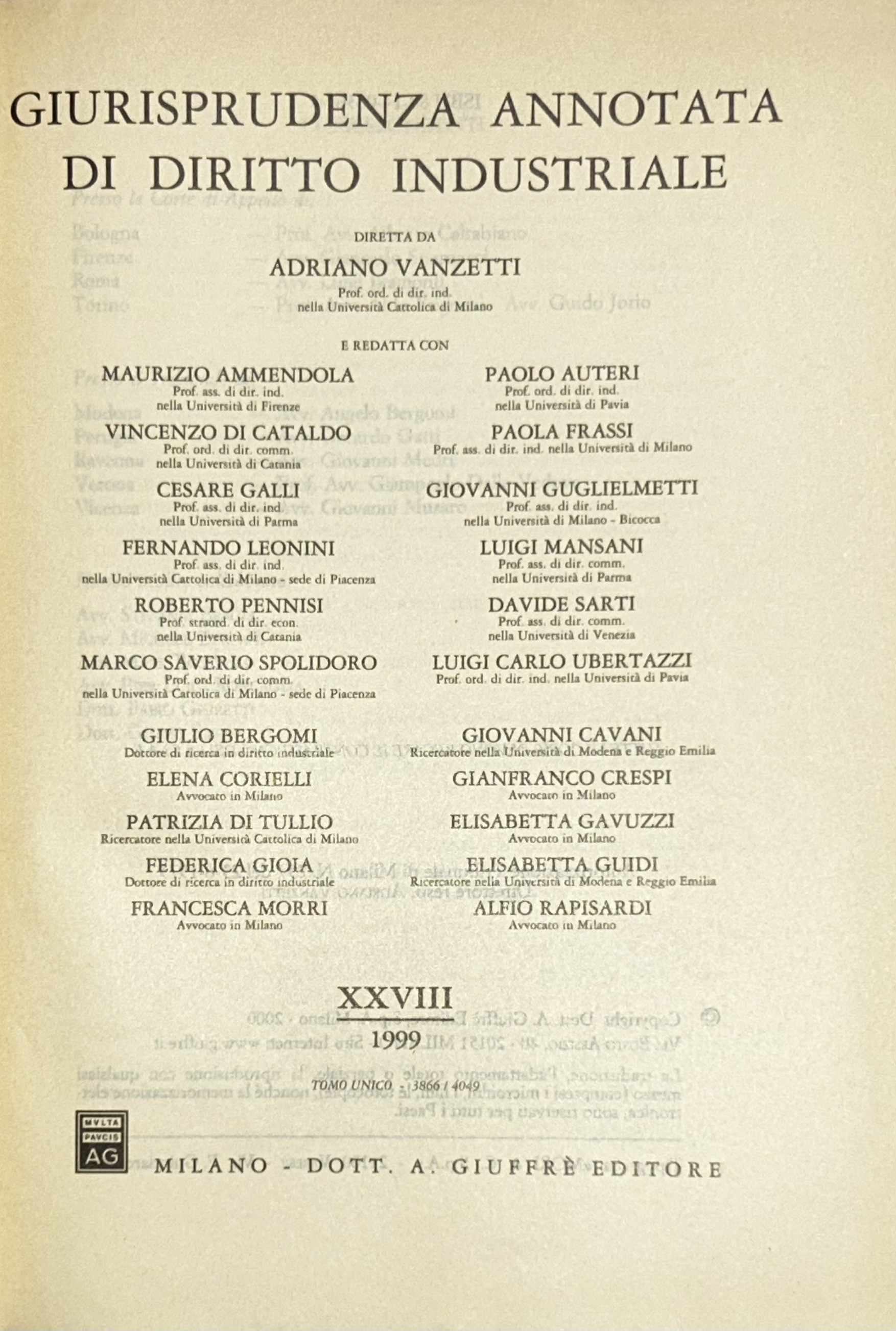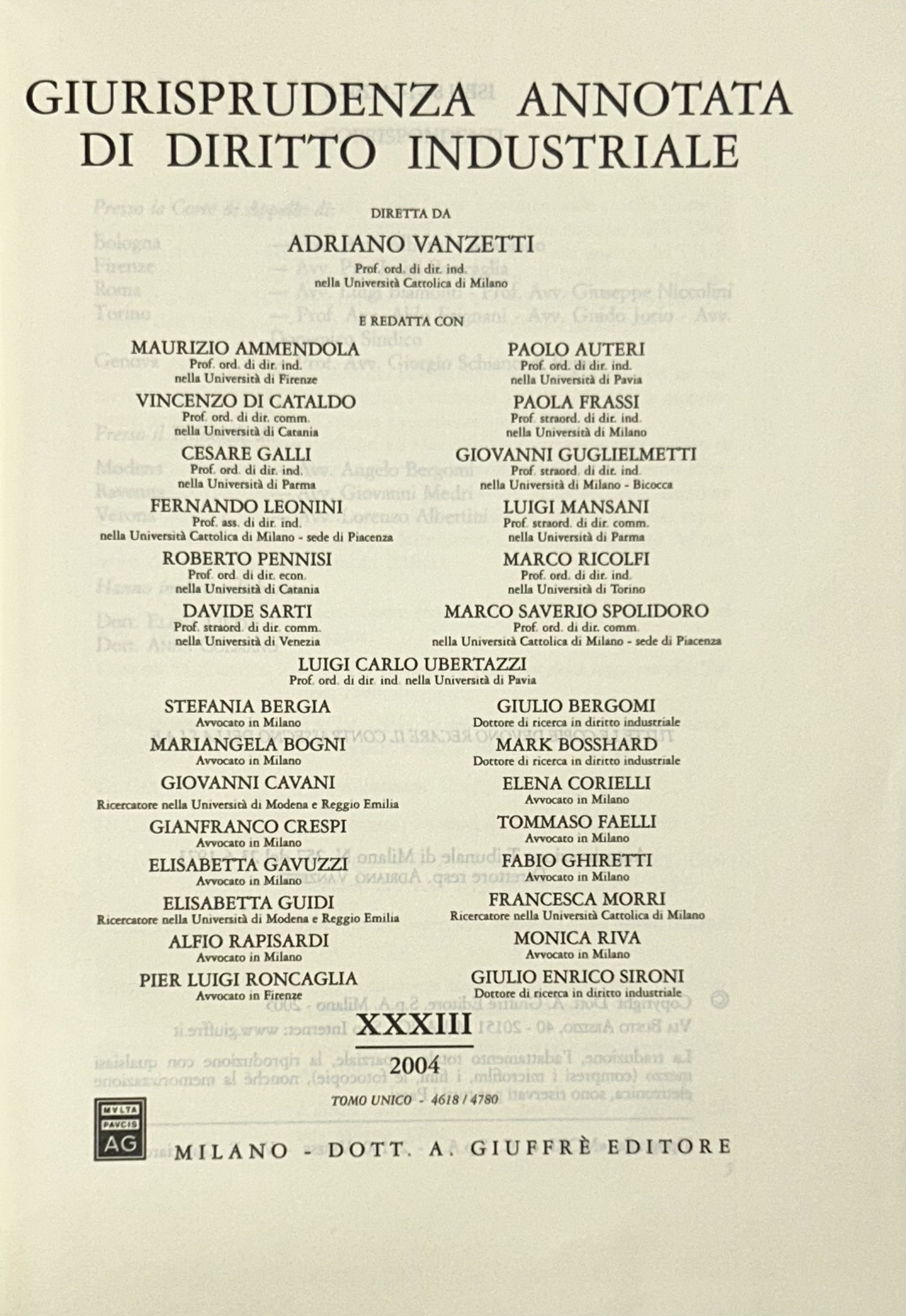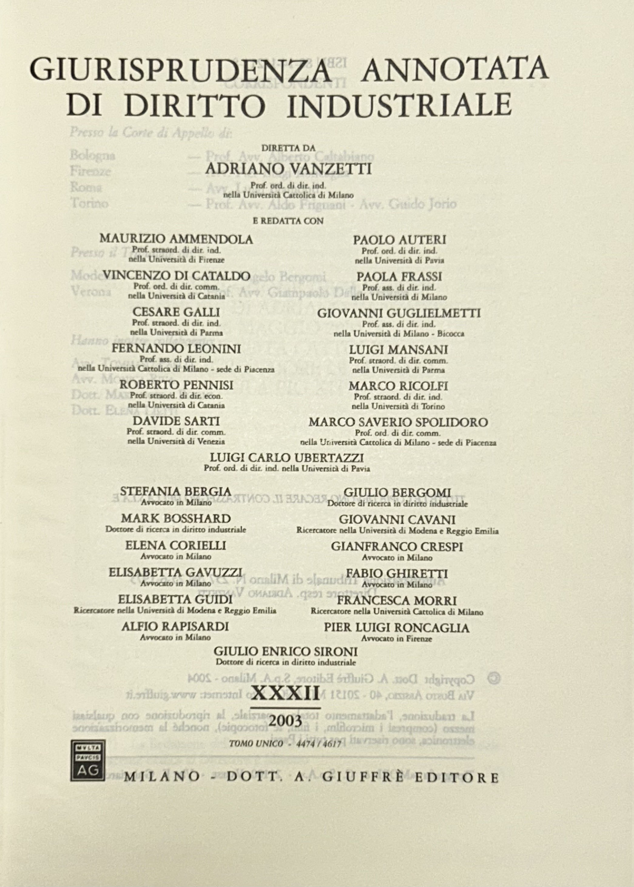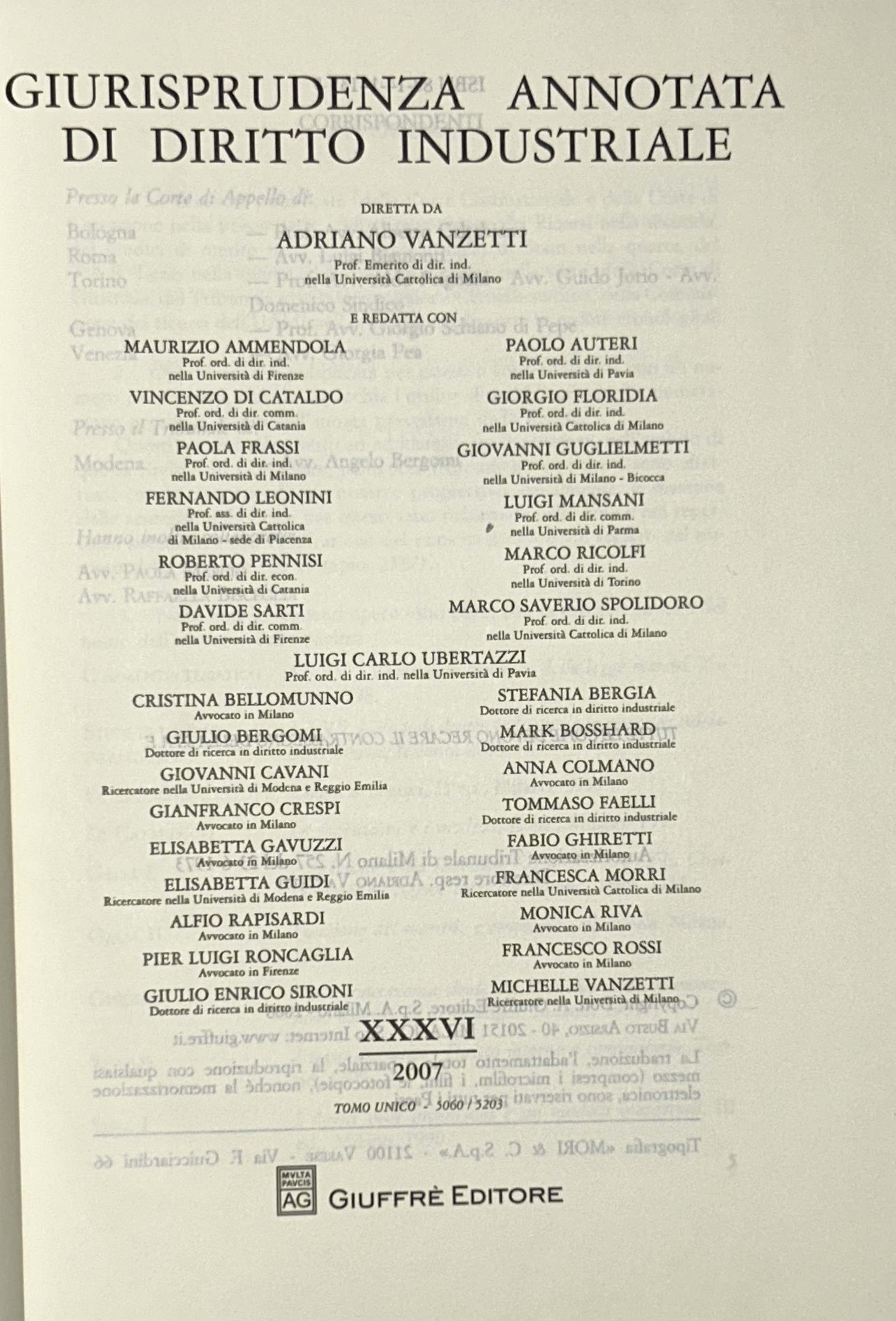 Giurisprudenza annotata di diritto industriale. Diretta da Adriano Vanzetti. Anno VIII - 1979 - Anno XXXVI - 2007