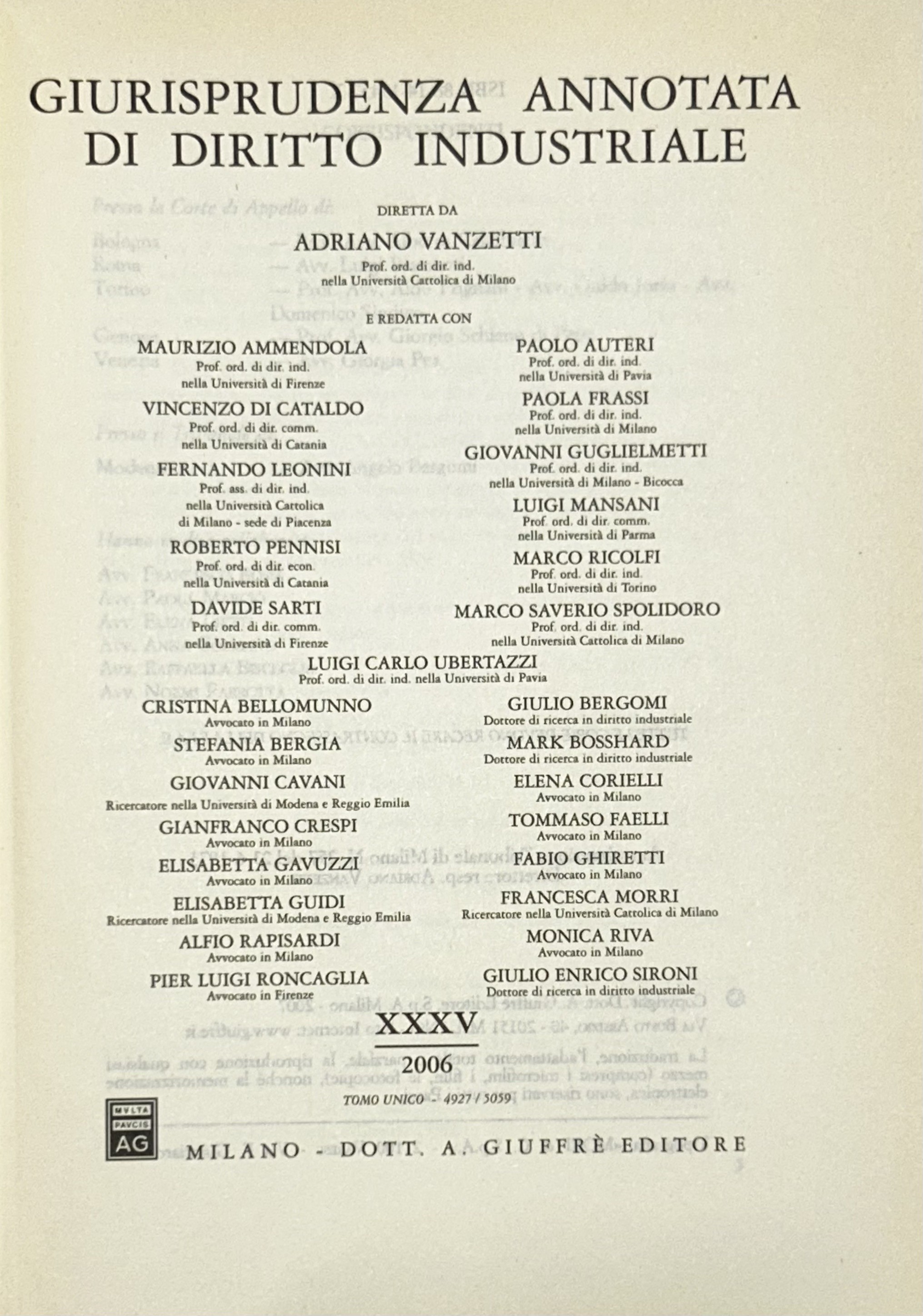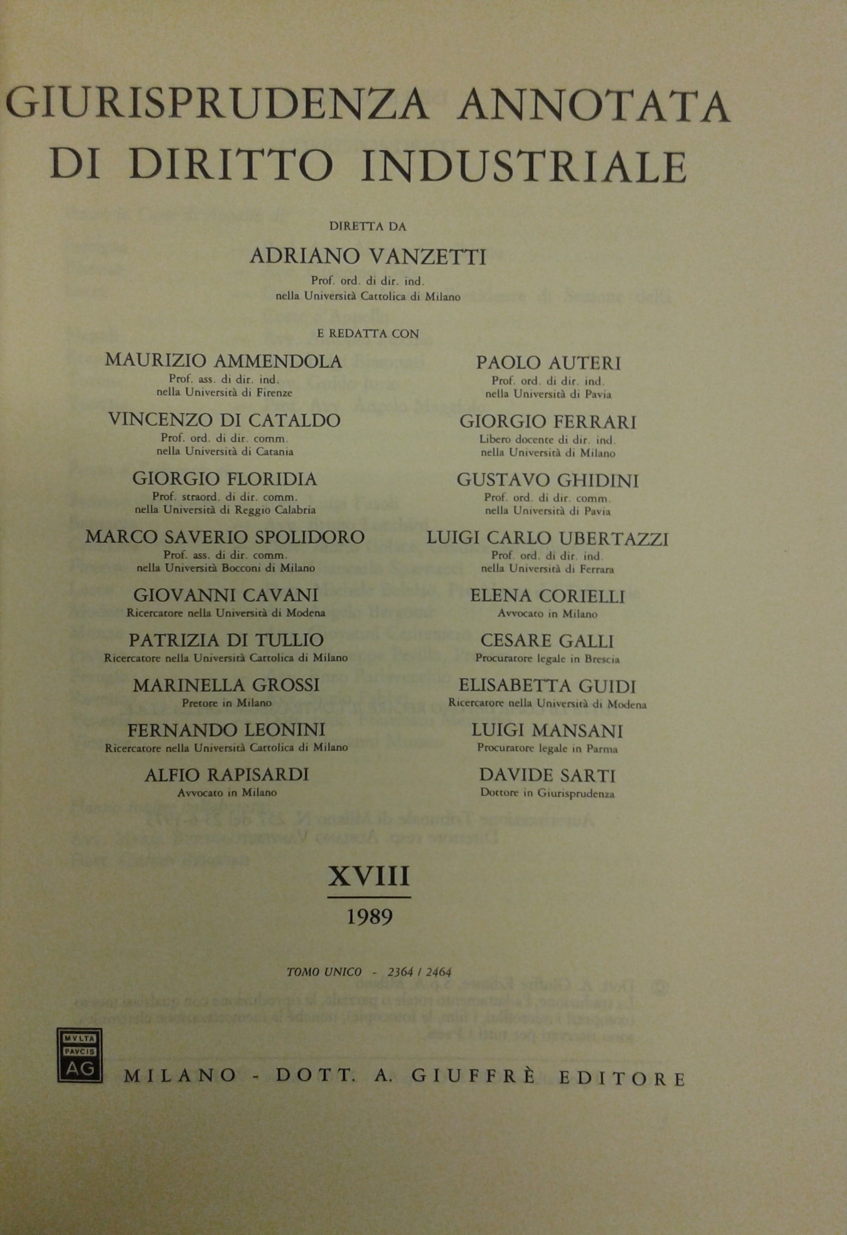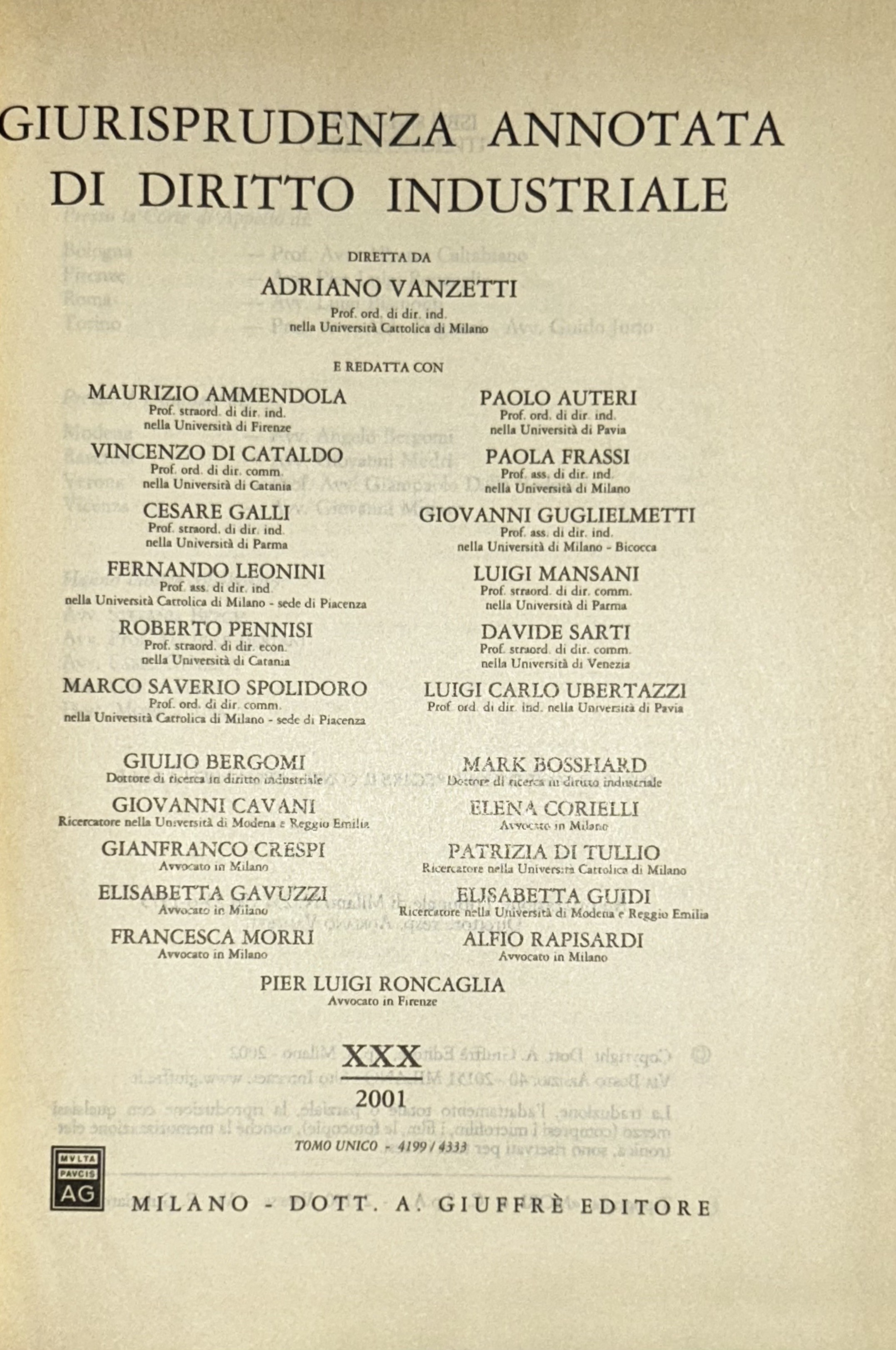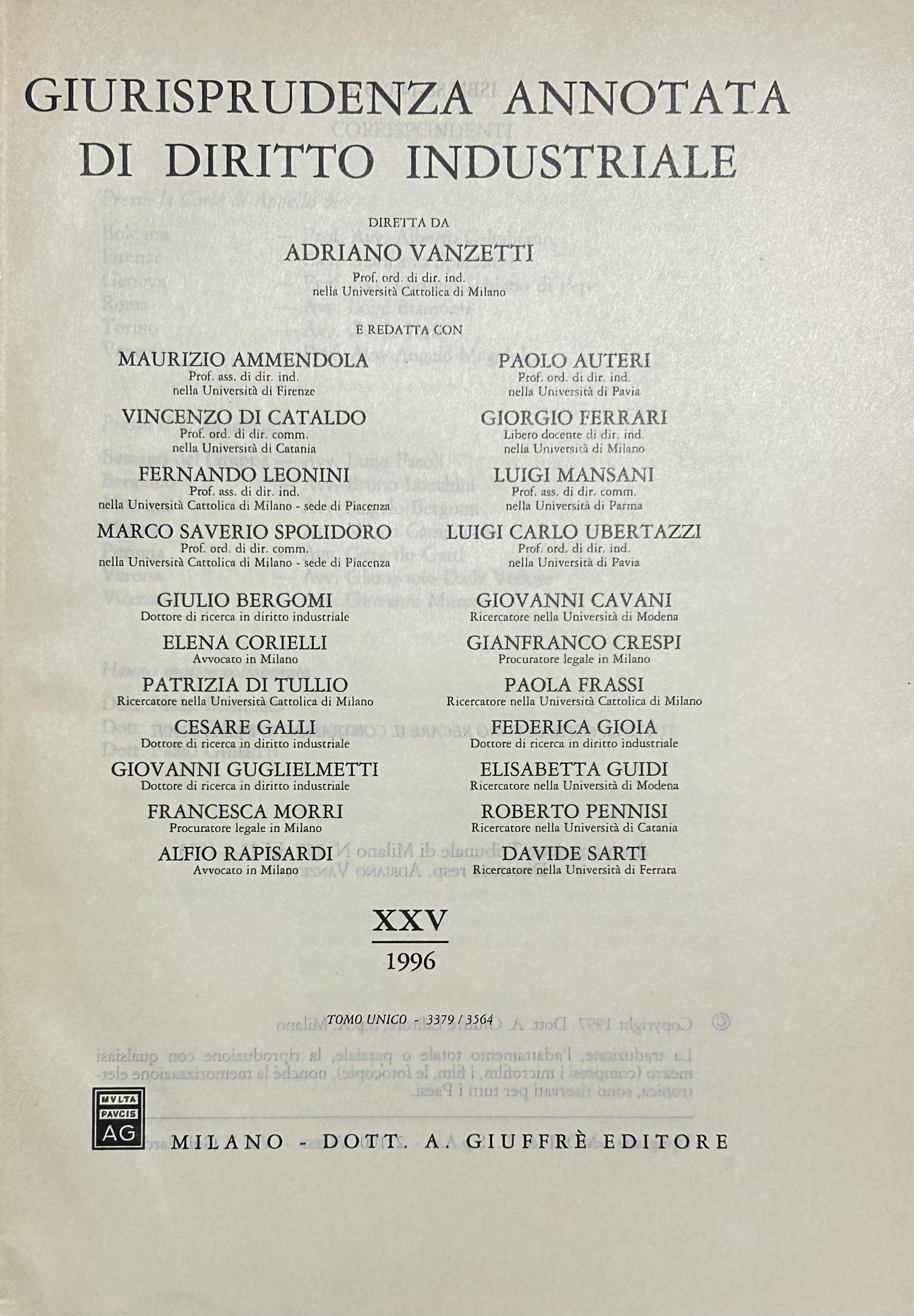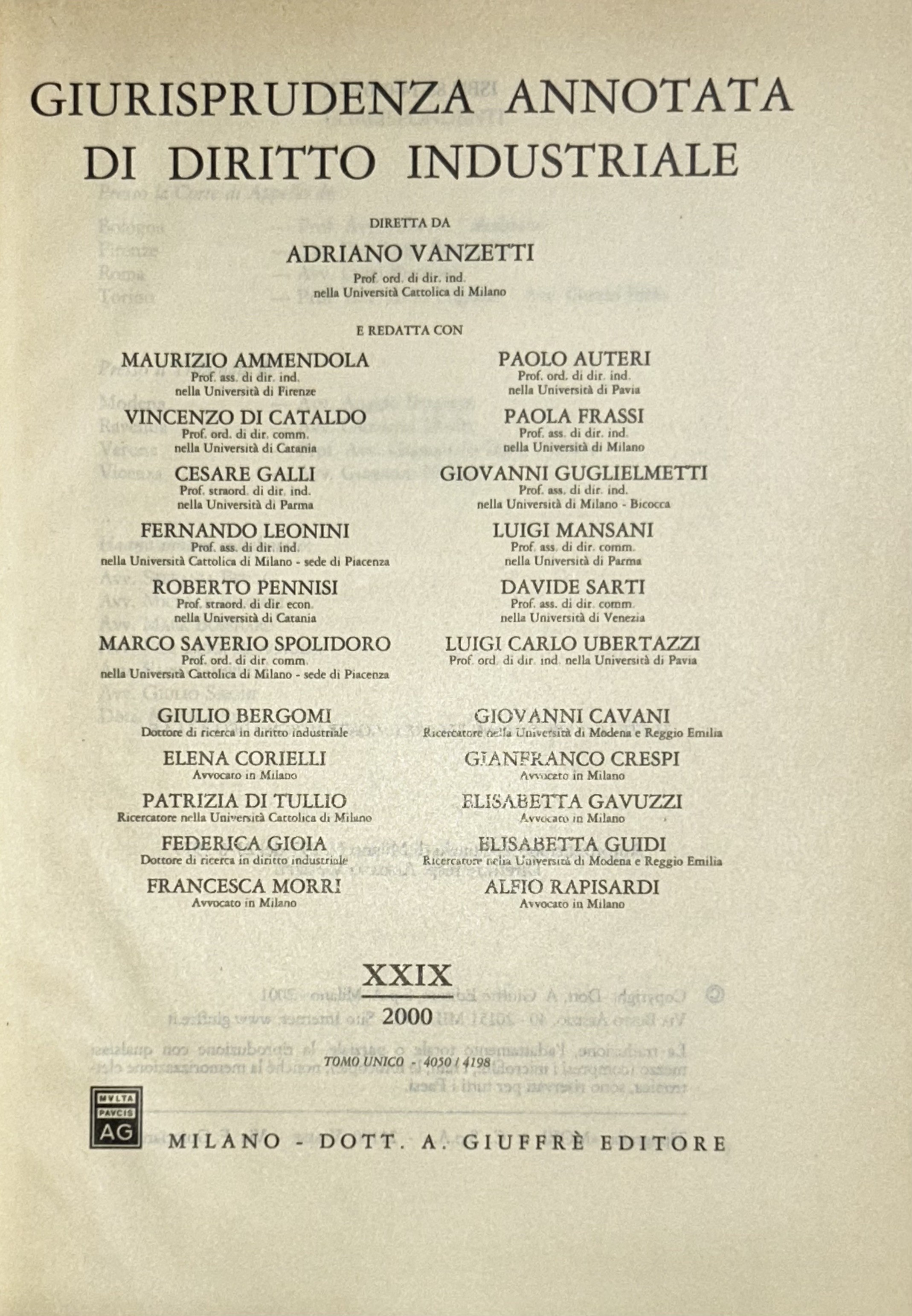 Giurisprudenza annotata di diritto industriale. Diretta da Adriano Vanzetti. Anno VIII - 1979 - Anno XXXVI - 2007