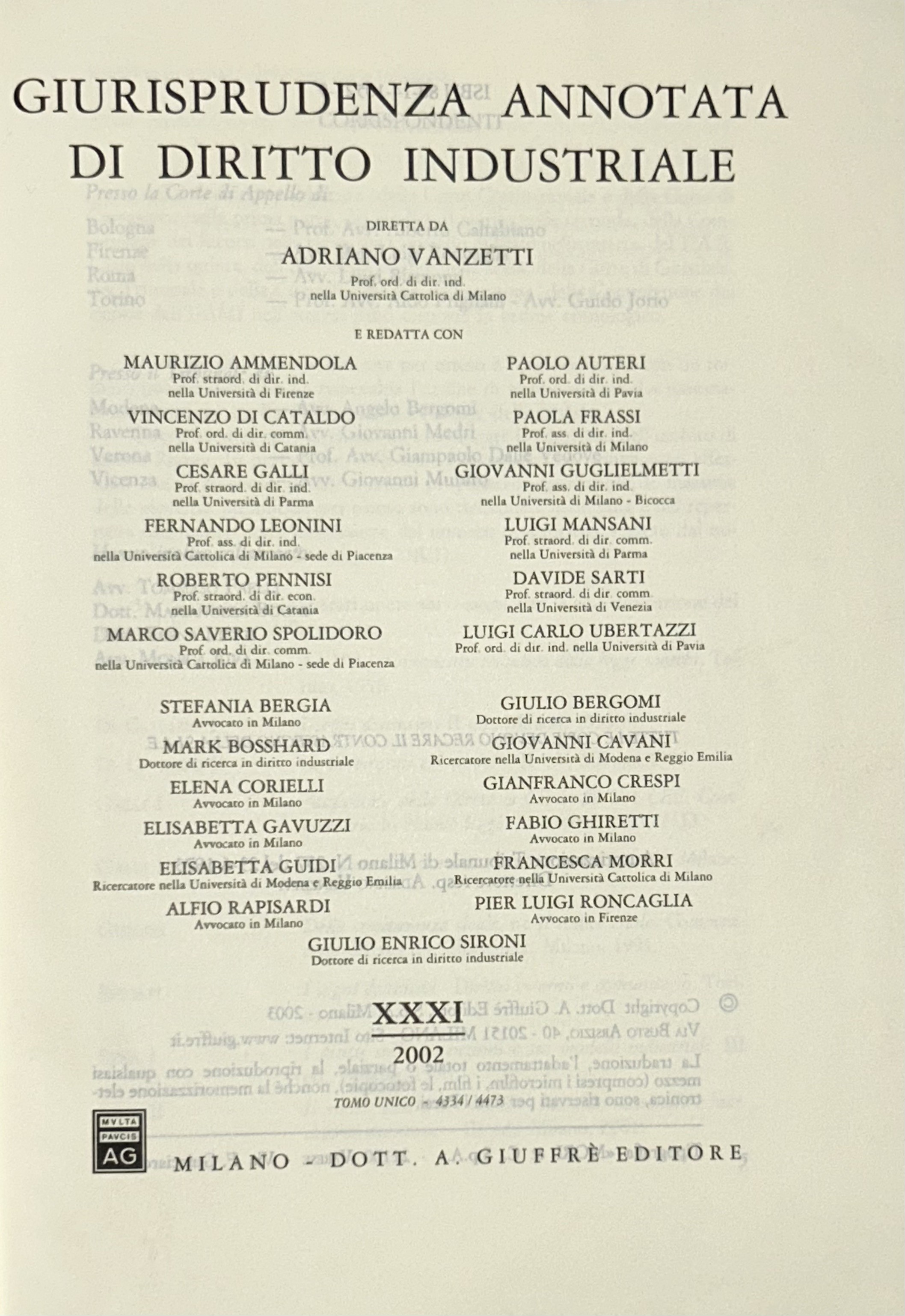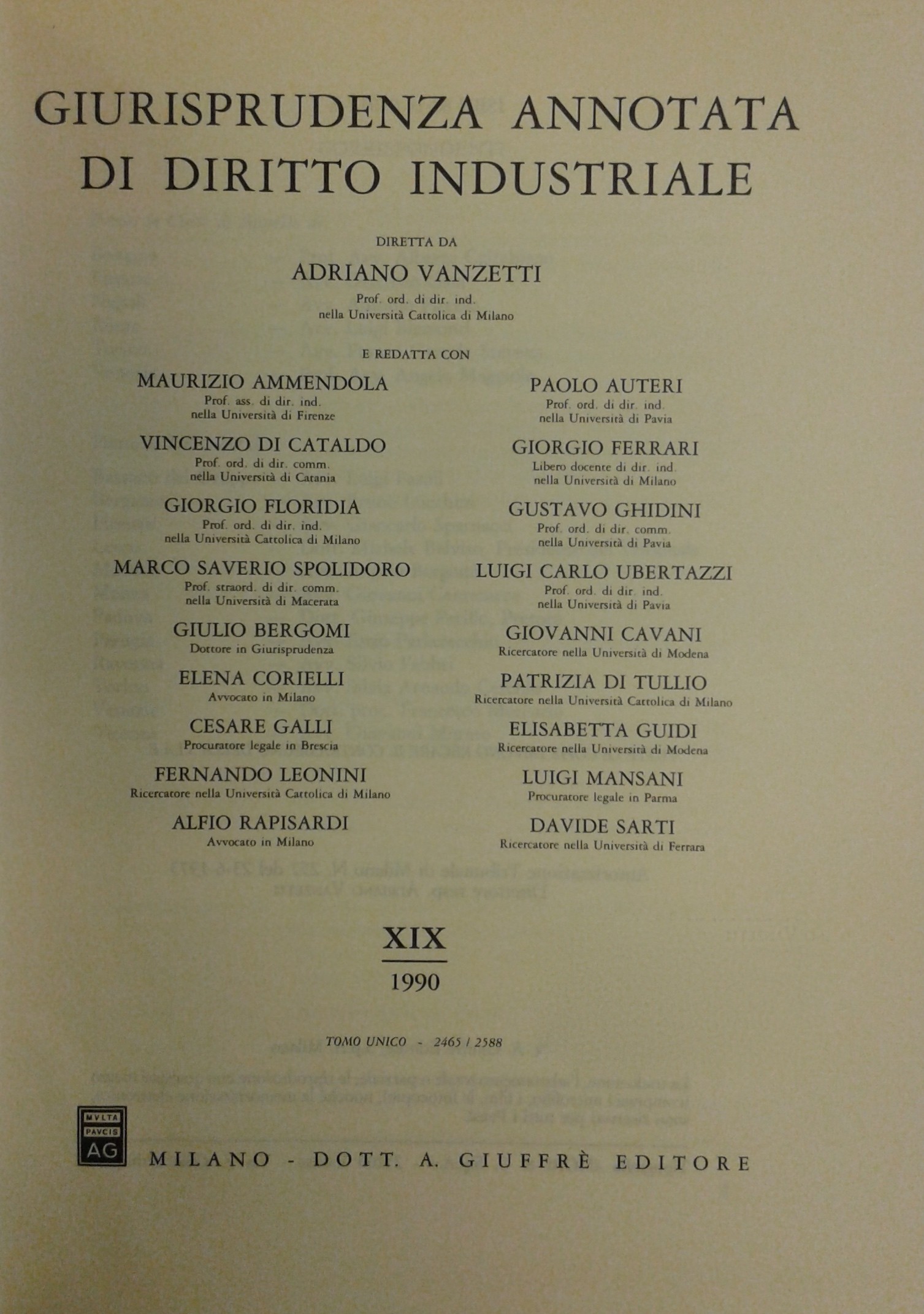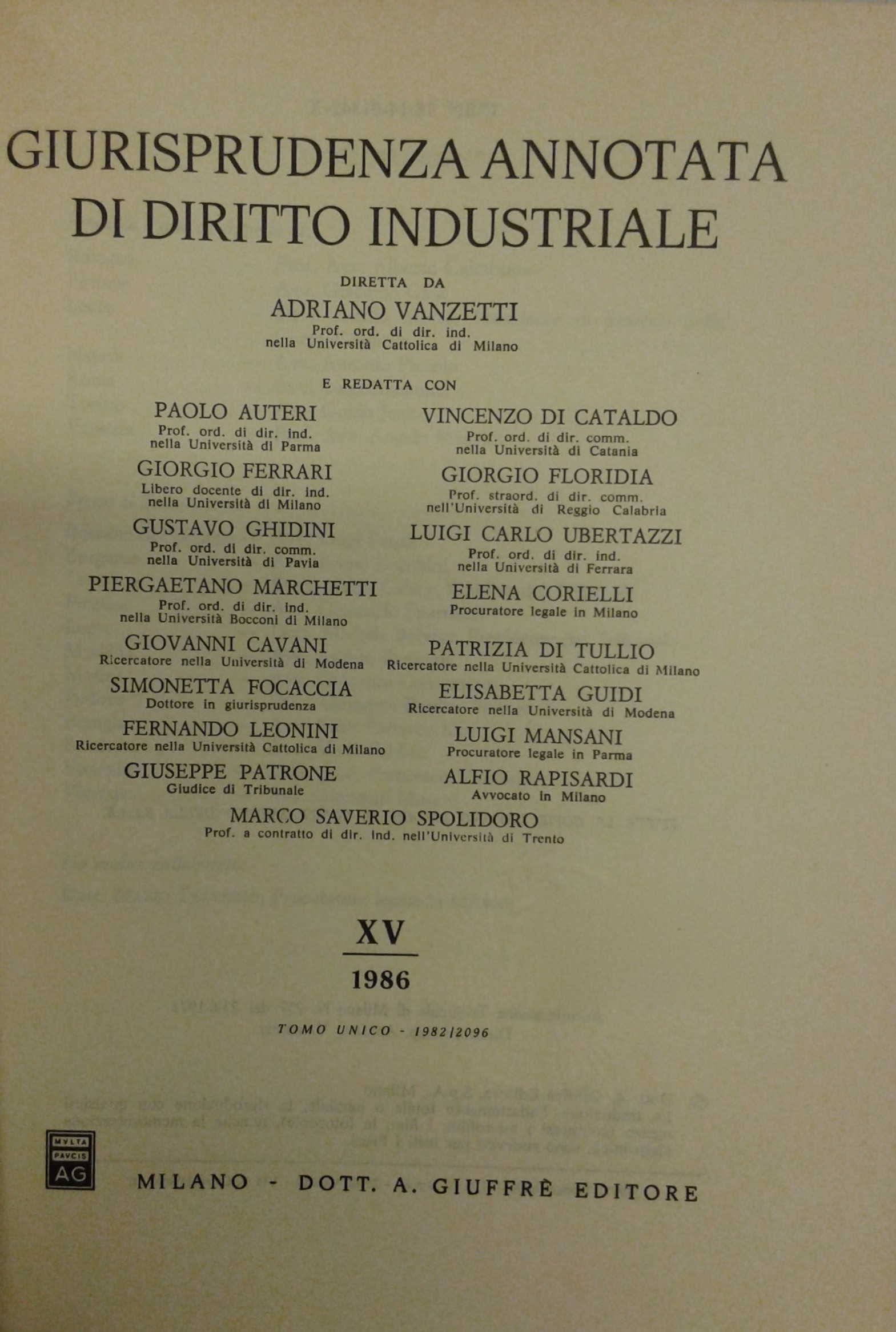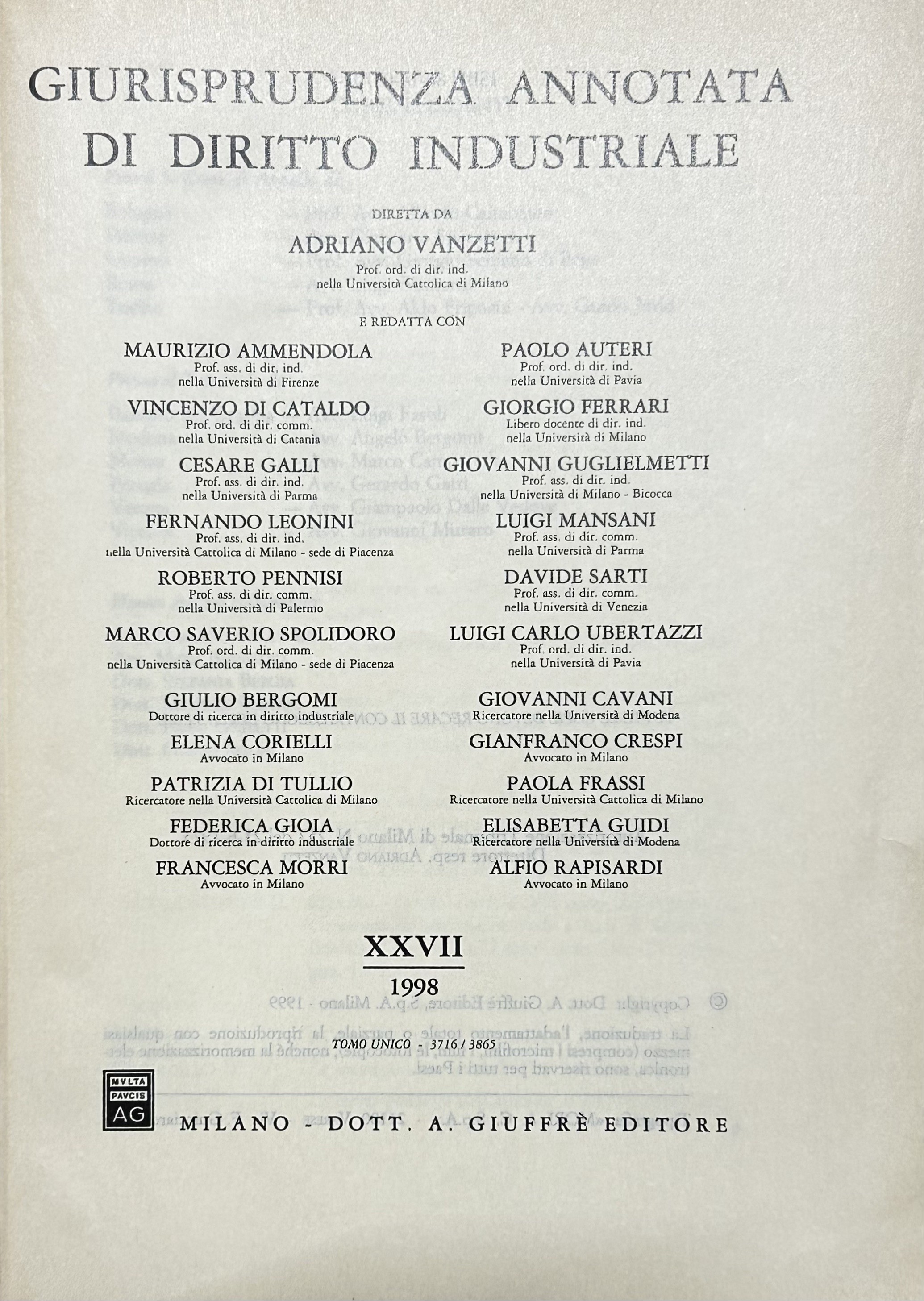 Giurisprudenza annotata di diritto industriale. Diretta da Adriano Vanzetti. Anno VIII - 1979 - Anno XXXVI - 2007