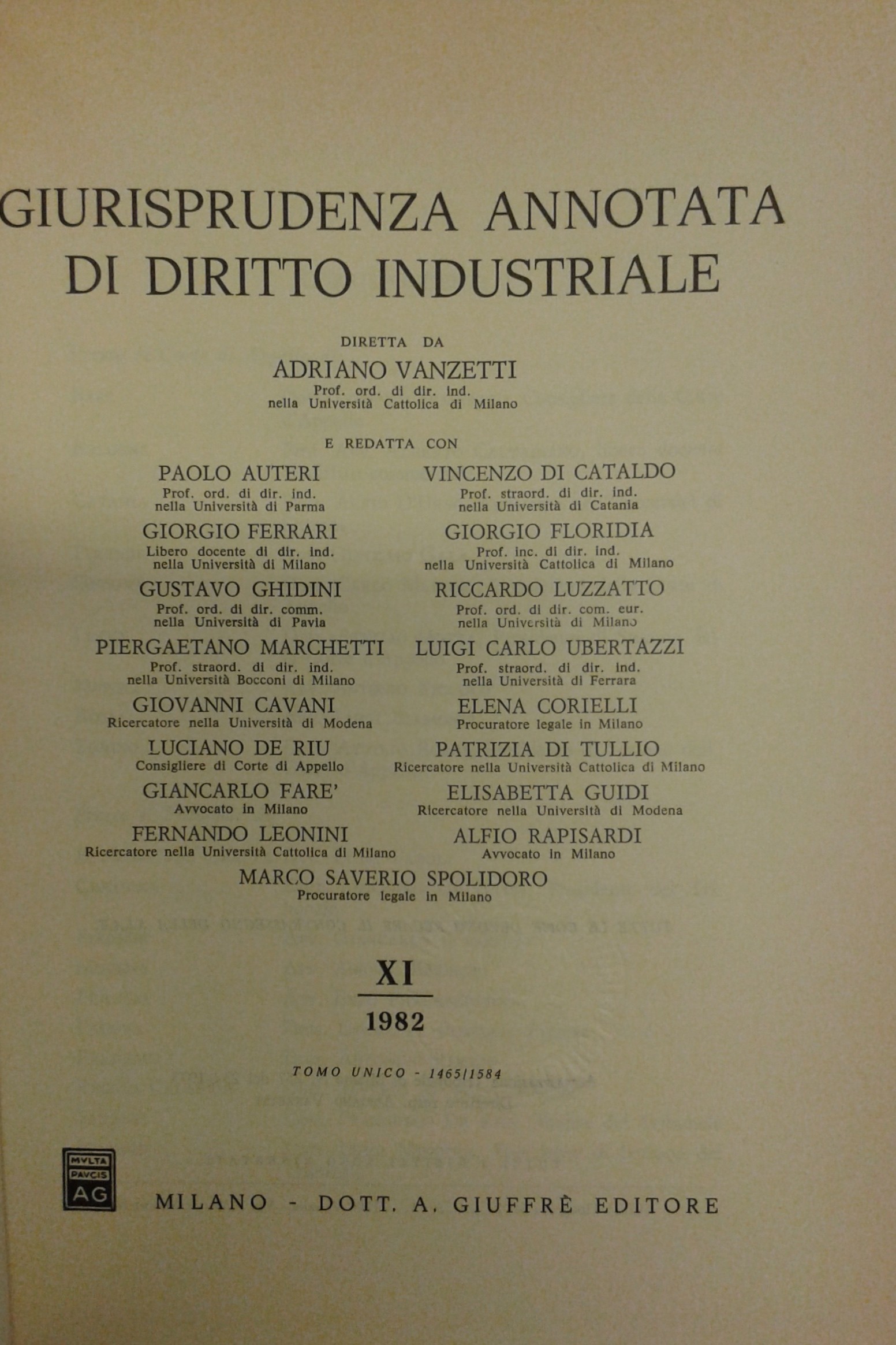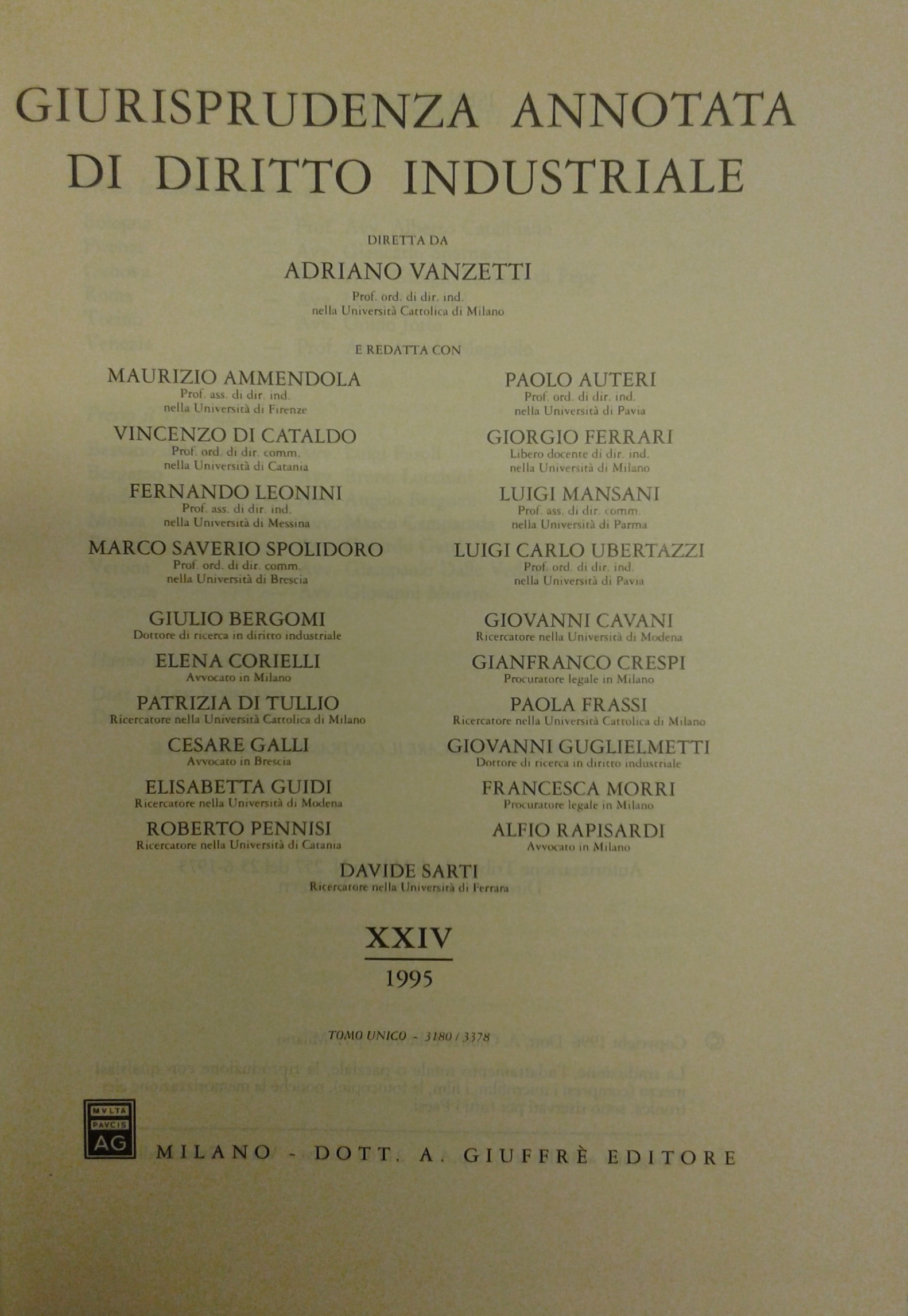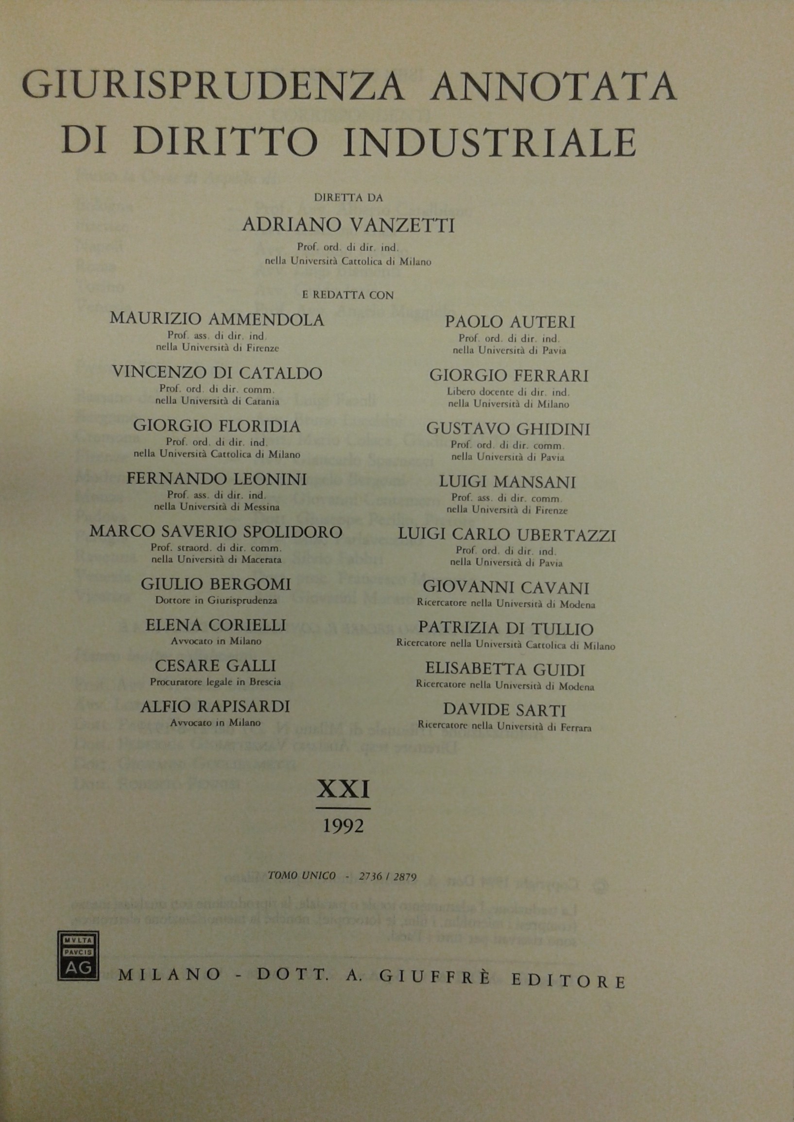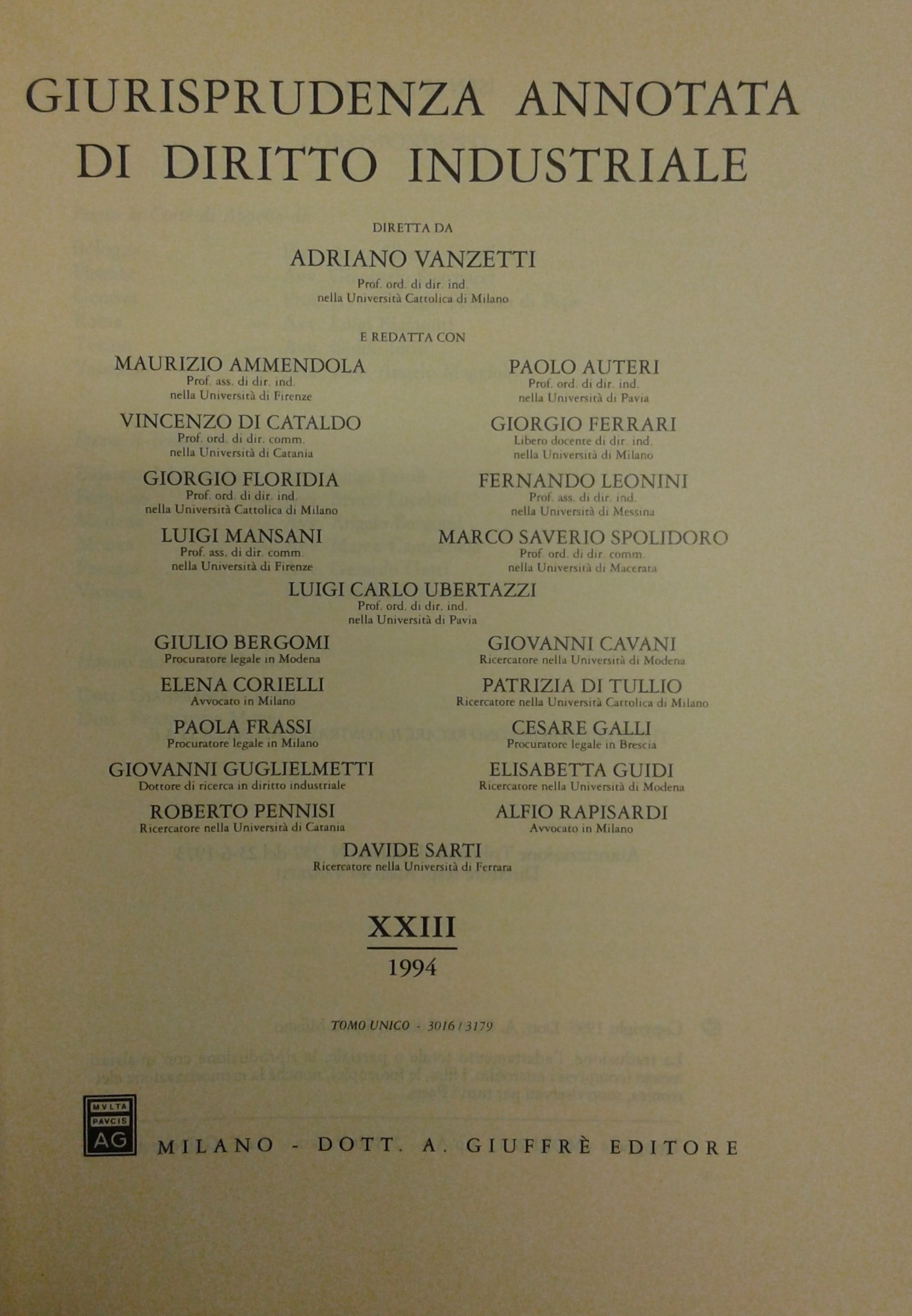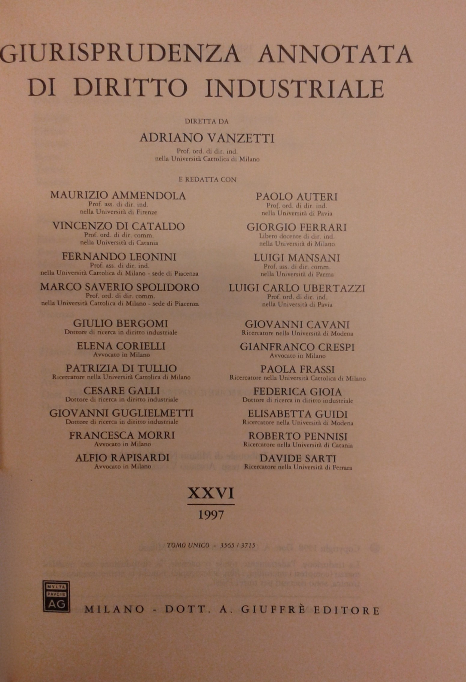 Giurisprudenza annotata di diritto industriale. Diretta da Adriano Vanzetti. Anno VIII - 1979 - Anno XXXVI - 2007