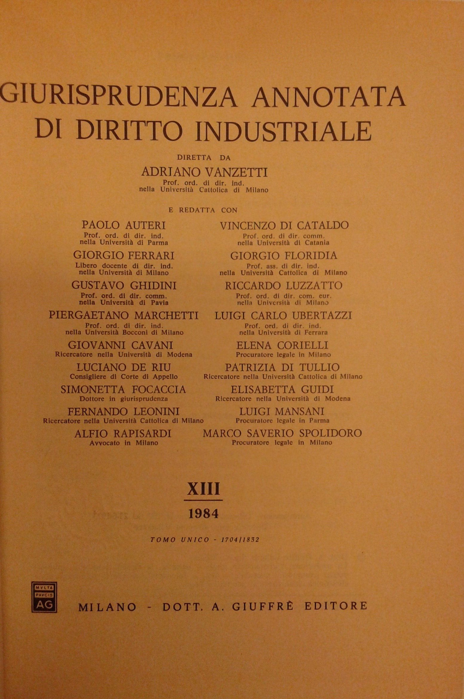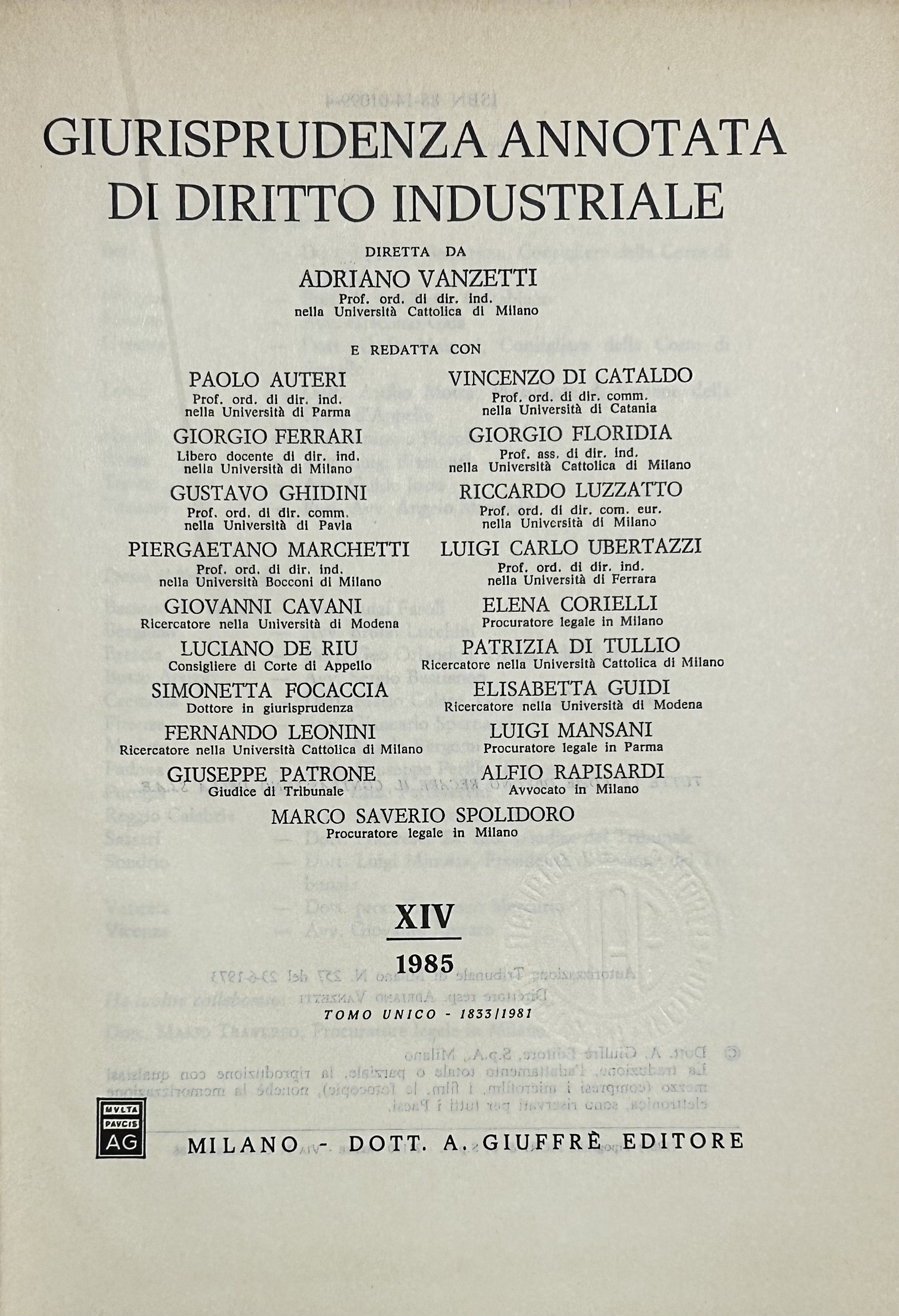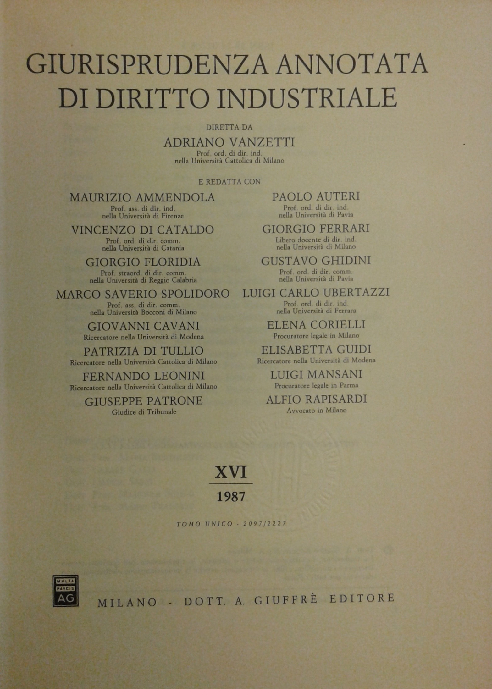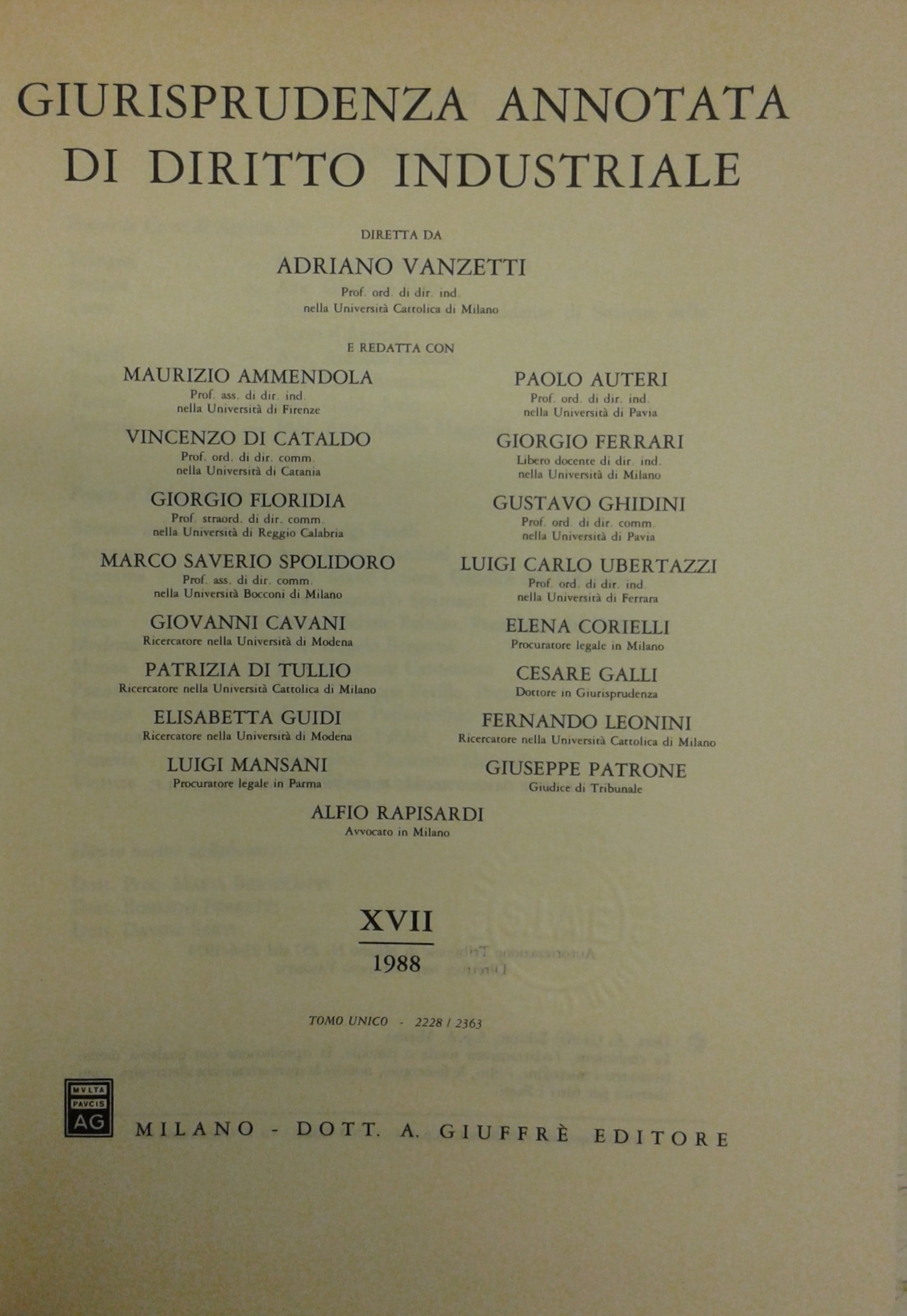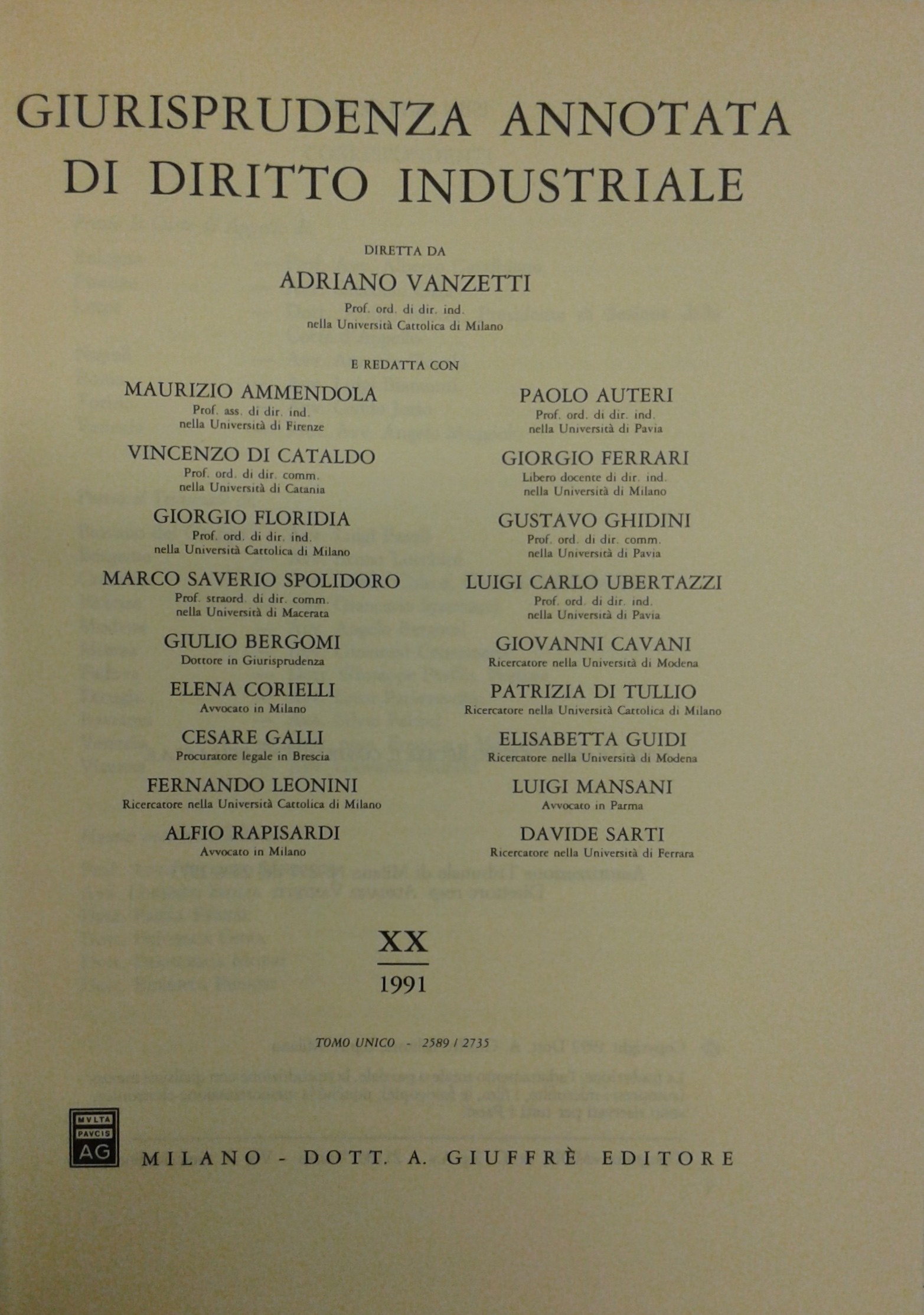 Giurisprudenza annotata di diritto industriale. Diretta da Adriano Vanzetti. Anno VIII - 1979 - Anno XXXVI - 2007