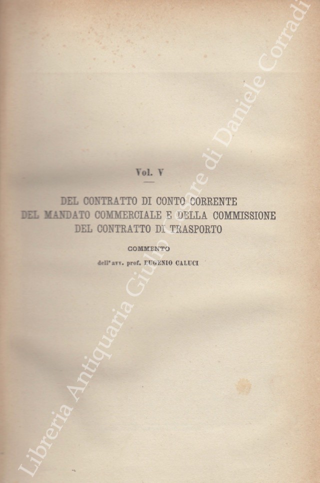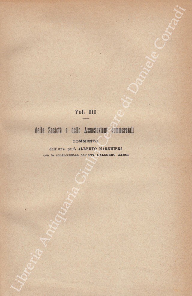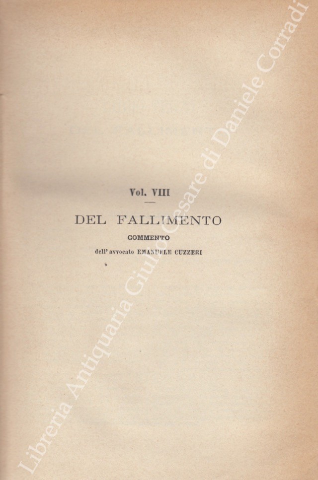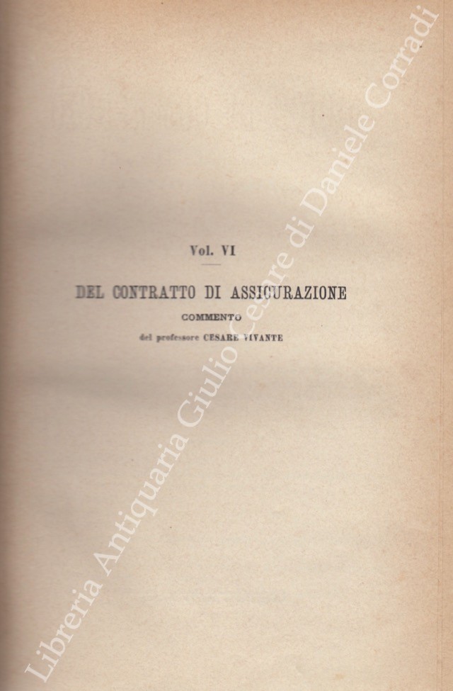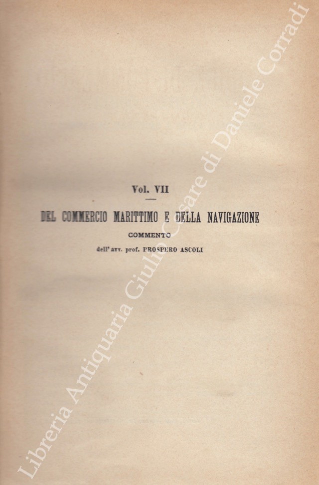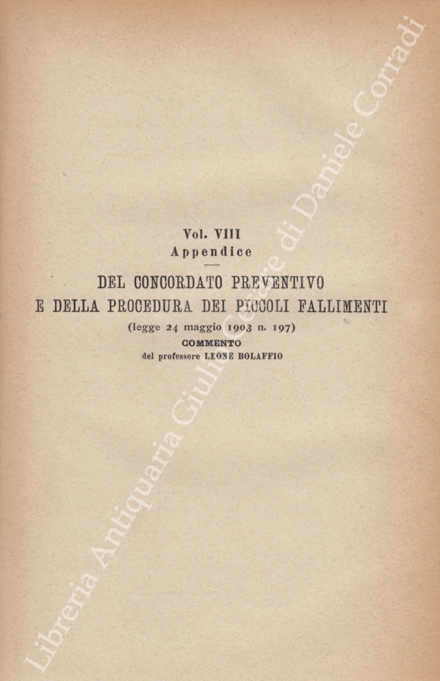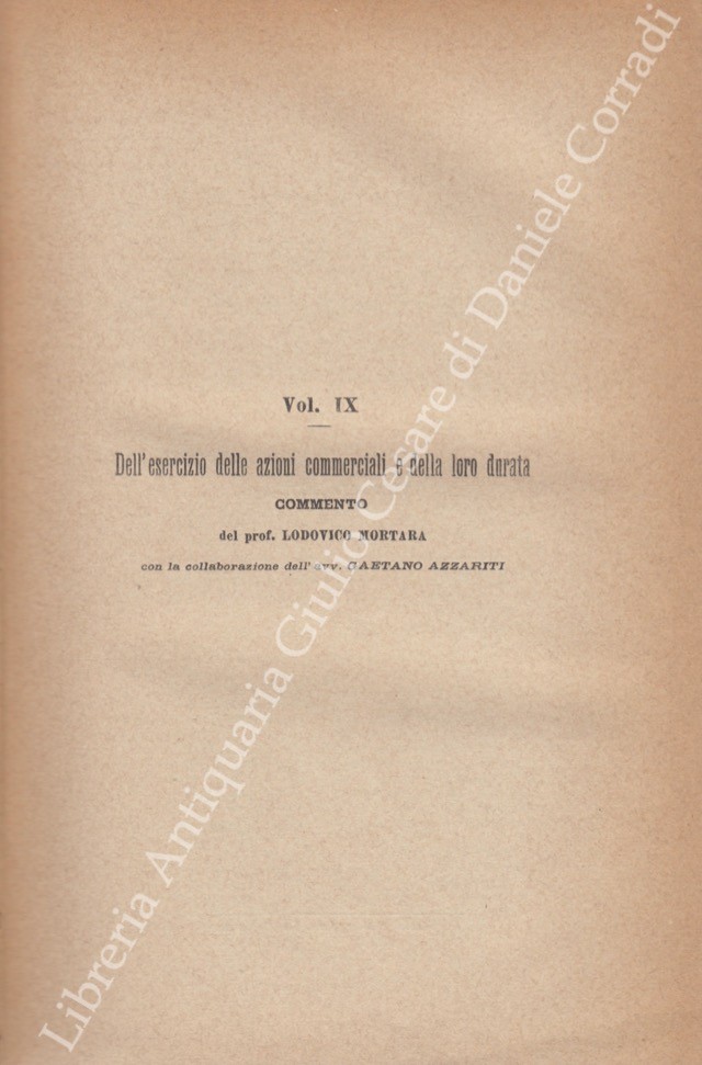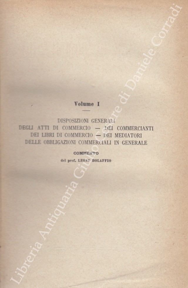 Il Codice di Commercio Commentato da: Ascoli, Bolaffio, Caluci, Cuzzeri, Marghieri, Mortara, Supino, Tartufari, Vivante. Vol. I - Bolaffio L. - Disposizioni generali. Degli atti di commercio. Dei commercianti. Dei libri di commercio. Dei mediatori. Delle obbligazioni commerciali in generale; Vol. II - Tartufari L. - Della vendita; Vol. III - Marghieri A. - Delle società e delle associazioni commerciali. Con la collaborazione di Calogero Gangi; Vol. IV - Supino D. - Della cambiale e dell'assegno bancario; Vol. V - Caluci E. - Del contratto di conto corrente. Del mandato commerciale e della commissione. Del contratto di trasporto; Vol. VI - Vivante C. - Del contratto di assicurazione; Vol. VII - Ascoli P. - Del commercio marittimo e della navigazione; Vol. VIII - Cuzzeri E. - Del fallimento; Vol. VIII - Appendice - Bolaffio L. - Del concordato preventivo e della procedura dei piccoli fallimenti (Legge 24 maggio 1903 n. 197); Vol. IX - Mortara L. - Dell'esercizio delle azioni commerciali e della loro durata. Con la collaborazione di Gaetano Azzariti