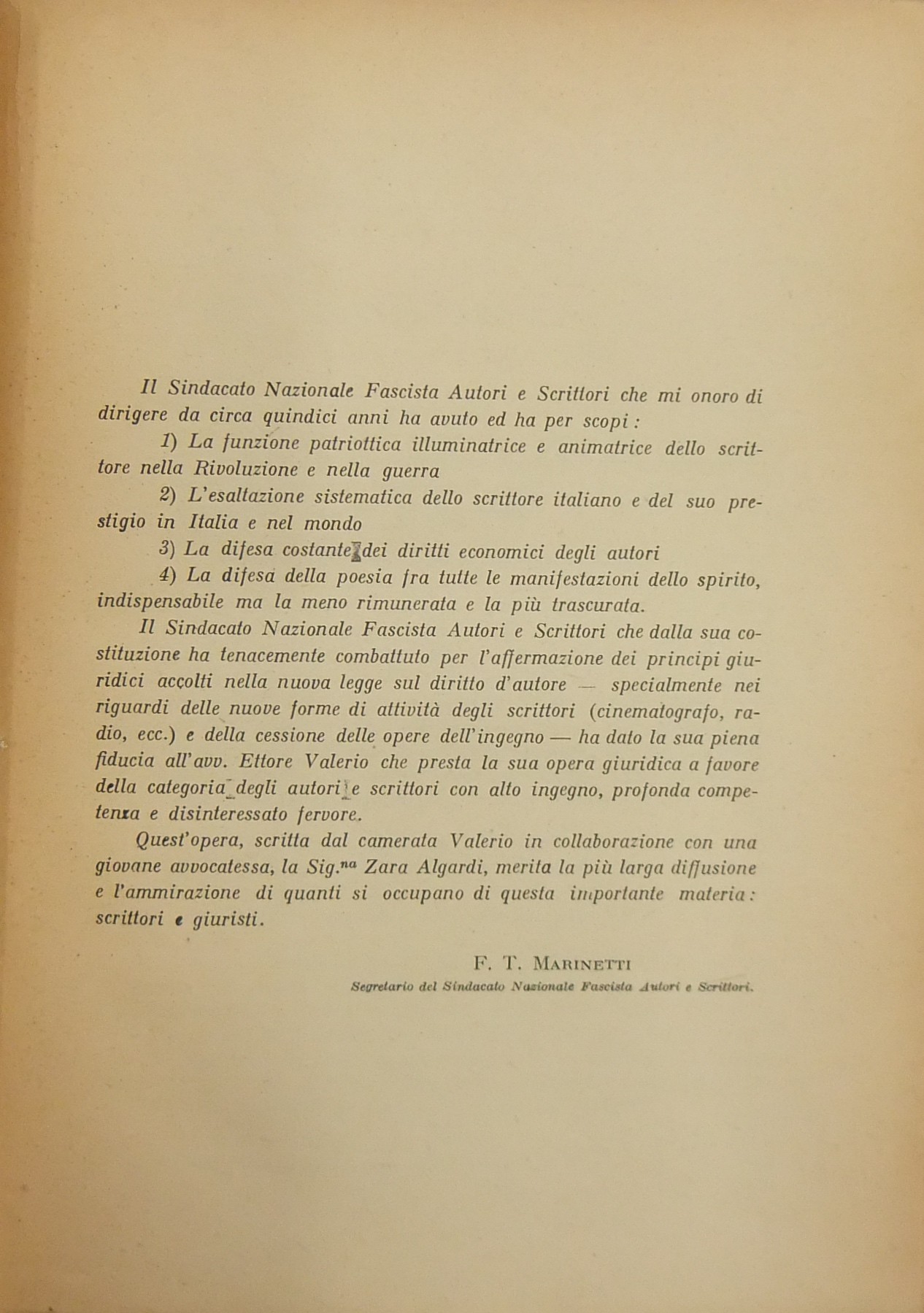 Il diritto d'autore. Commento teorico pratico alla nuova legge italiana 22 aprile 1941, n. 633. Prefazione di F. T. Marinetti