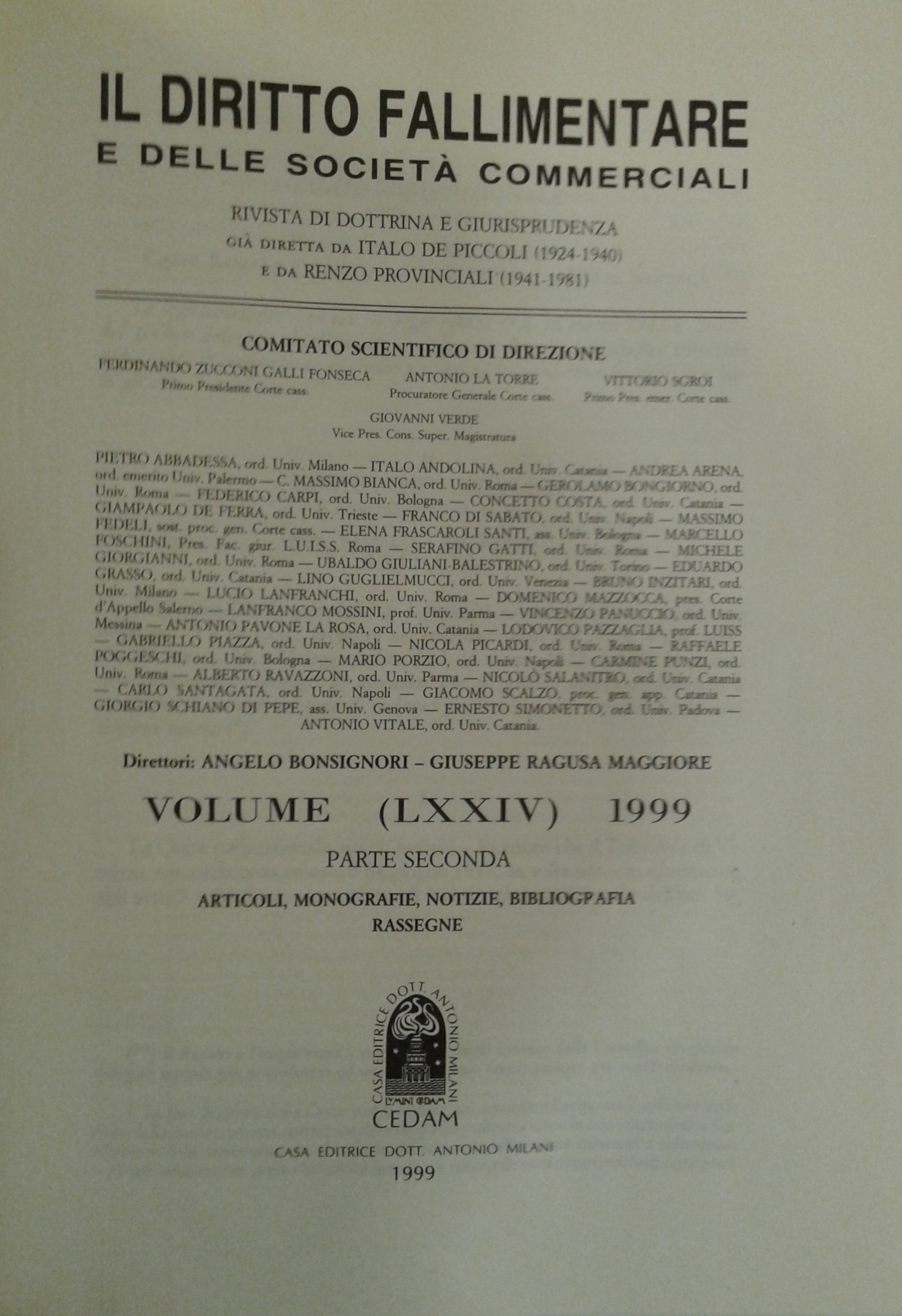 Il Diritto Fallimentare e delle società commerciali. Rivista di dottrina e giurisprudenza (già diretta da Italo De Piccoli 1924-1940 e Renzo Provinciali 1941-1981). Vol. LXXIV - 1999. Diretta da Angelo Bonsignori, Giuseppe Ragusa Maggiore
