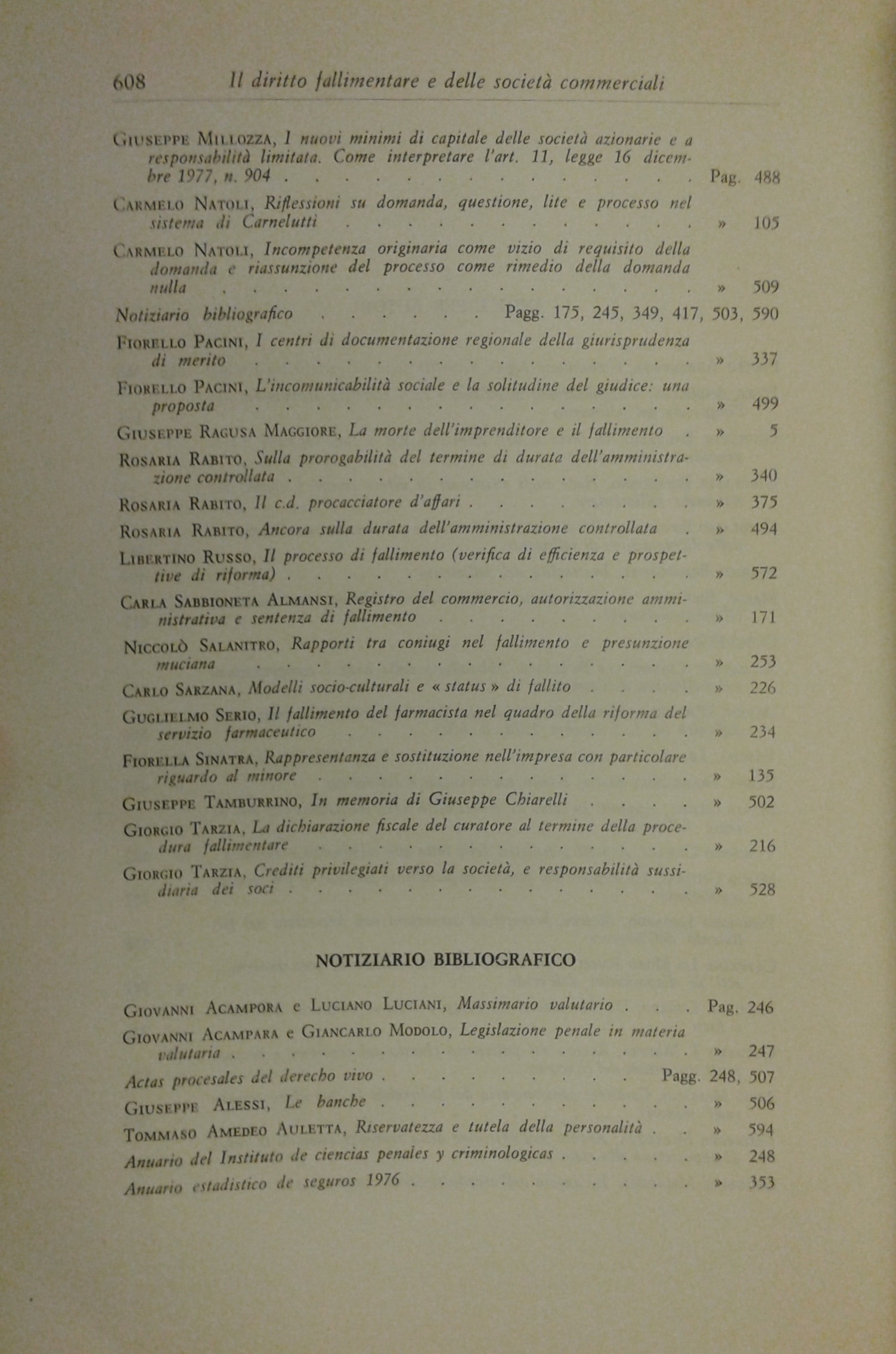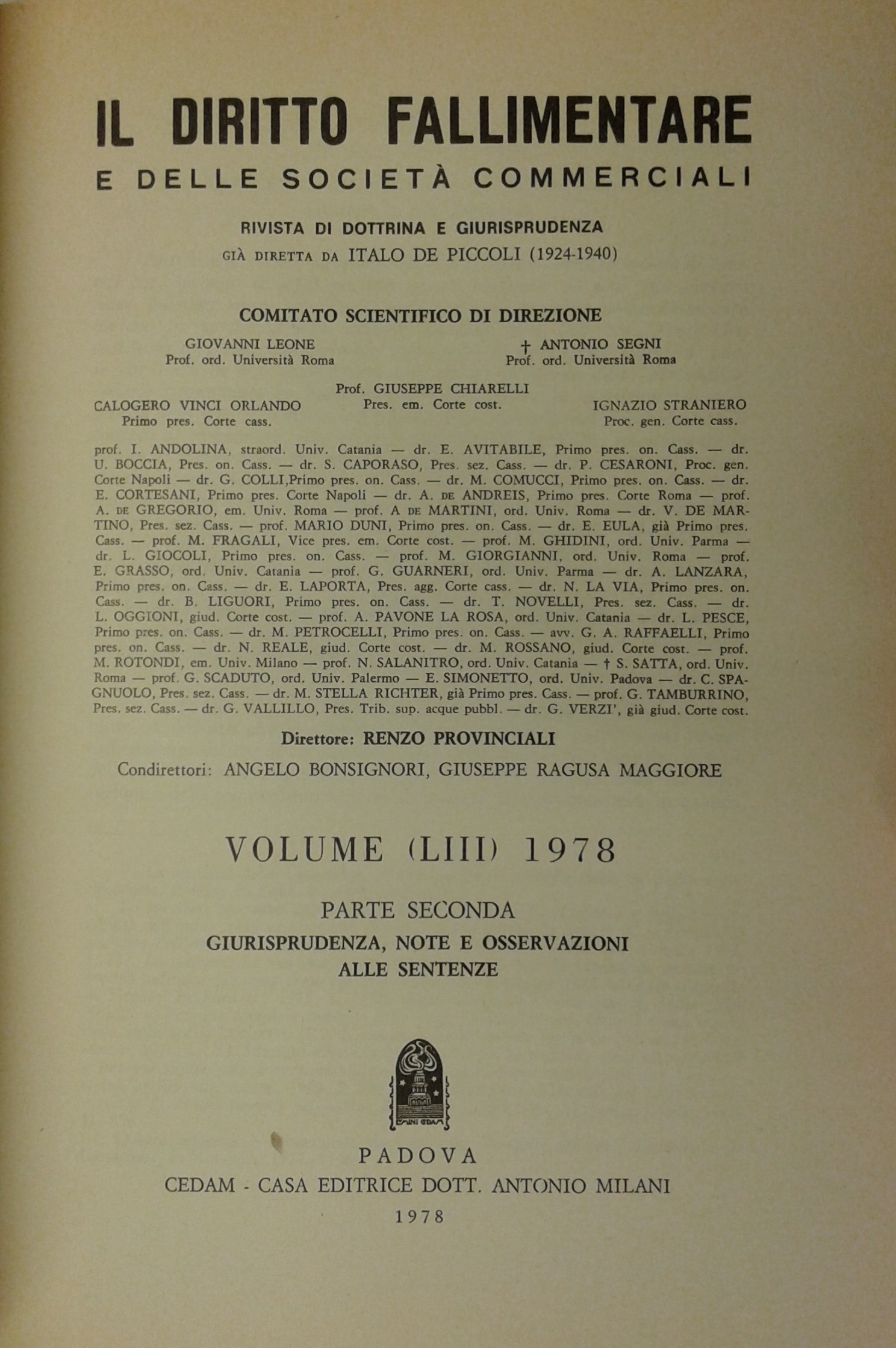 Il Diritto Fallimentare e delle società commerciali. Rivista di dottrina e giurisprudenza (già diretta da Italo De Piccoli 1924-1940). Vol. LIII - 1978. Diretta da Renzo Provinciali. Condirettori: Angelo Bonsignori, Giuseppe Ragusa Maggiore
