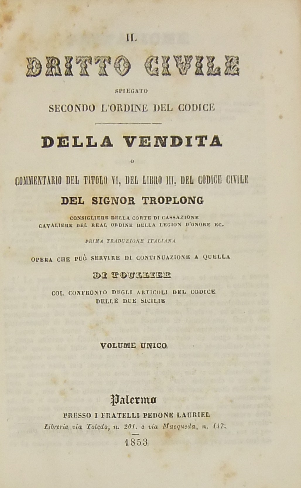 Il dritto civile spiegato secondo l'ordine del Codice. Della vendita. Commentario del Titolo VI del Libro III del Codice civile. Prima traduzione italiana. Opera che può servire di continuazione a quella di Toullier col confronto degli articoli del Codice delle Due Sicilie