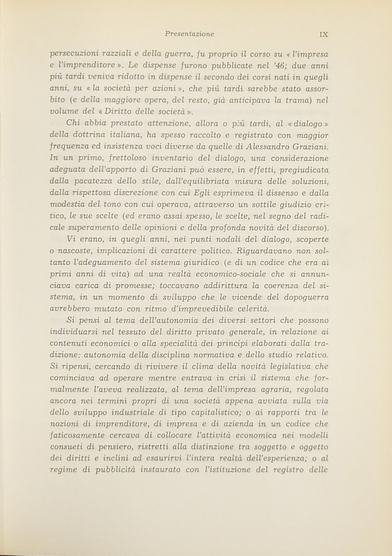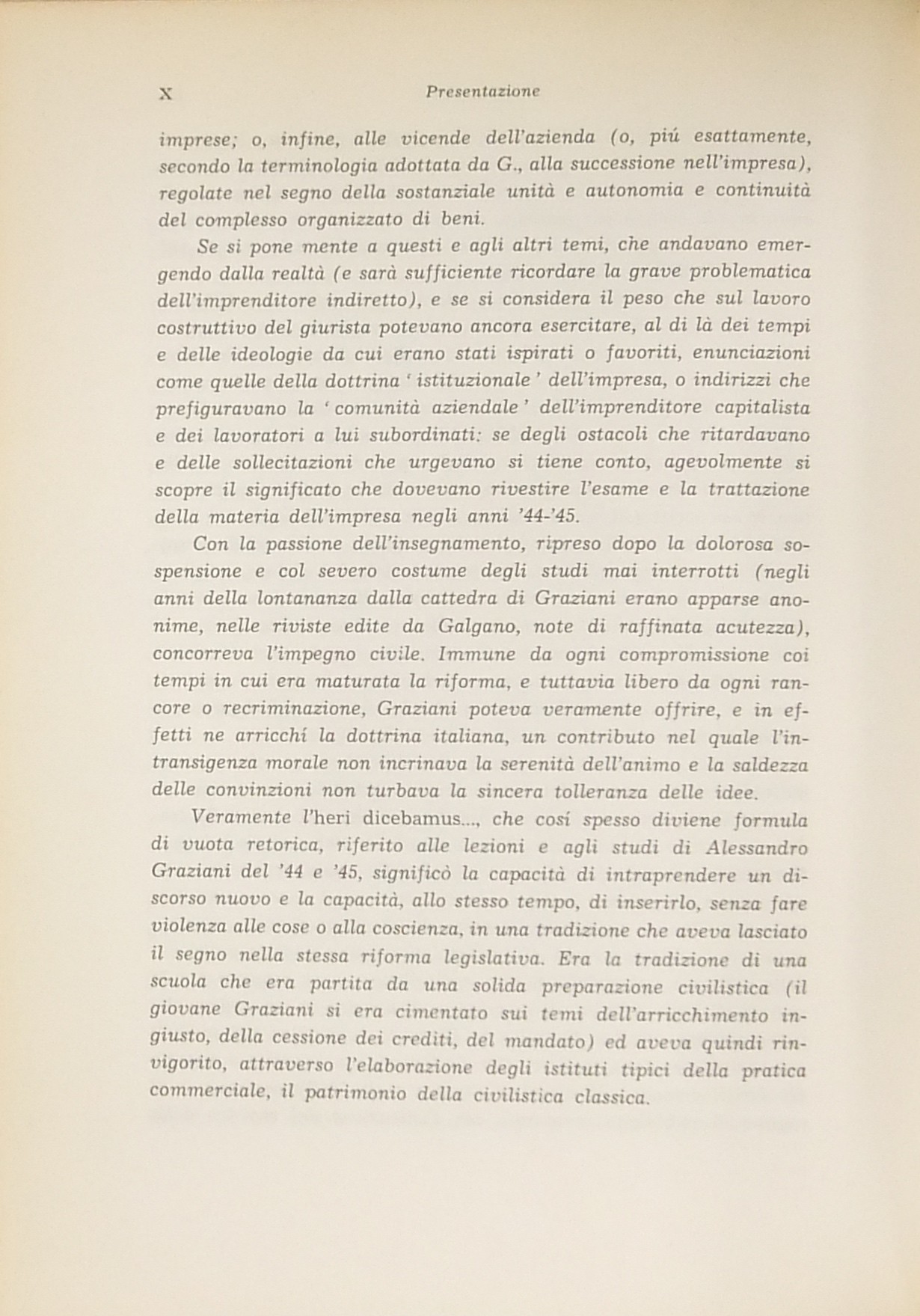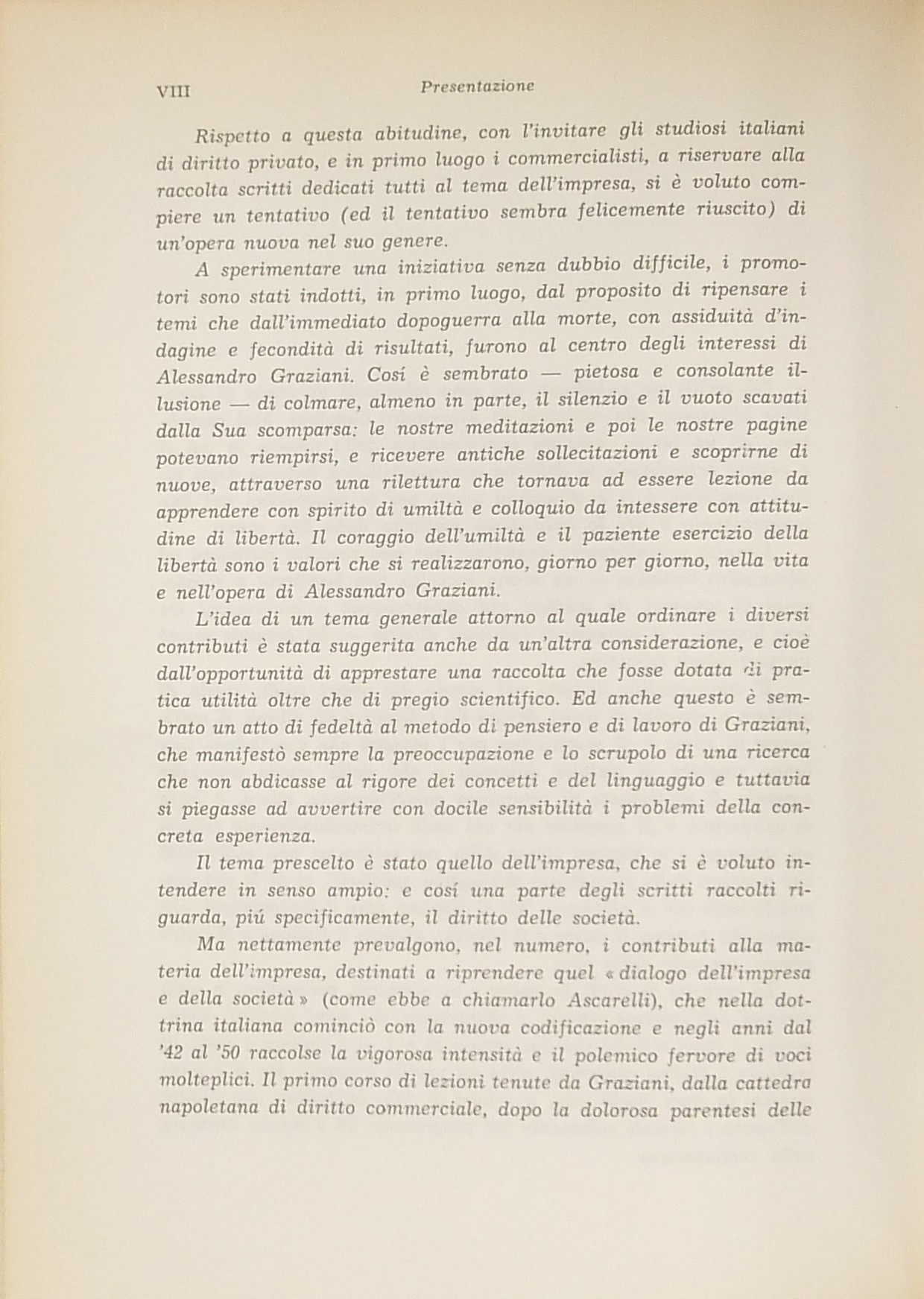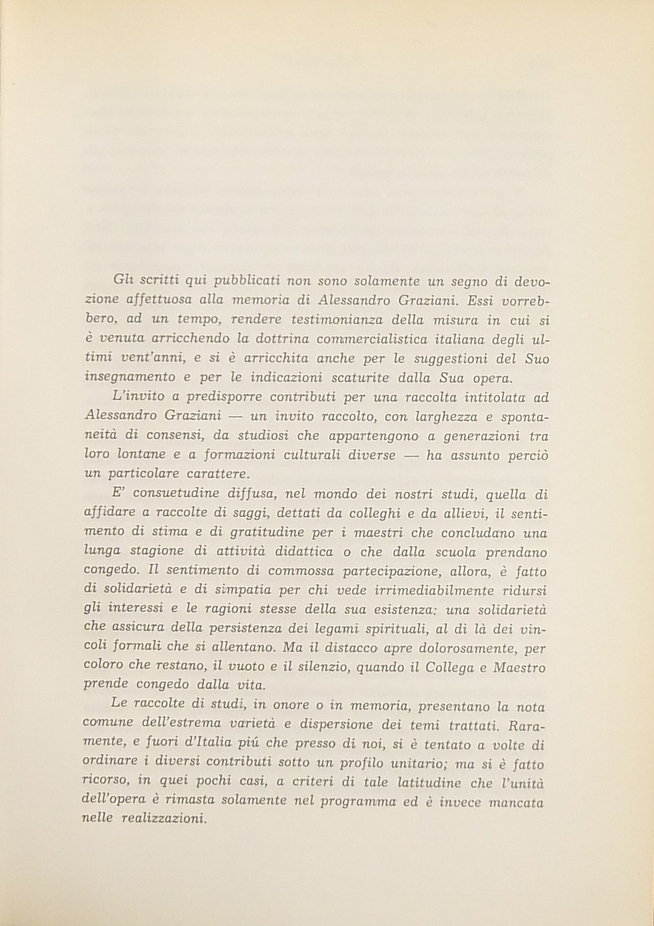 Ritratto fotografico di Alessandro Graziani a inizio opera. Scritti di: Amatucci, Arena, Asquini, Auletta, Belviso, Bigiavi, Bocchini, Bricola, Buonocore, Buttaro, Casanova, Cottino, Dalmartello, De Ferra, Di Sabato, Fabiani, Fanelli, Farina, Ferri G., Formiggini, Foschini, Franceschelli, Galgano, Gambino, Genovese, Ghezzi, Ghidini G., Ghidini M., Giugni, Grisoli, Guarino, Guglielmetti, Jaeger, Majello, Marchetti, Martorano, Merusi, Messineo, Minervini, Oppo, Panuccio, Patroni Griffi, Pavone La Rosa, Pellizzi, Pescatore, Pettiti, Pisani Massamormile, Porzio, Prosperetti, Rescigno, Rotondi, Roversi Monaco, Santagata, Santini, Santoro Passarelli, Scognamiglio, Sena, Simonetto, Sotgia, Spagnuolo Vigorita, Stolfi G., Stolfi M., Tilocca, Vanzetti, Venditti A., Venditti C.