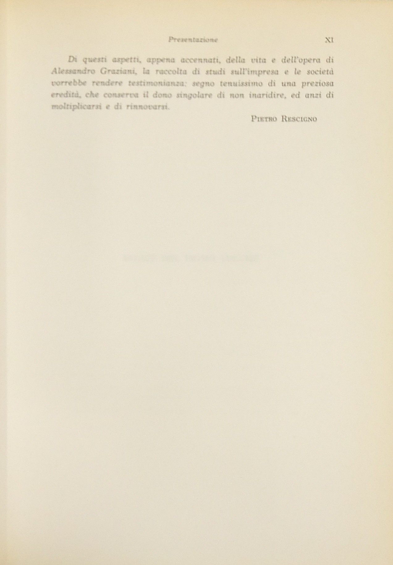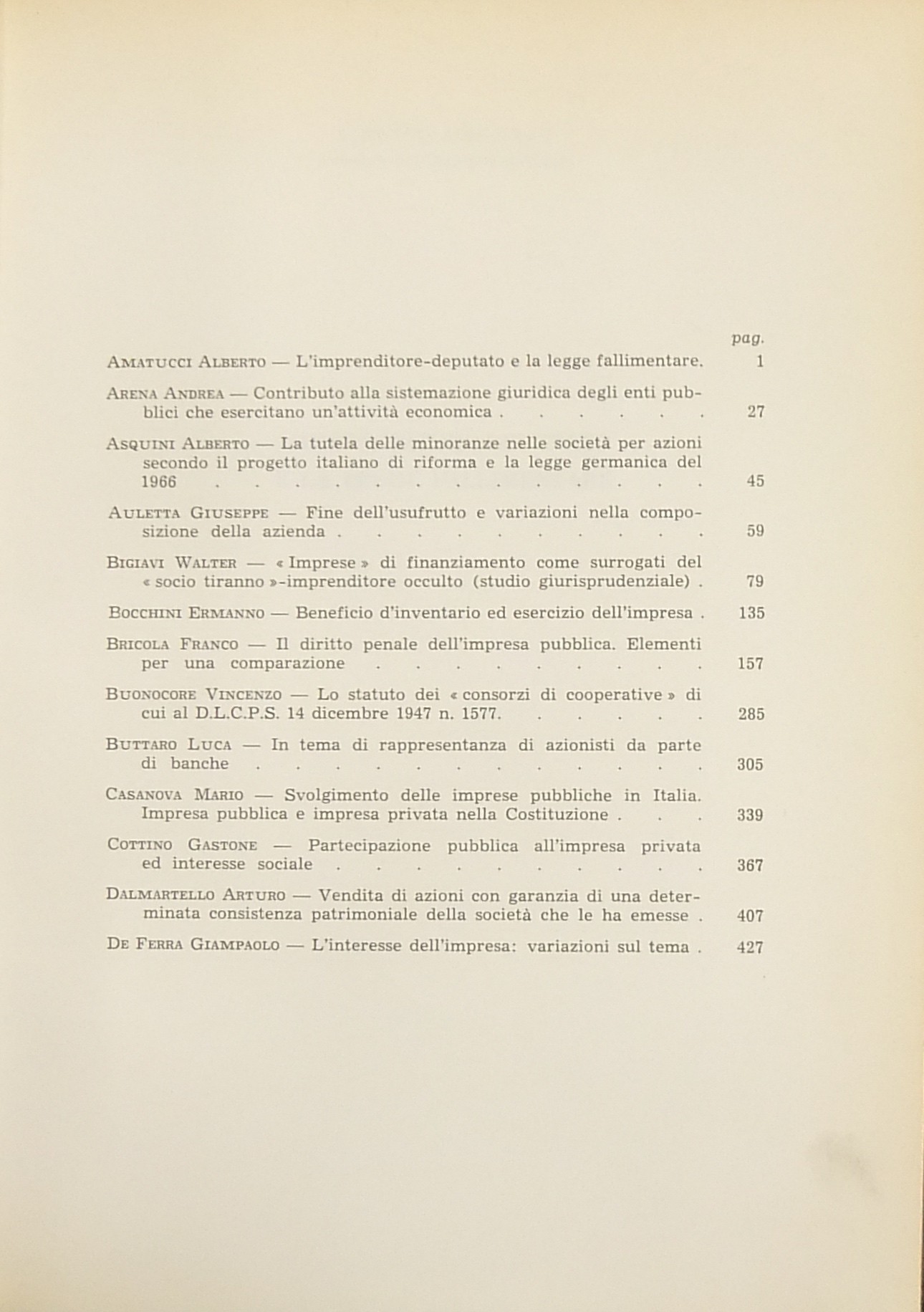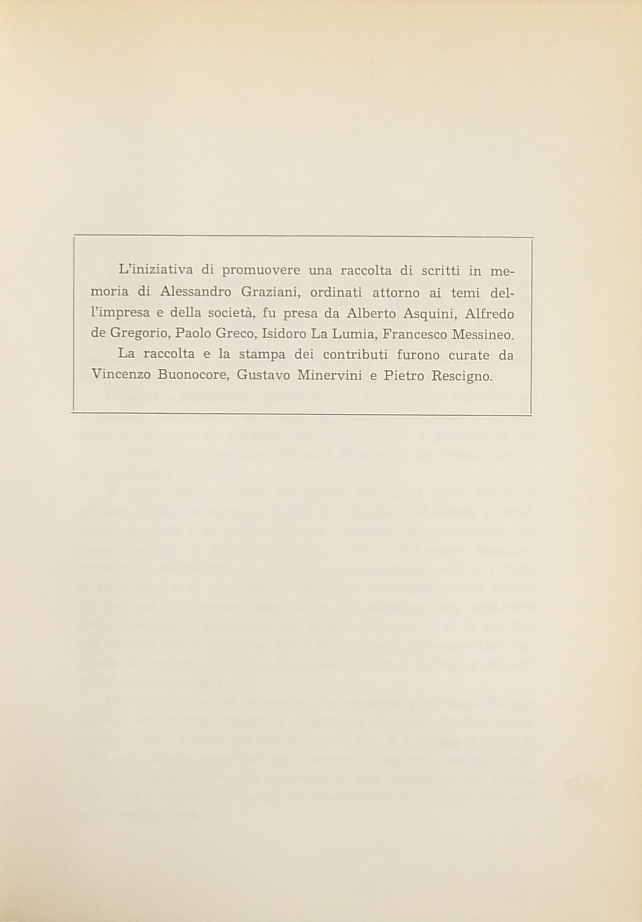Ritratto fotografico di Alessandro Graziani a inizio opera. Scritti di: Amatucci, Arena, Asquini, Auletta, Belviso, Bigiavi, Bocchini, Bricola, Buonocore, Buttaro, Casanova, Cottino, Dalmartello, De Ferra, Di Sabato, Fabiani, Fanelli, Farina, Ferri G., Formiggini, Foschini, Franceschelli, Galgano, Gambino, Genovese, Ghezzi, Ghidini G., Ghidini M., Giugni, Grisoli, Guarino, Guglielmetti, Jaeger, Majello, Marchetti, Martorano, Merusi, Messineo, Minervini, Oppo, Panuccio, Patroni Griffi, Pavone La Rosa, Pellizzi, Pescatore, Pettiti, Pisani Massamormile, Porzio, Prosperetti, Rescigno, Rotondi, Roversi Monaco, Santagata, Santini, Santoro Passarelli, Scognamiglio, Sena, Simonetto, Sotgia, Spagnuolo Vigorita, Stolfi G., Stolfi M., Tilocca, Vanzetti, Venditti A., Venditti C.