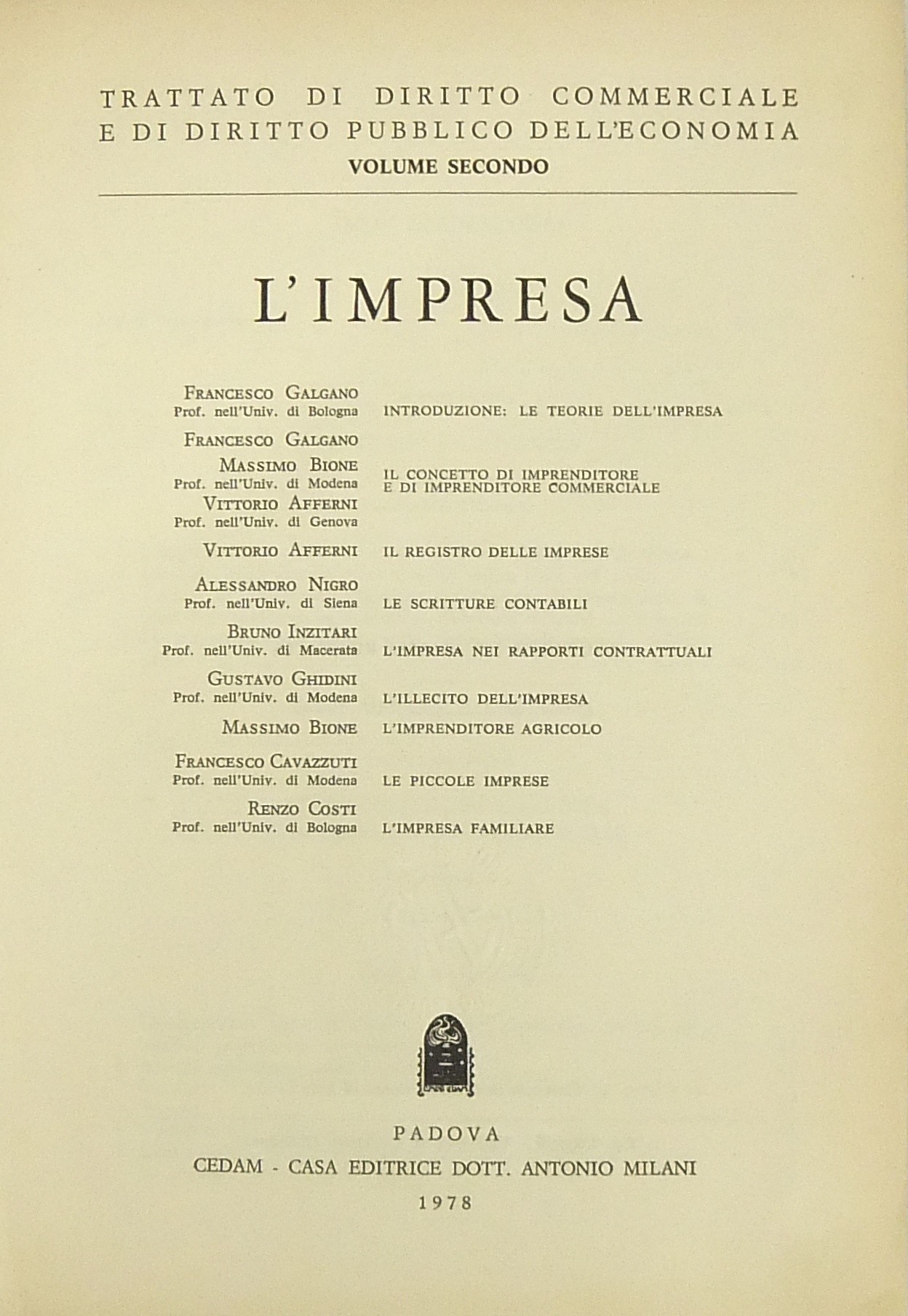 L'impresa. Introduzione: le teorie dell'impresa; Il concetto di imprenditore e di imprenditore commerciale; Il registro delle imprese; Le scritture contabili; L'impresa nei rapporti contrattuali; L'illecito dell'impresa; L'imprenditore agricolo; Le piccole imprese; L'impresa familiare