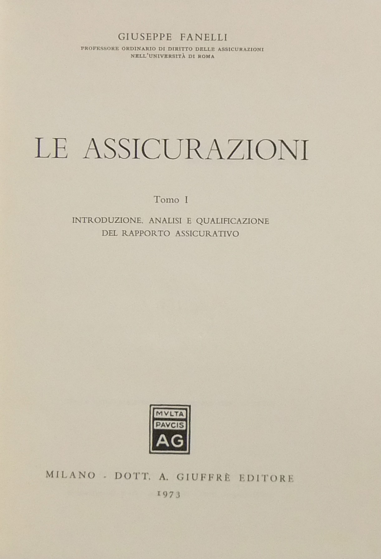 Le assicurazioni. Vol. I - Introduzione analisi e qualificazione del rapporto assicurativo (unico pubblicato)