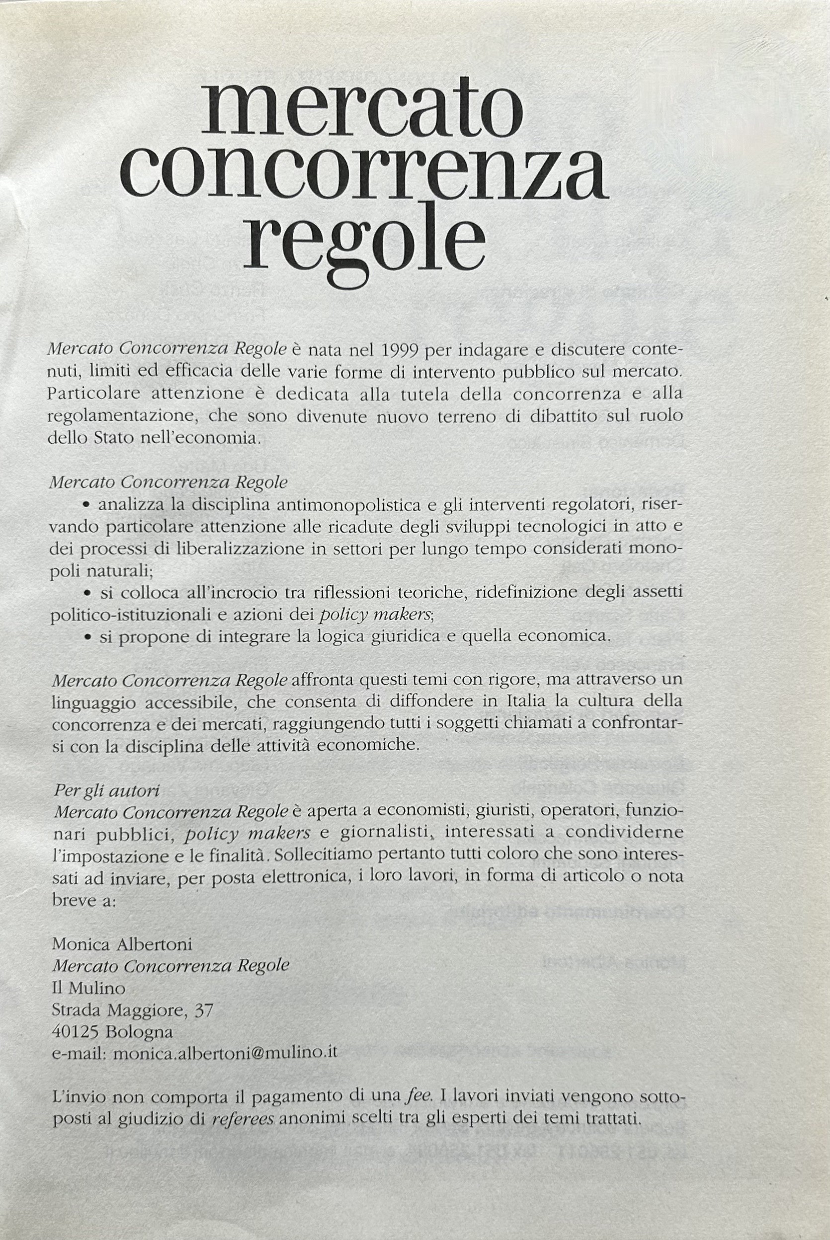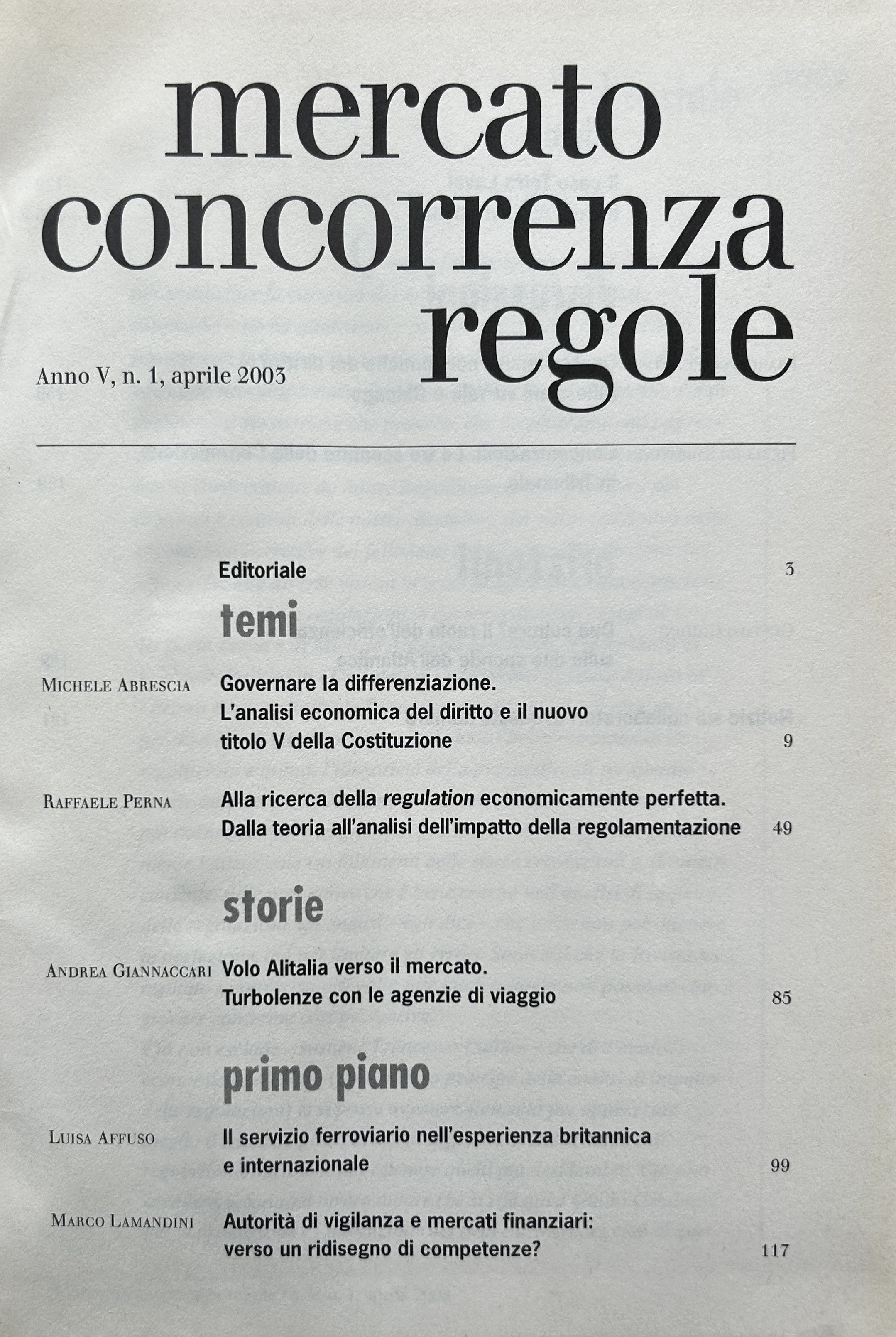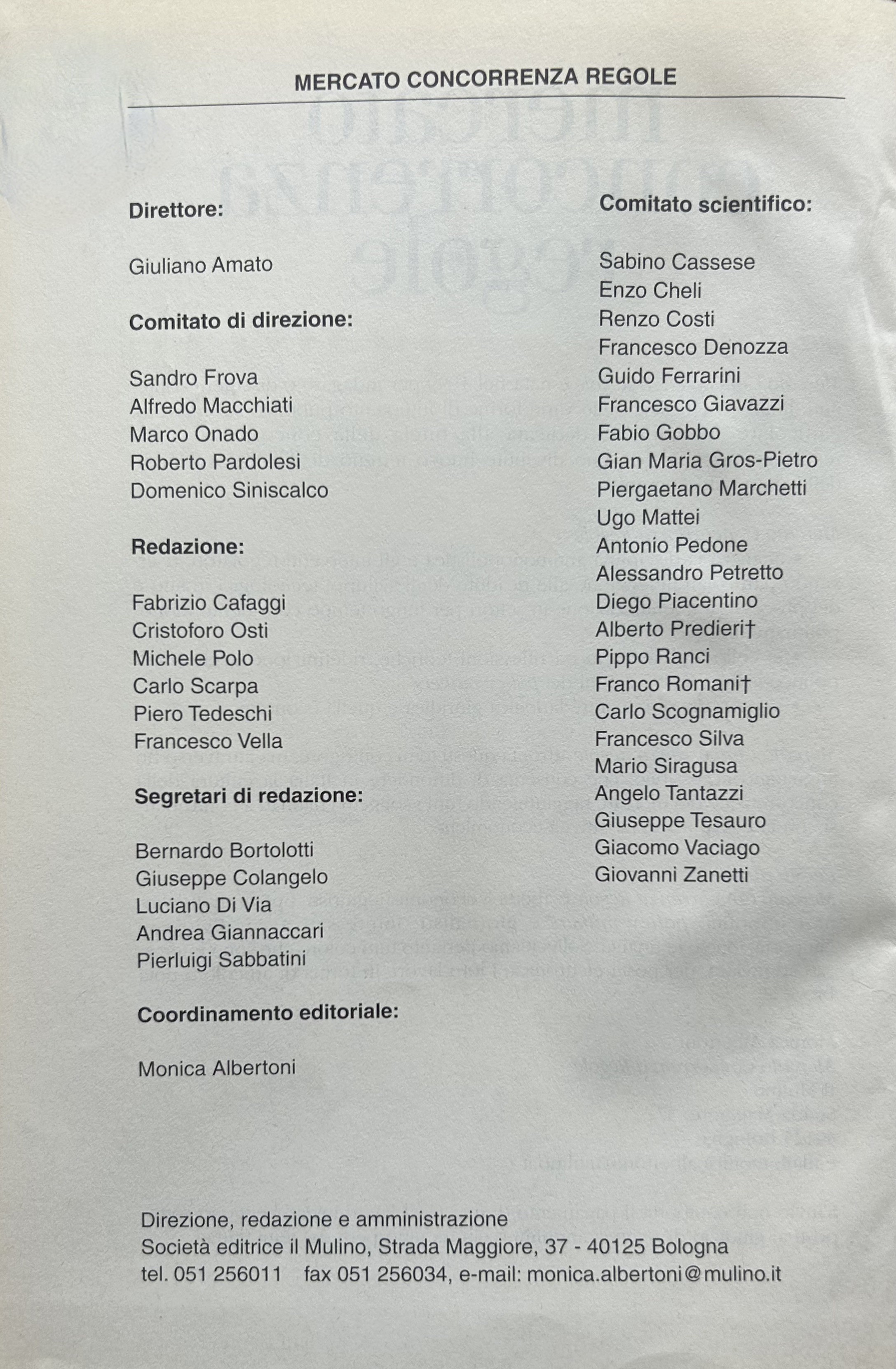 La rivista fu fondata nel 1999. Diretta da Giuliano Amato. Contributi di: Cassese S., Cheli E., Costi R., Denozza F., FerrariniG., Giavazzi F., Gobbo F., Gros-Pietro G.M., Marchetti P., Mattei U., Pedone A., Petretto A., Piacentino D., Predieri A., Ranci P., Romani F., Scognamiglio C., Silva F., Siragusa M., Tantazzi A., Tesauro G., Vaciago G., Zanetti G.