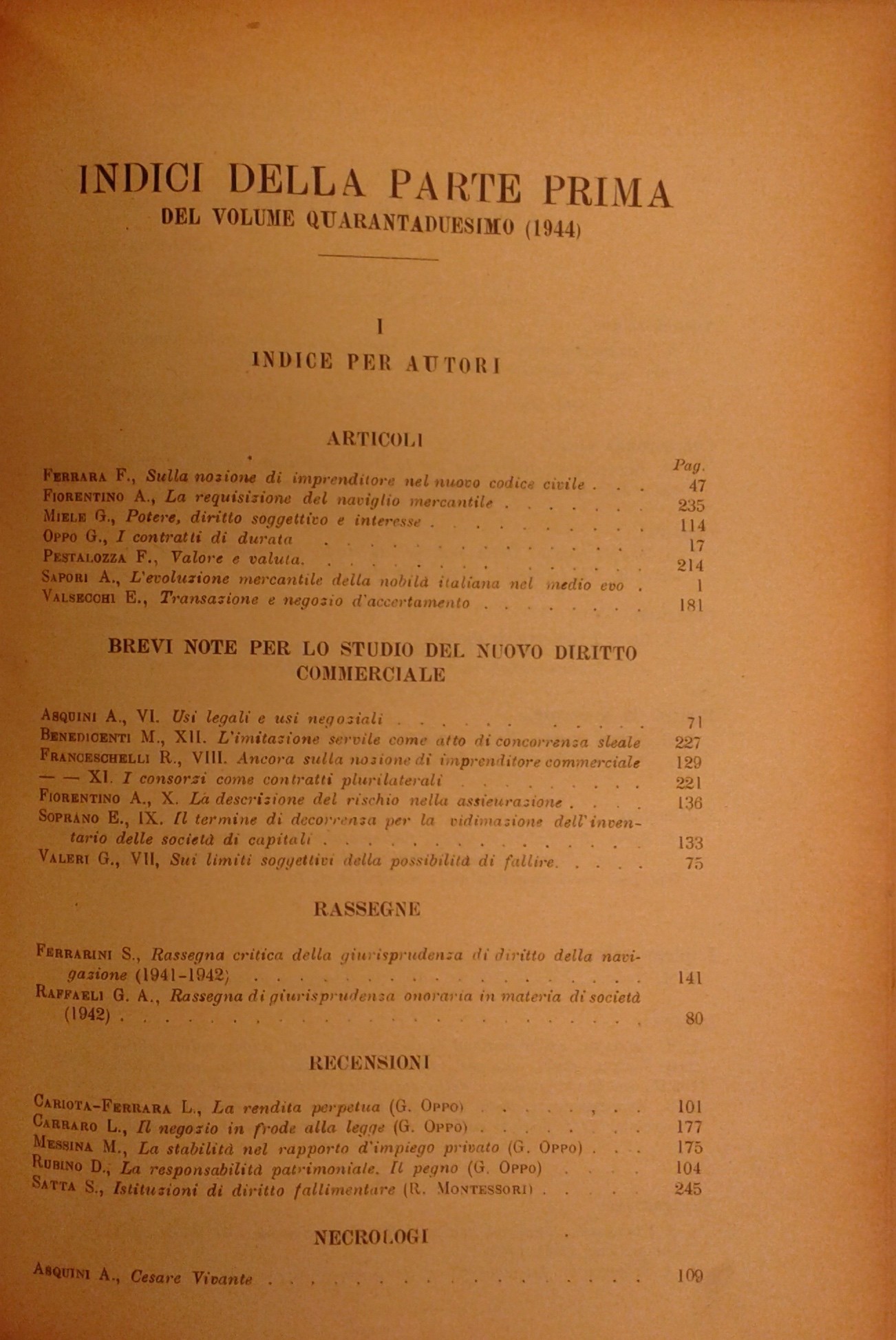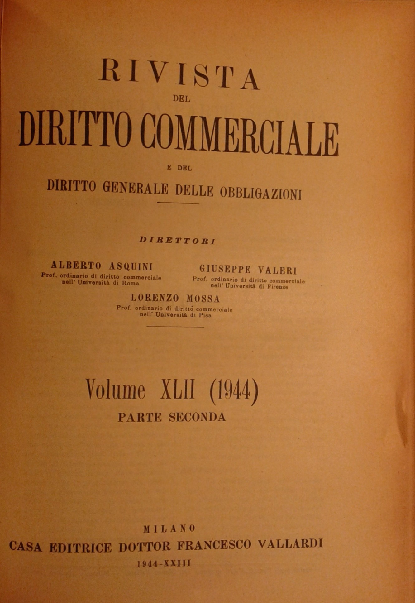 Rivista del Diritto Commerciale e del diritto generale delle obbligazioni. Fondata da A. Sraffa e C. Vivante. Diretta da A. Asquini, L. Mossa, G. Valeri. Vol. XLII - 1944