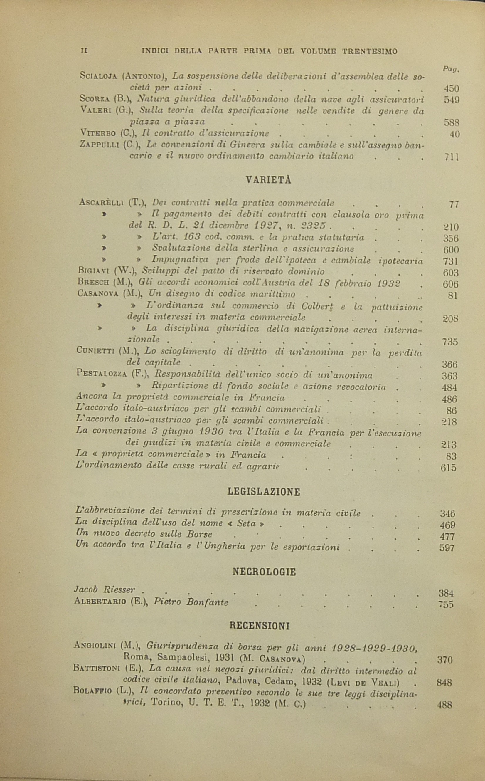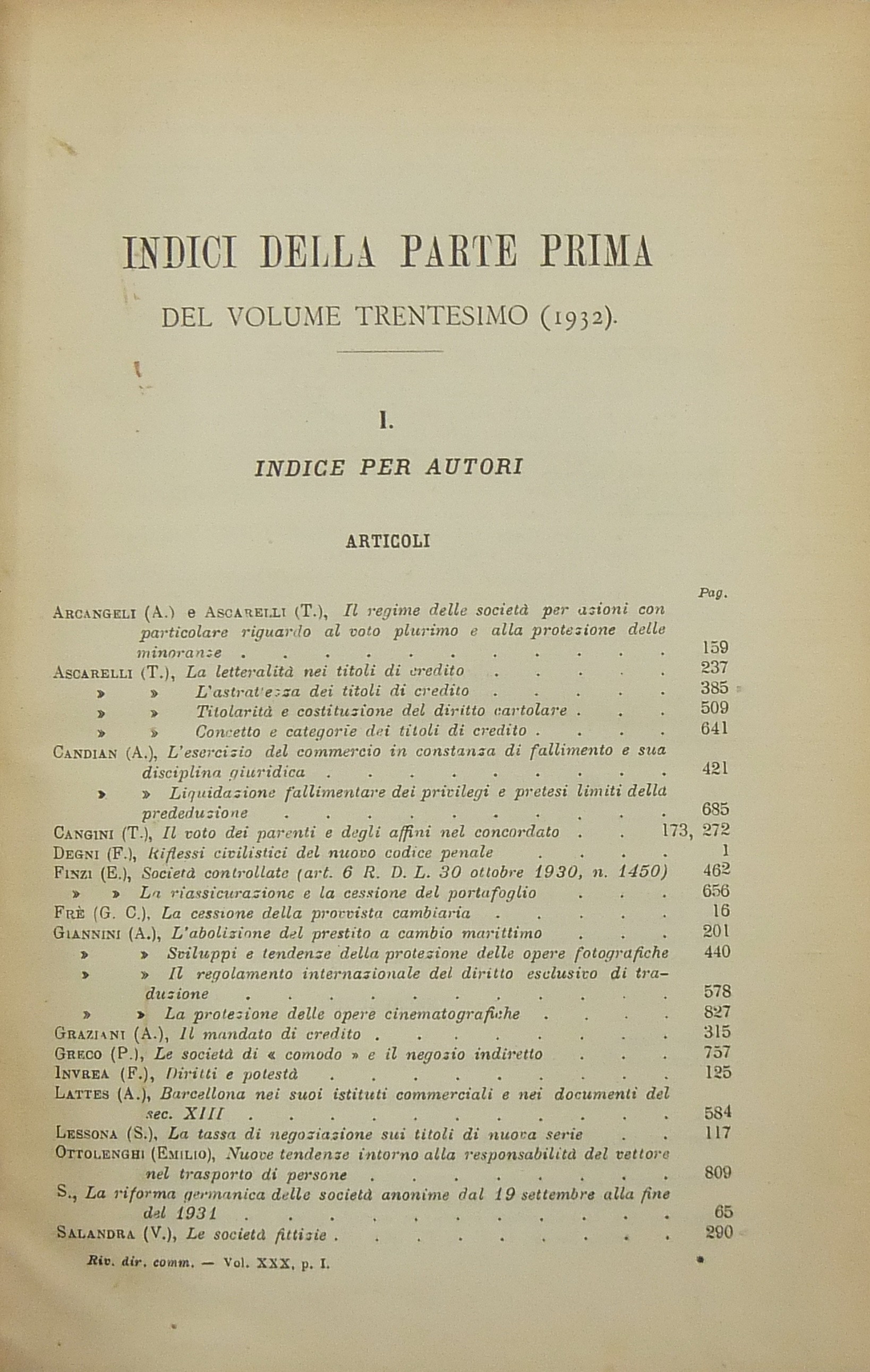 Rivista del Diritto Commerciale e del diritto generale delle obbligazioni. Diretta da A. Sraffa e C. Vivante. Vol. XXX - 1932