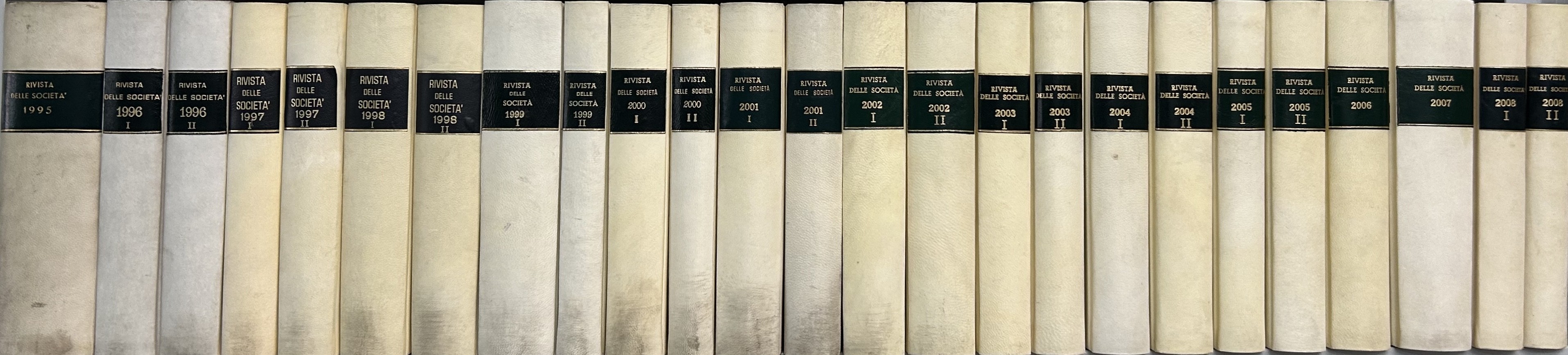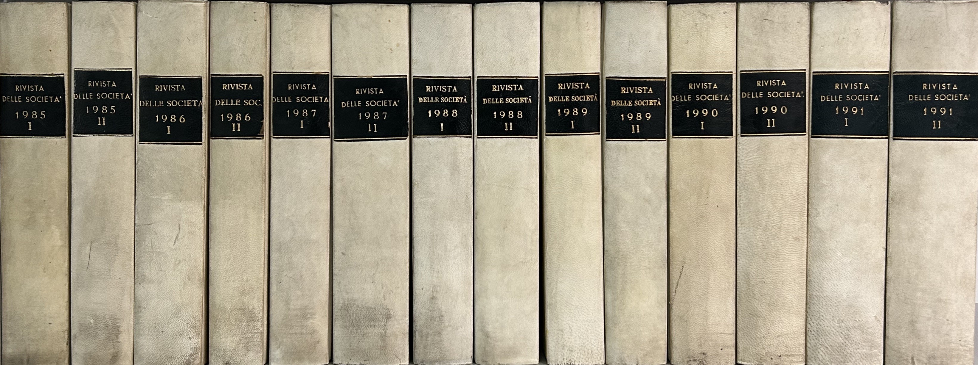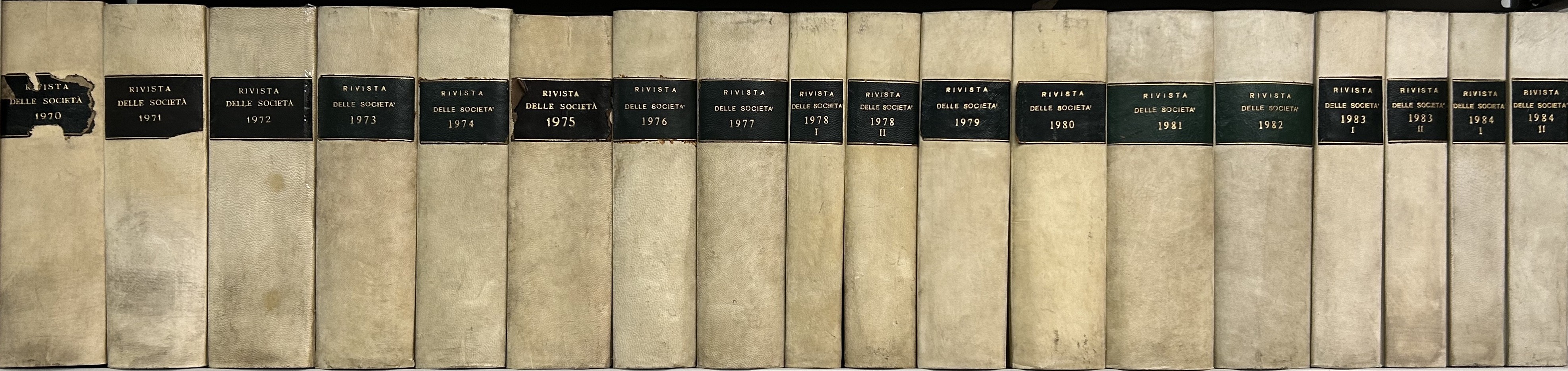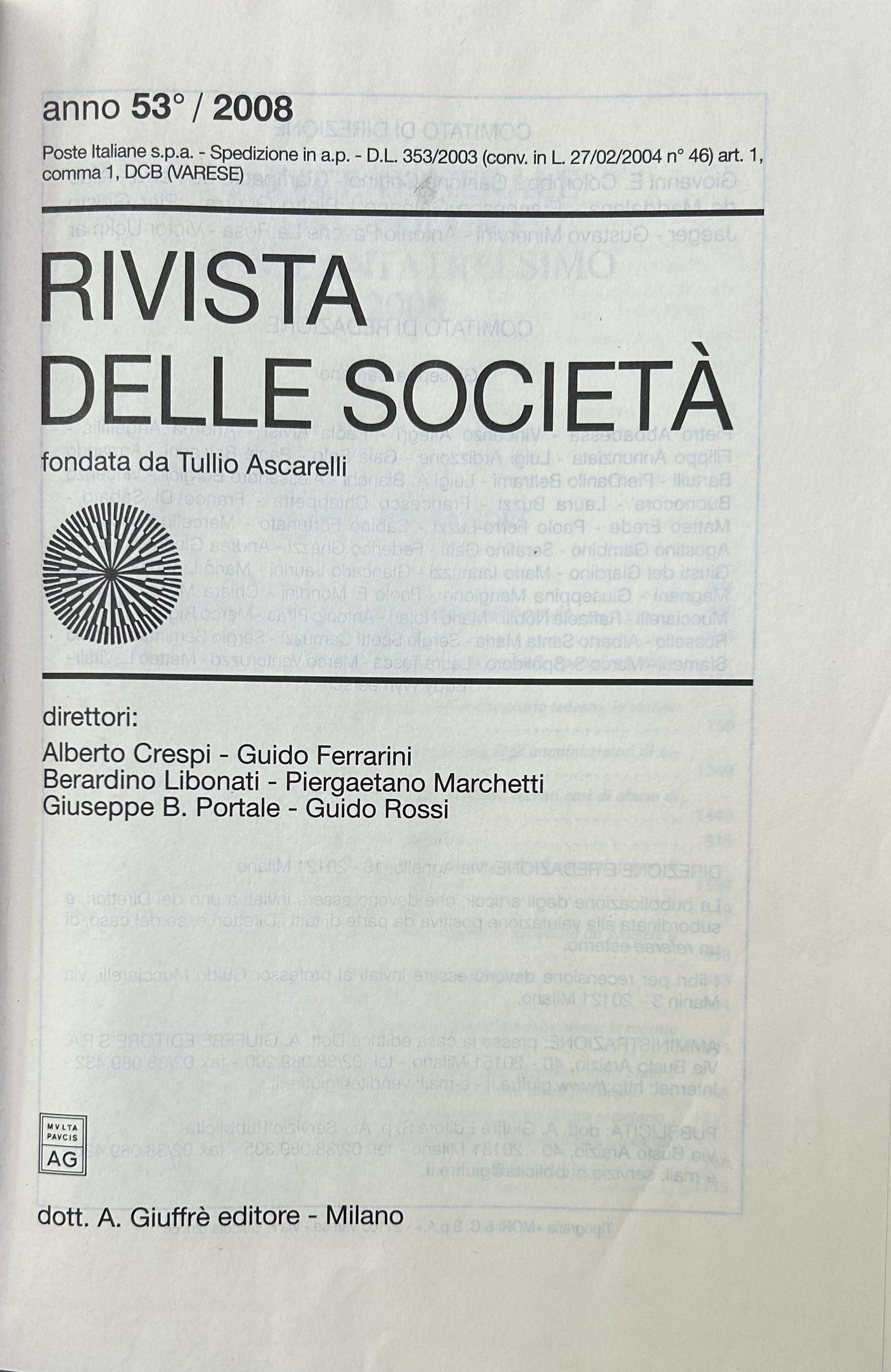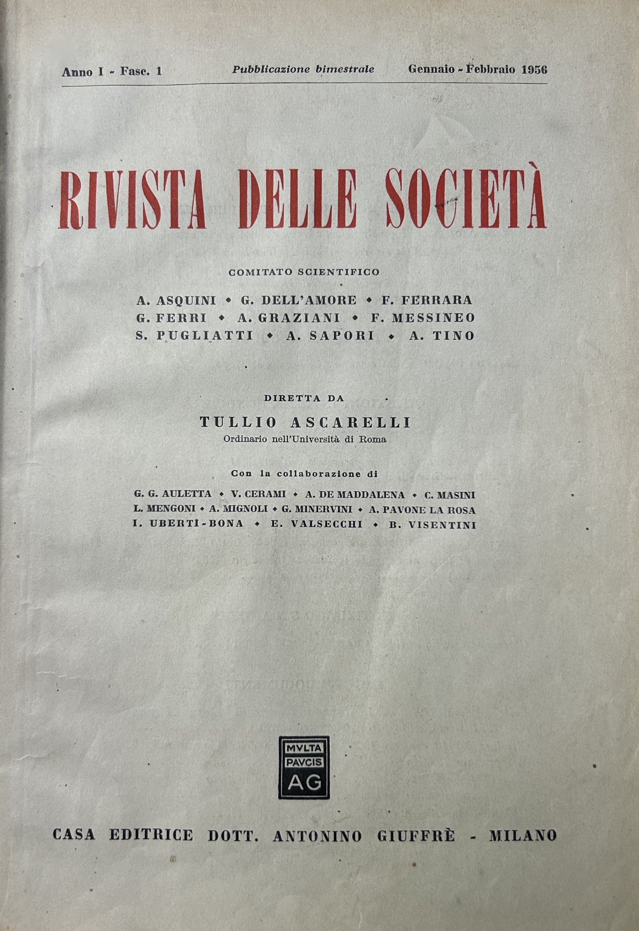 Rivista delle società . Fondata da Tullio Ascarelli. Diretta da: A.Asquini, G.Auletta, A.Crespi, G.de Gennaro, A.De Gregorio, G.Dell'Amore, F.Ferrara, F.Ferri, G.Frè, G.Gorla, C.Grassetti, P.Greco, G.Landi, A.Lanza, L.Mengoni, F.Messineo, A.Mignoli, G.Minervini, A.Pavone La Rosa, G.B.Portale, S.Pugliatti, G.Rossi, A.Sapori, A.Tino, E.Valsecchi, B.Visentini