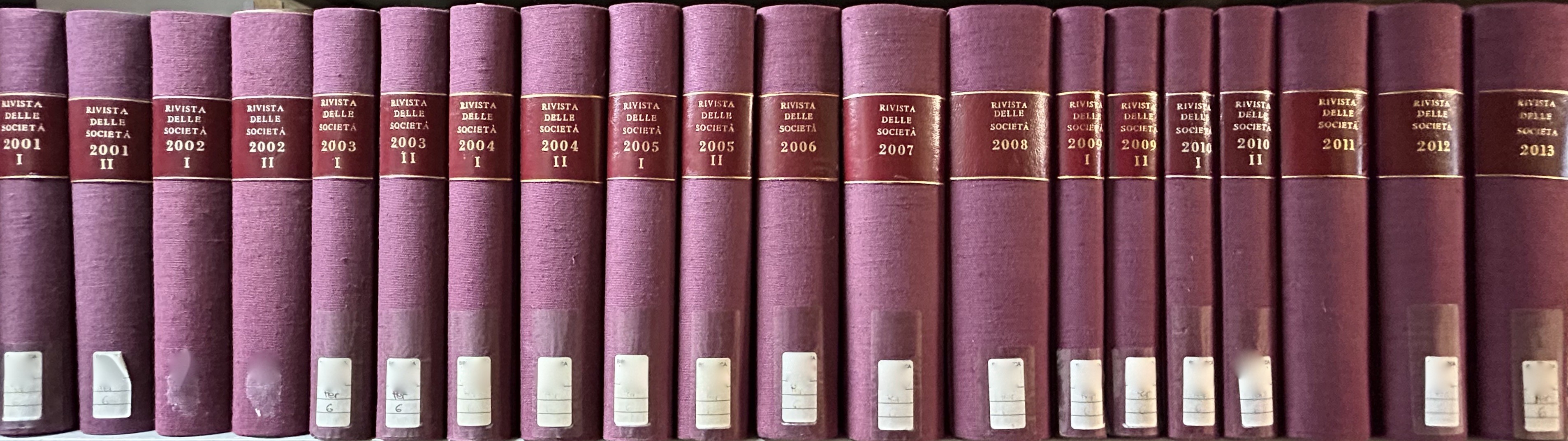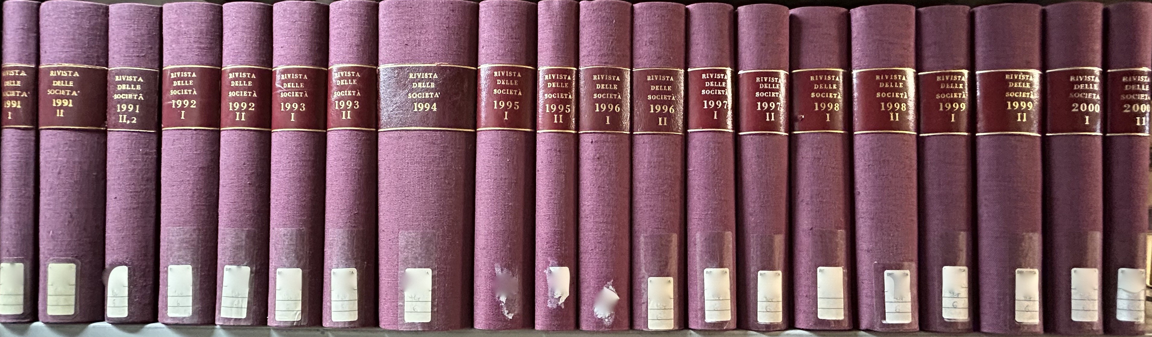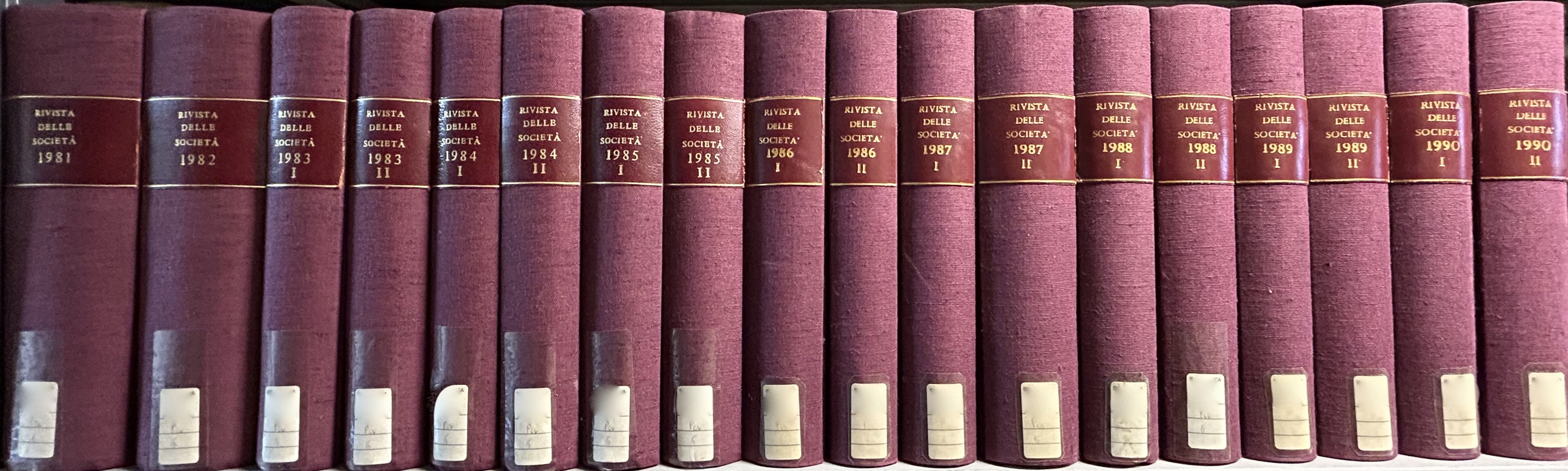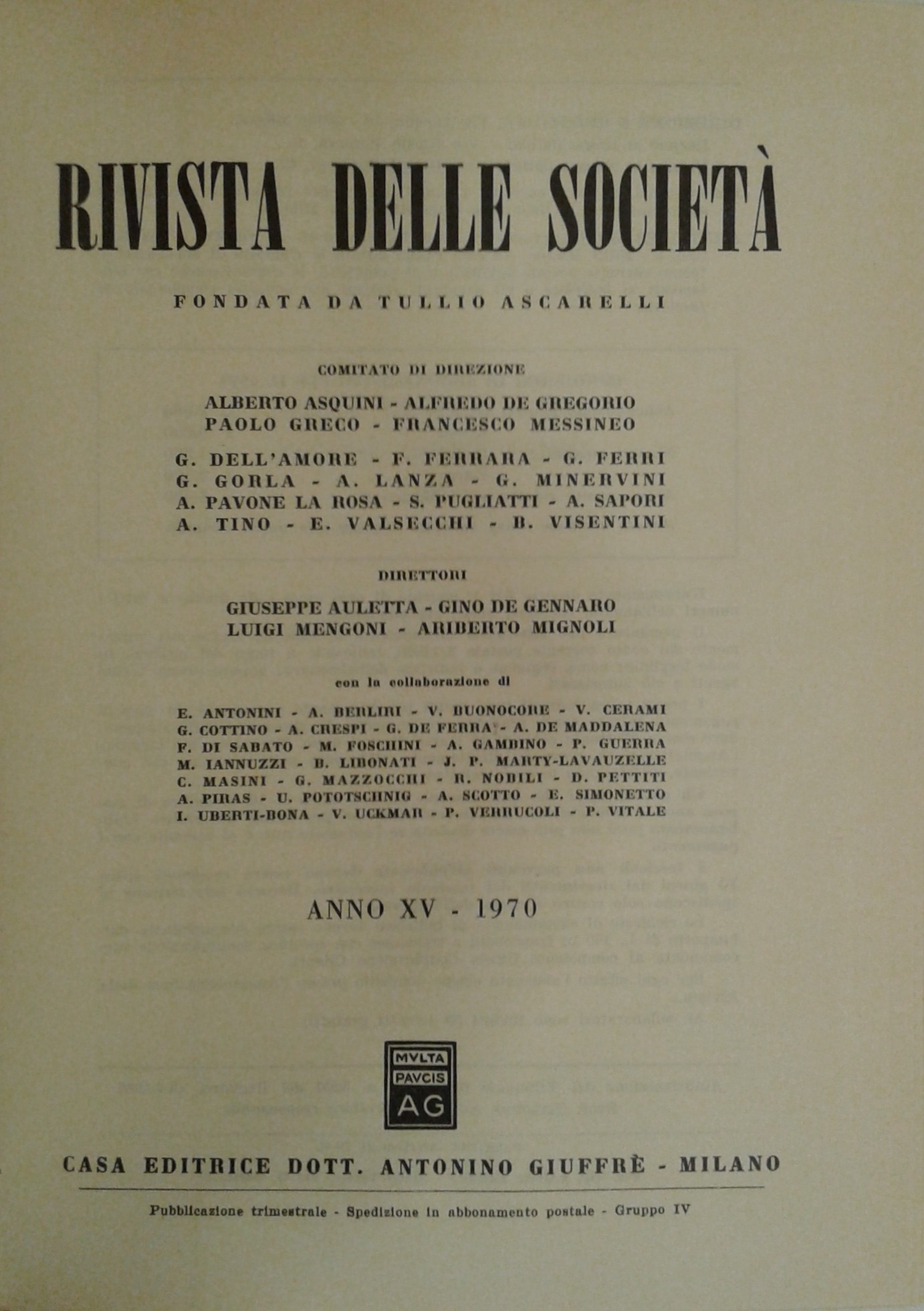 Rivista delle società . Fondata da Tullio Ascarelli. Diretta da: A.Asquini, G.Auletta, A.Crespi, G.de Gennaro, A.De Gregorio, G.Dell'Amore, F.Ferrara, F.Ferri, G.Frè, G.Gorla, C.Grassetti, P.Greco, G.Landi, A.Lanza, L.Mengoni, F.Messineo, A.Mignoli, G.Minervini, A.Pavone La Rosa, G.B.Portale, S.Pugliatti, G.Rossi, A.Sapori, A.Tino, E.Valsecchi, B.Visentini