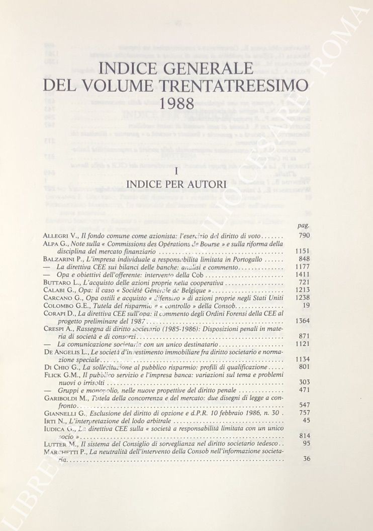 Rivista delle società . Fondata da Tullio Ascarelli. Diretta da Giuseppe Auletta, Alberto Crespi, Gino De Gennaro, Cesare Grassetti, Guido Landi, Luigi Mengoni, Ariberto Mignoli, Guido Rossi, Bruno Visentini. Anno 33° - 1988