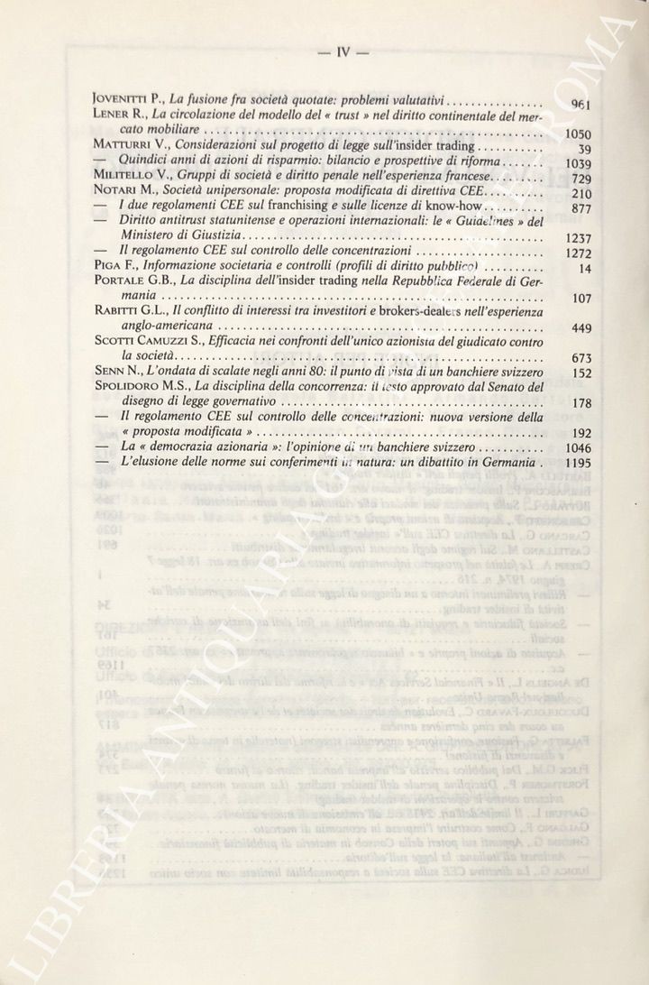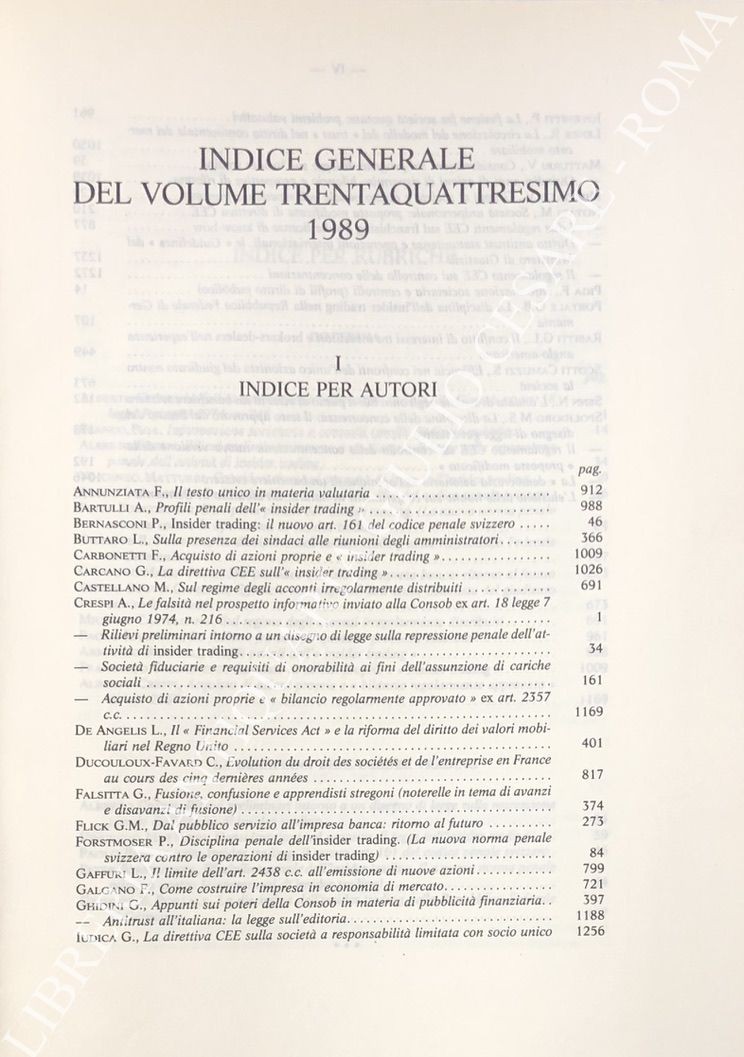 Rivista delle società. Fondata da Tullio Ascarelli. Diretta da Giuseppe Auletta, Alberto Crespi, Gino De Gennaro, Cesare Grassetti, Guido Landi, Luigi Mengoni, Ariberto Mignoli, Guido Rossi, Bruno Visentini. Anno 34° - 1989