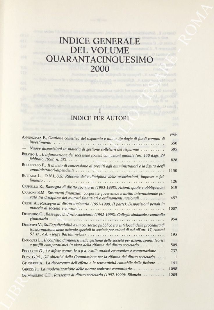 Rivista delle società. Fondata da Tullio Ascarelli. Diretta da Giuseppe Auletta, Alberto Crespi, Guido Ferrarini, Berardino Libonati, Piergaetano Marchetti, Luigi Mengoni, Ariberto Mignoli, Giuseppe B. Portale, Guido Rossi. Anno 45° - 2000