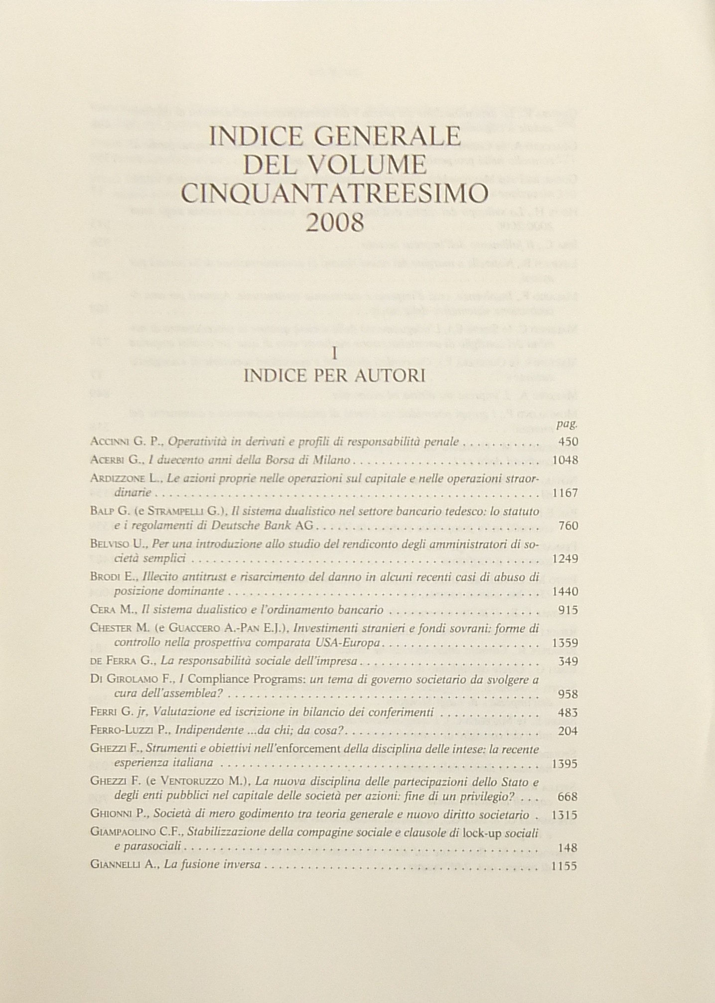 Rivista delle società . Fondata da Tullio Ascarelli. Diretta da Alberto Crespi, Guido Ferrarini, Berardino Libonati, Piergaetano Marchetti, Giuseppe B. Portale, Guido Rossi. Anno 53° - 2008