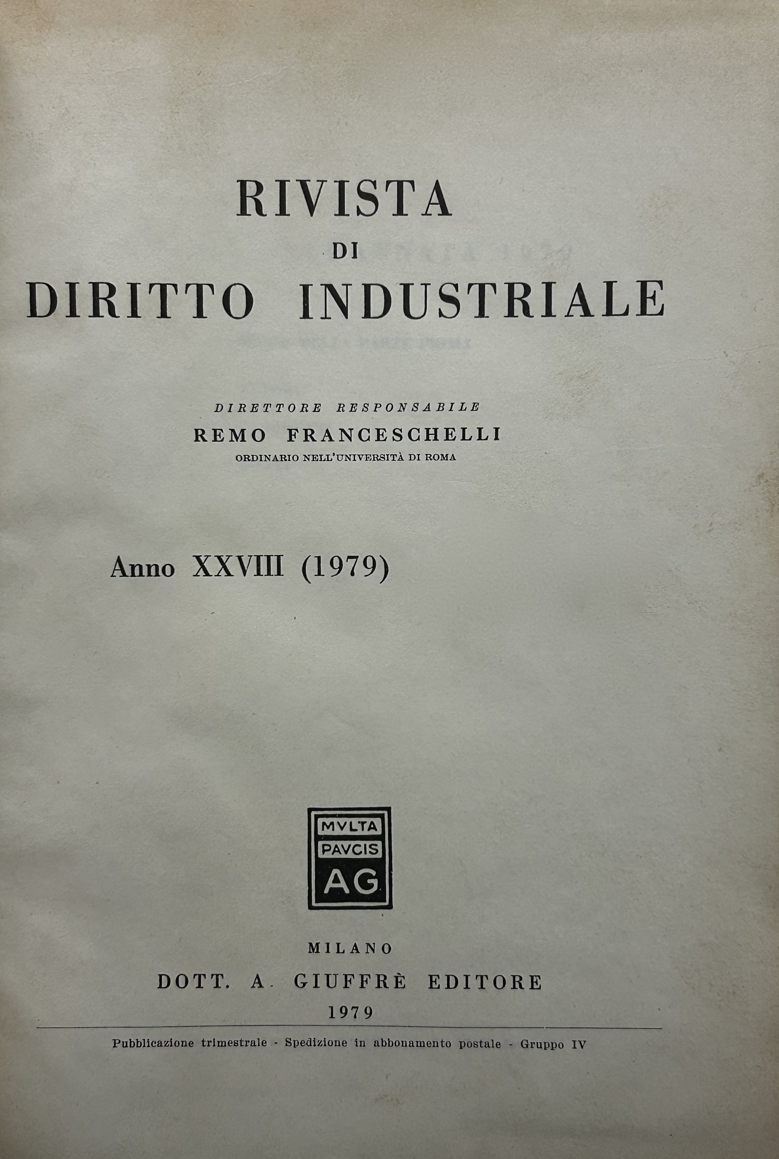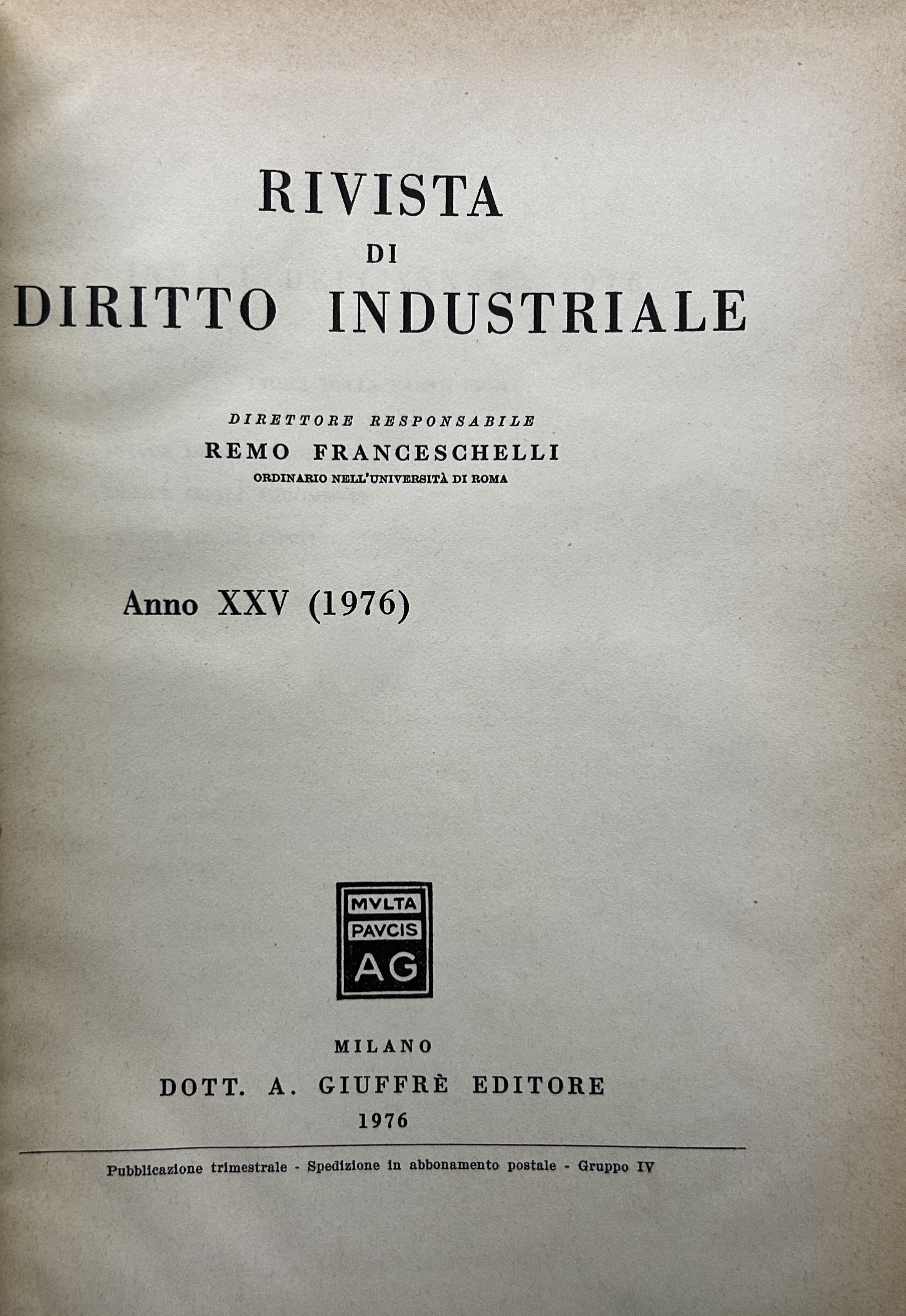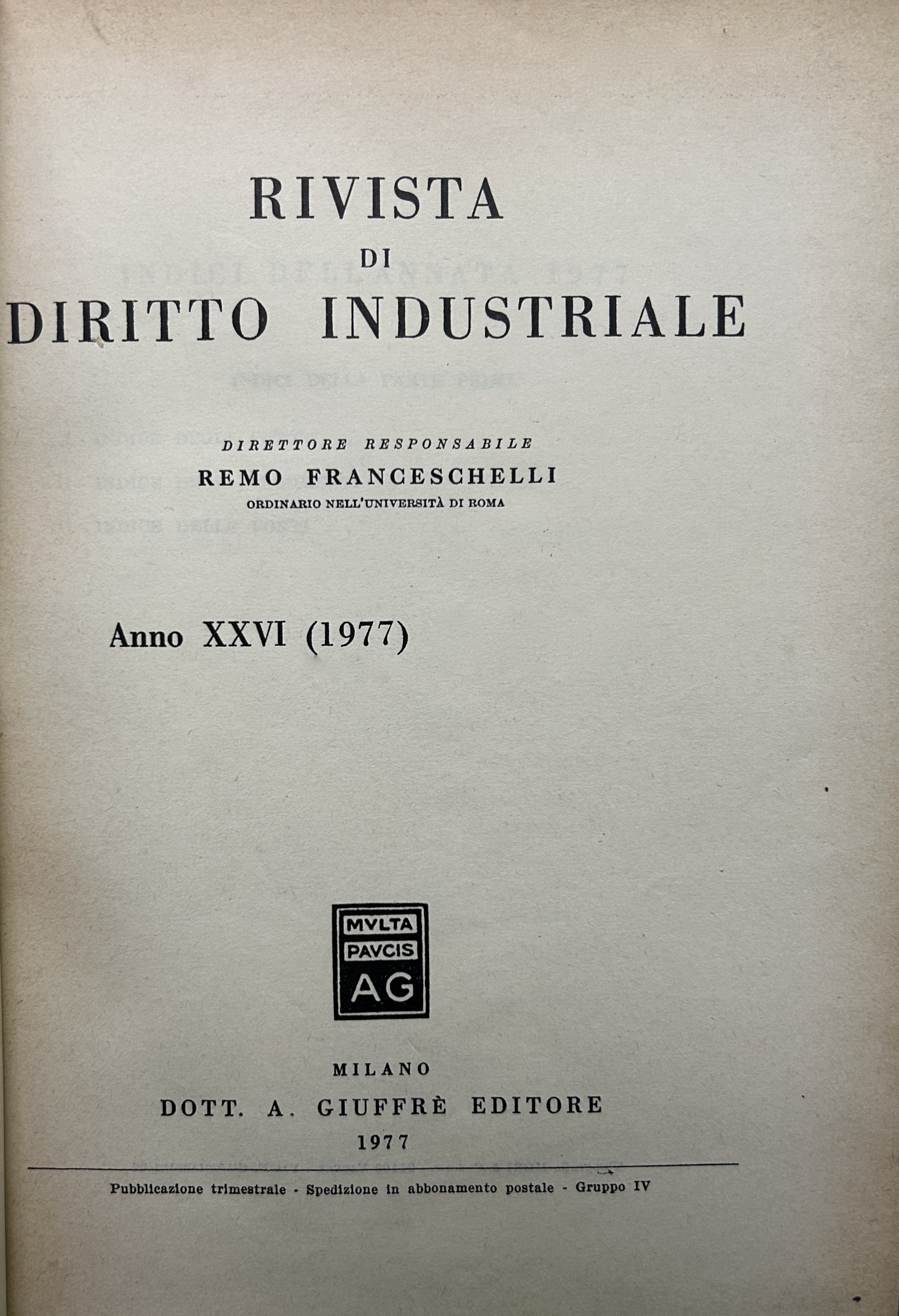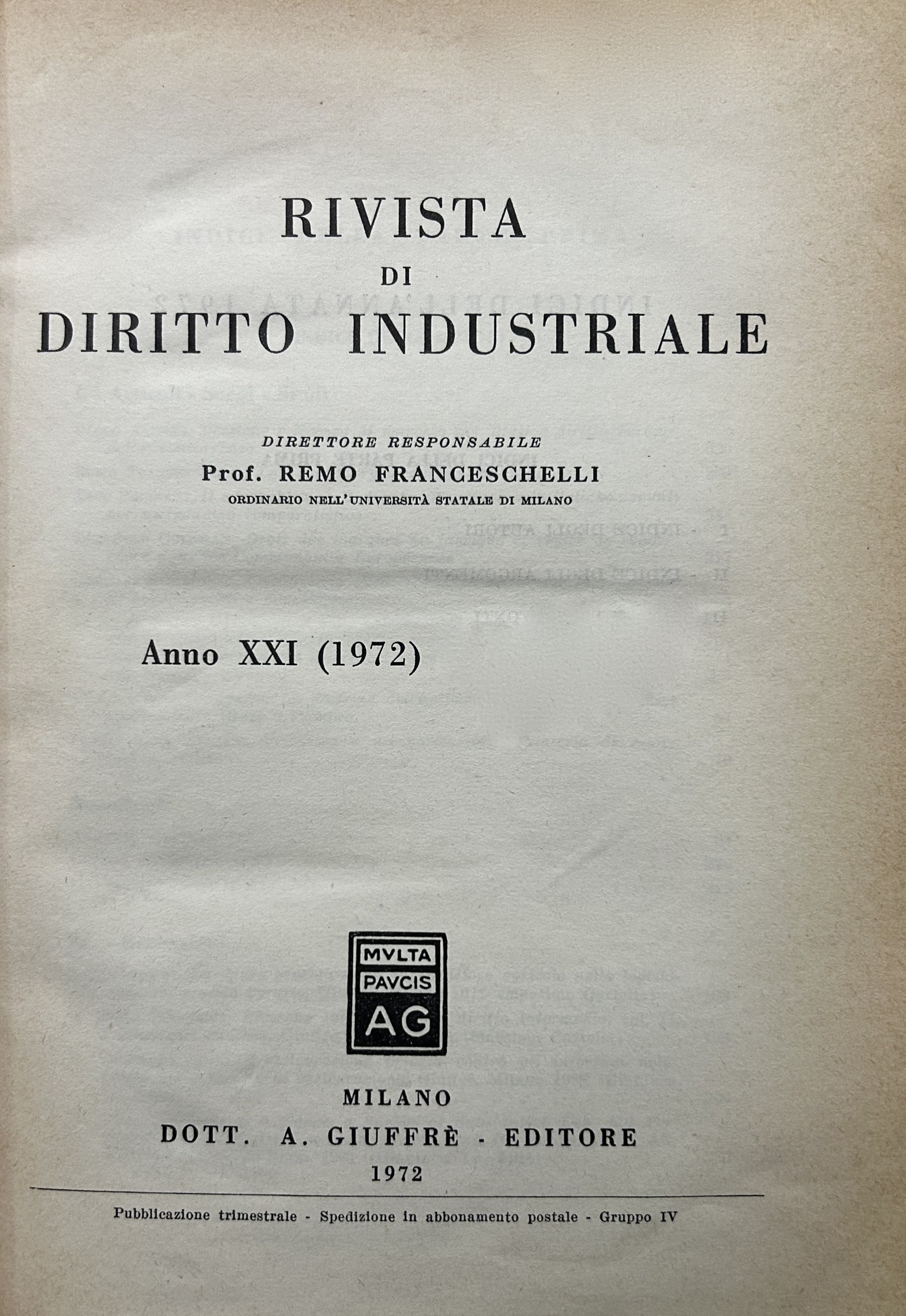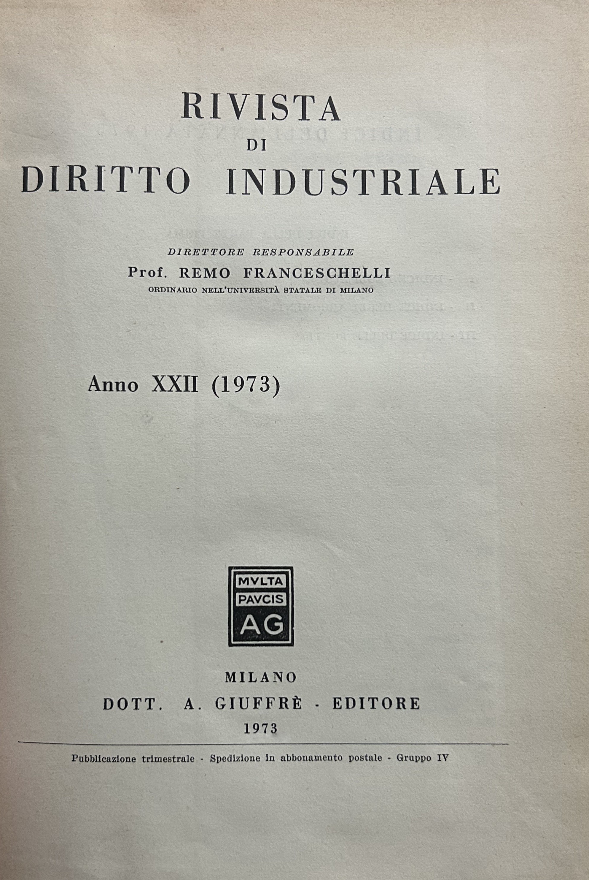 Rivista di diritto industriale. Diretta da: Ago, Auletta, Candian, Ferrara jr., Grassetti, Greco, Jaeger, La Lumia, Messineo. Responsabile: Remo Franceschelli. Da Anno XXI: 1972 a Anno: LVIII - 2009